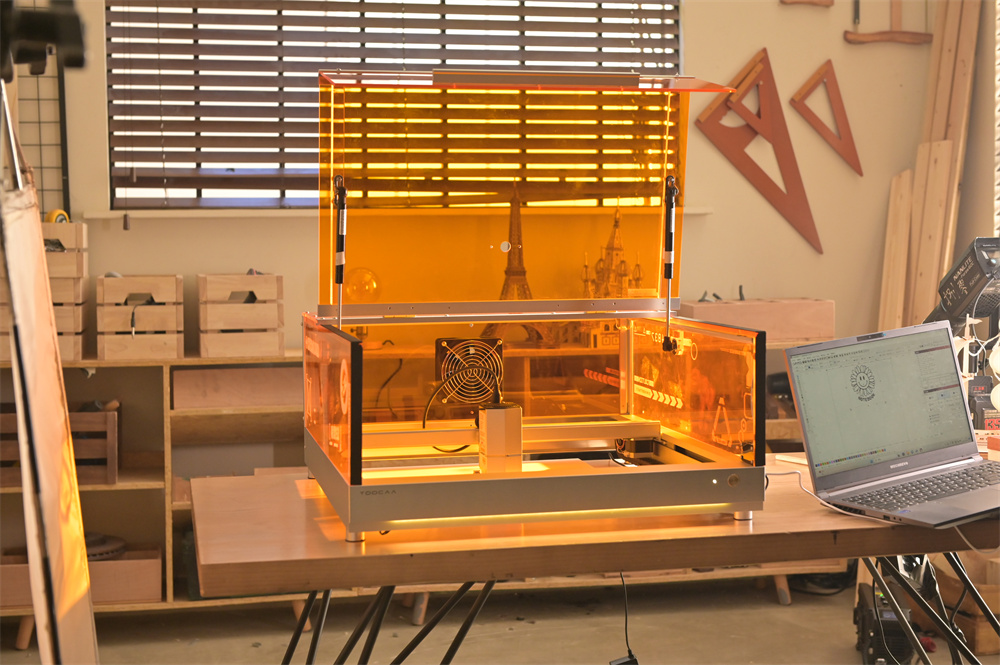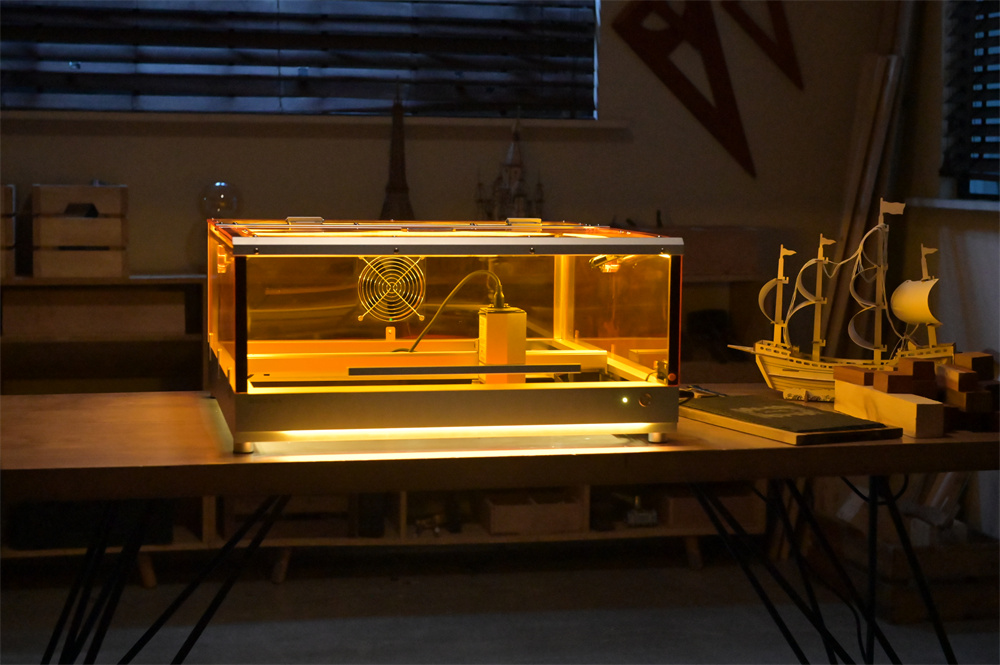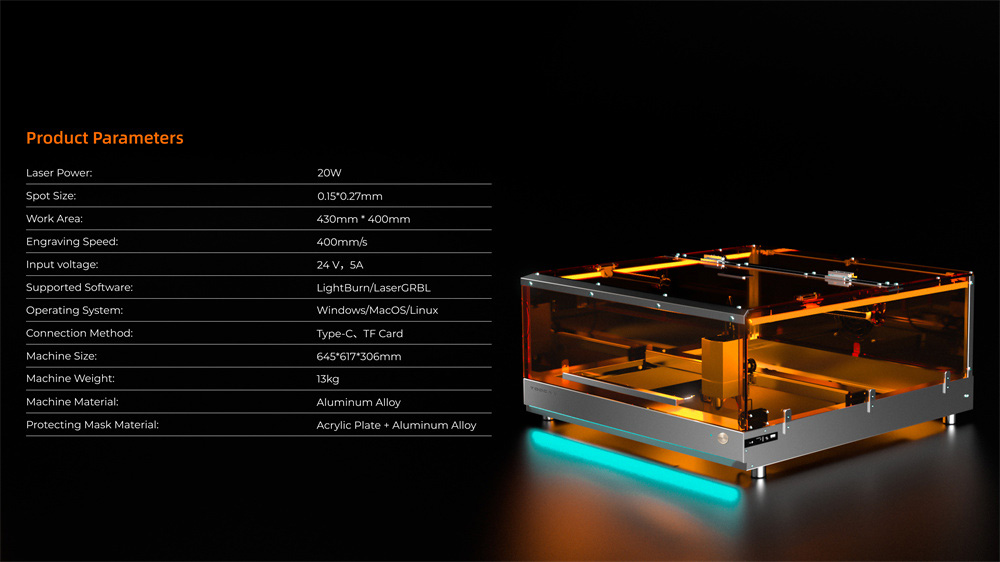 Varustettu 20W laserilla, joka käsittelee monia materiaaleja. Leikkausteho on lähellä CO2-laserlaitteita, ja laite soveltuu sekä yksityiskohtaisiin kaiverruksiin että läpileikkauksiin esimerkiksi lehmuspuuhun, akryylilevyihin ja MDF-levyihin.