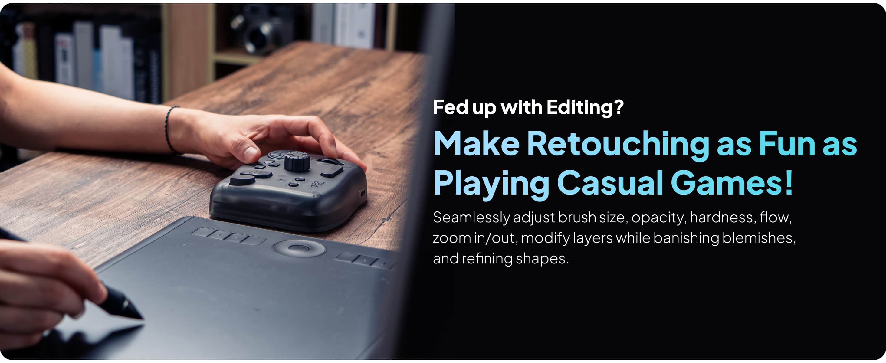 5. Piirtämisen apuri: toimii yhteen piirtopöytien ja kynänäyttöjen kanssa, yksi nuppi säätää siveltimen kokoa, virtausta, peittävyyttä ja kovuutta sekä helpottaa kankaan kiertoa, siirtoa, zoomausta ja työkalunvaihtoja.