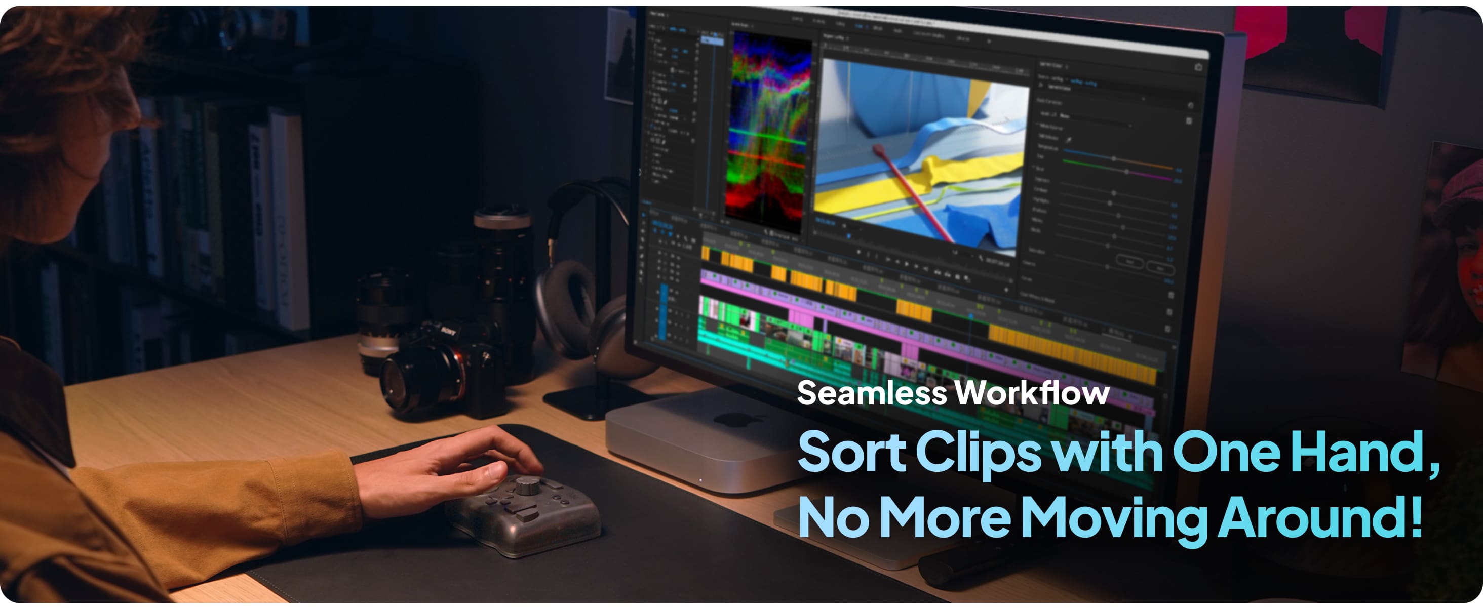 3. Videon editointi ja värimäärittely: tuntopalaute säätörullassa, napeissa ja vierityksessä antaa välittömän ja tarkan hallinnan aikajanaan, TourBox Console 5 -ohjelmiston värimäärittelypaneeli tekee säädöistä selkeitä.