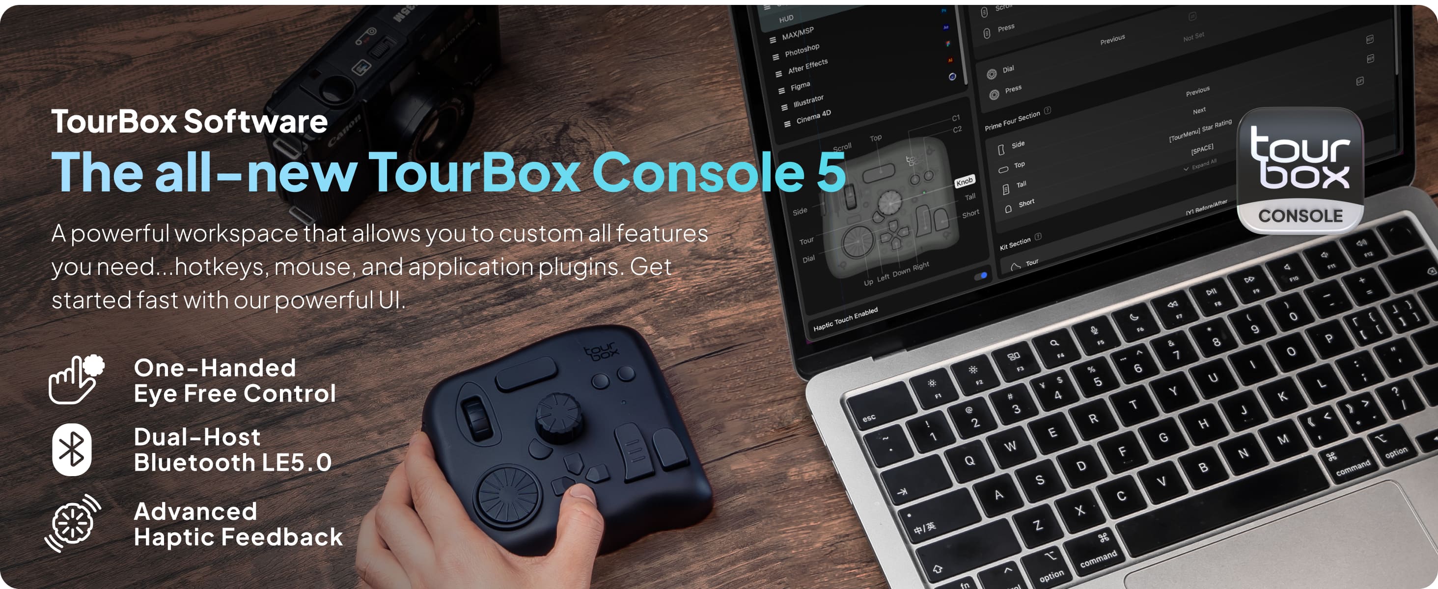 7. Päivitykset: Bluetooth-kaksoiskanava, edistynyt haptinen palaute, sormenjälkiä hylkivä pinnoite sekä uusin TourBox Console 5 OS.