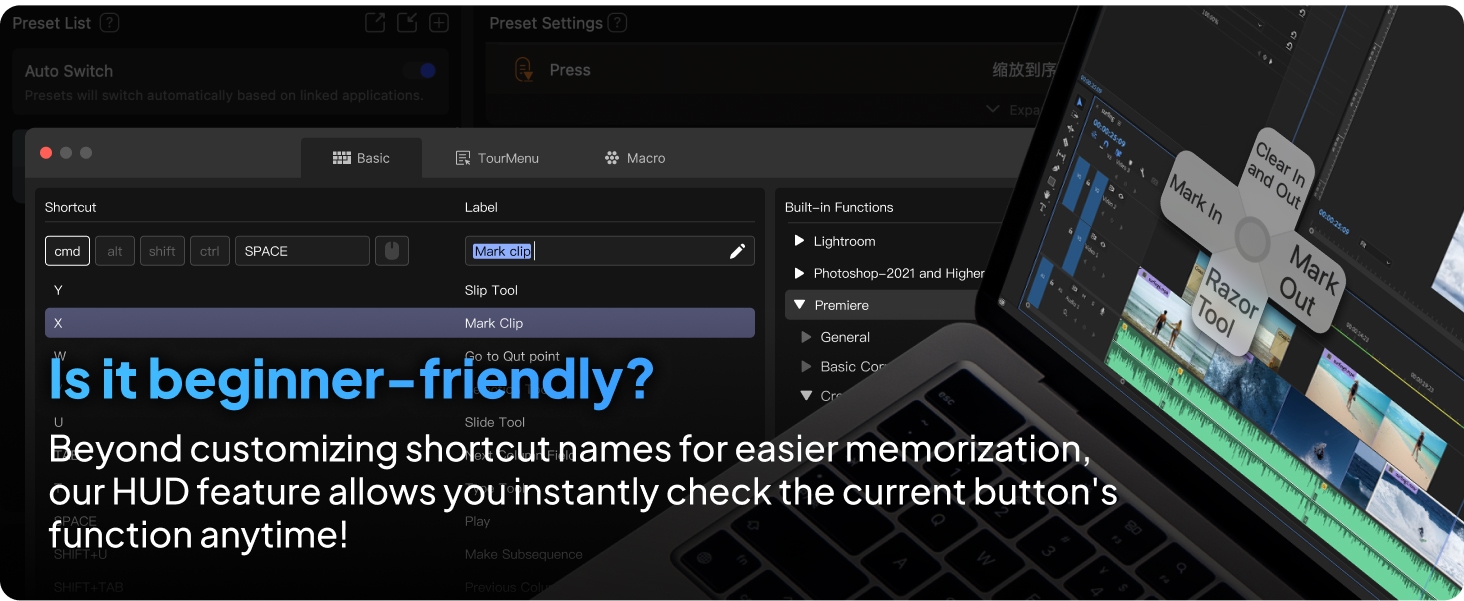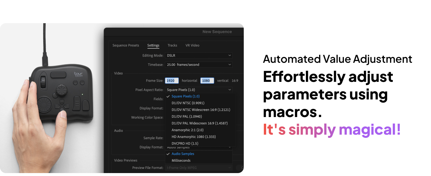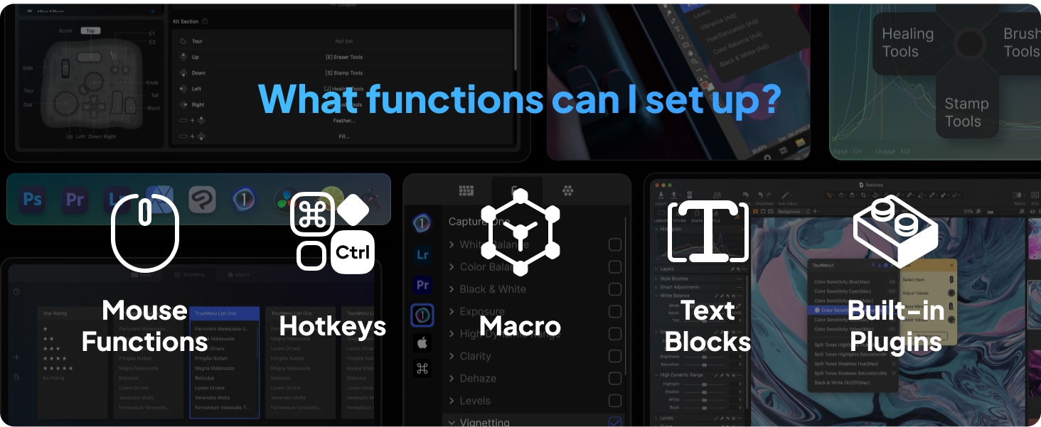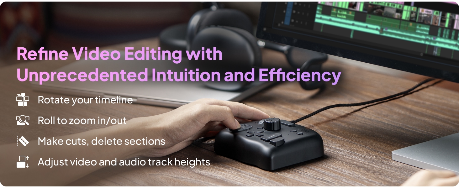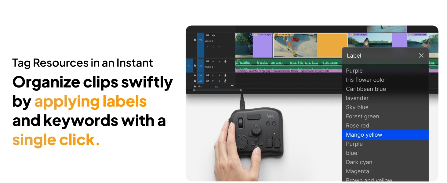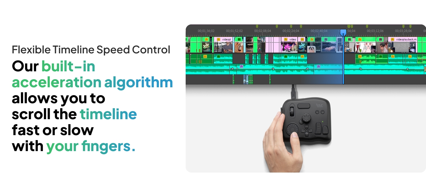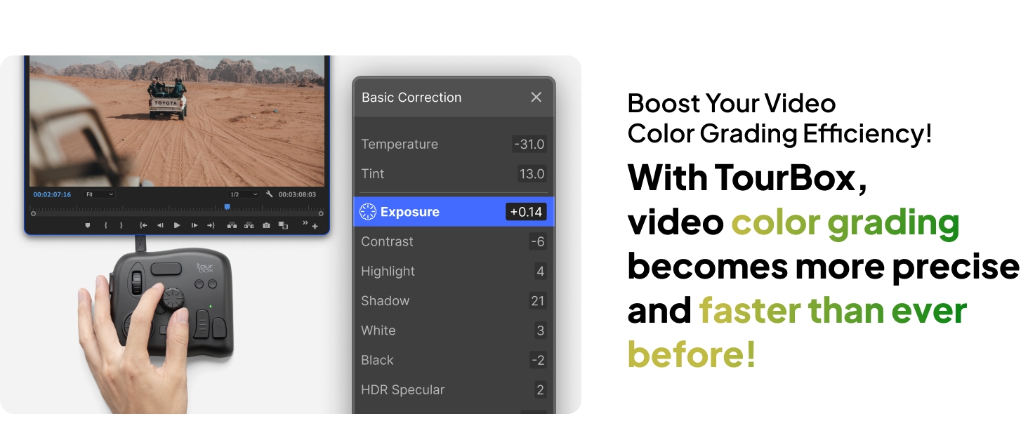 - Videoeditointi ja värimäärittely: nuppi, säätimet ja rulla on suunniteltu ammattilaisten tottumusten pohjalta. Aikajanan hallinta on nopeaa ja tarkkaa. TourBox Console 5 -järjestelmän värimäärittelypaneeli näyttää yleiset parametrit selkeästi.