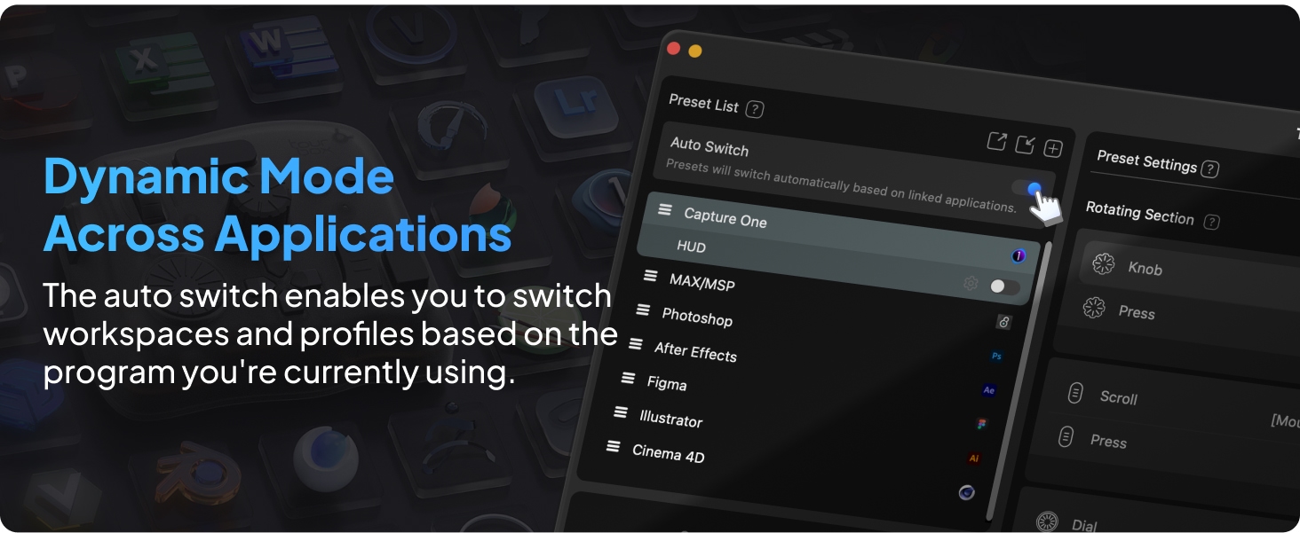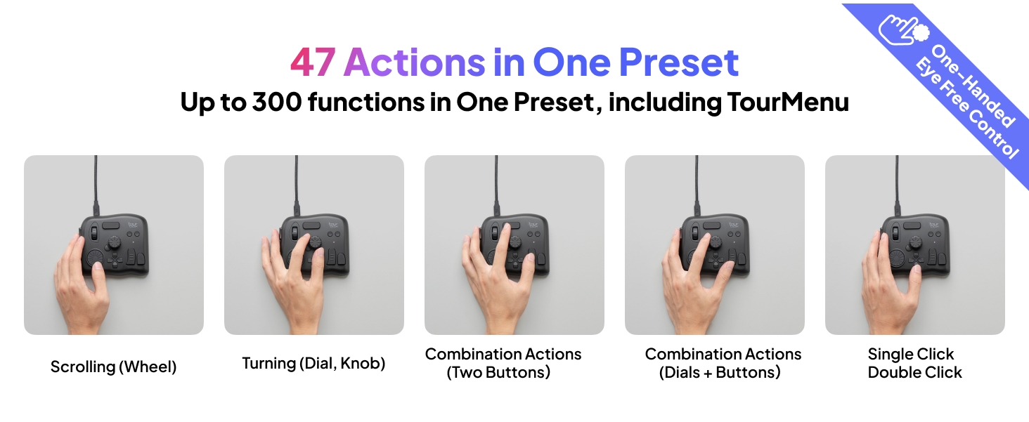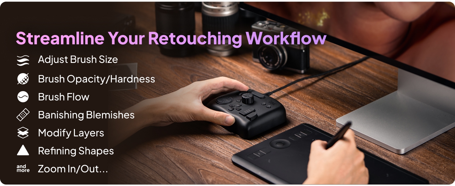 - Piirtämisen avustaja: toimii erinomaisesti yhdessä piirtopöytien ja kynänäyttöjen kanssa. Yksi nuppi hallitsee siveltimen parametreja (koko, virtaus, peittävyys, kovuus), ja helpottaa kankaan kiertoa, liikuttelua, zoomausta ja työkalujen vaihtoa.