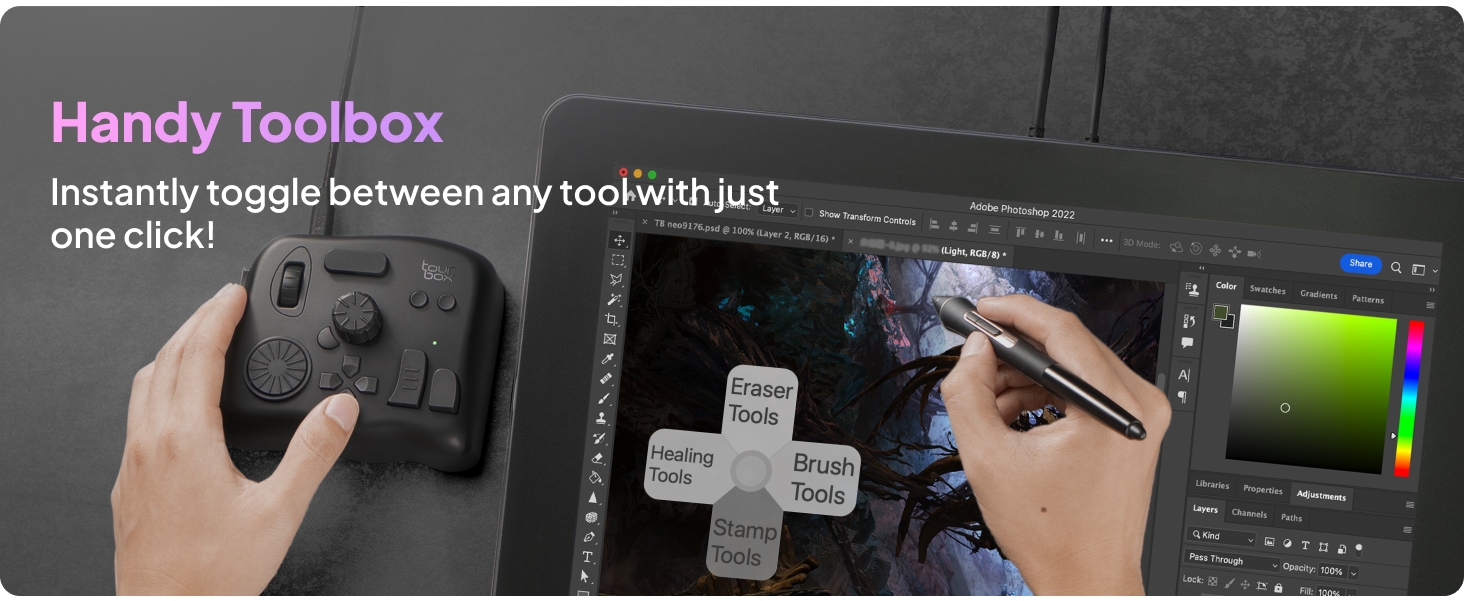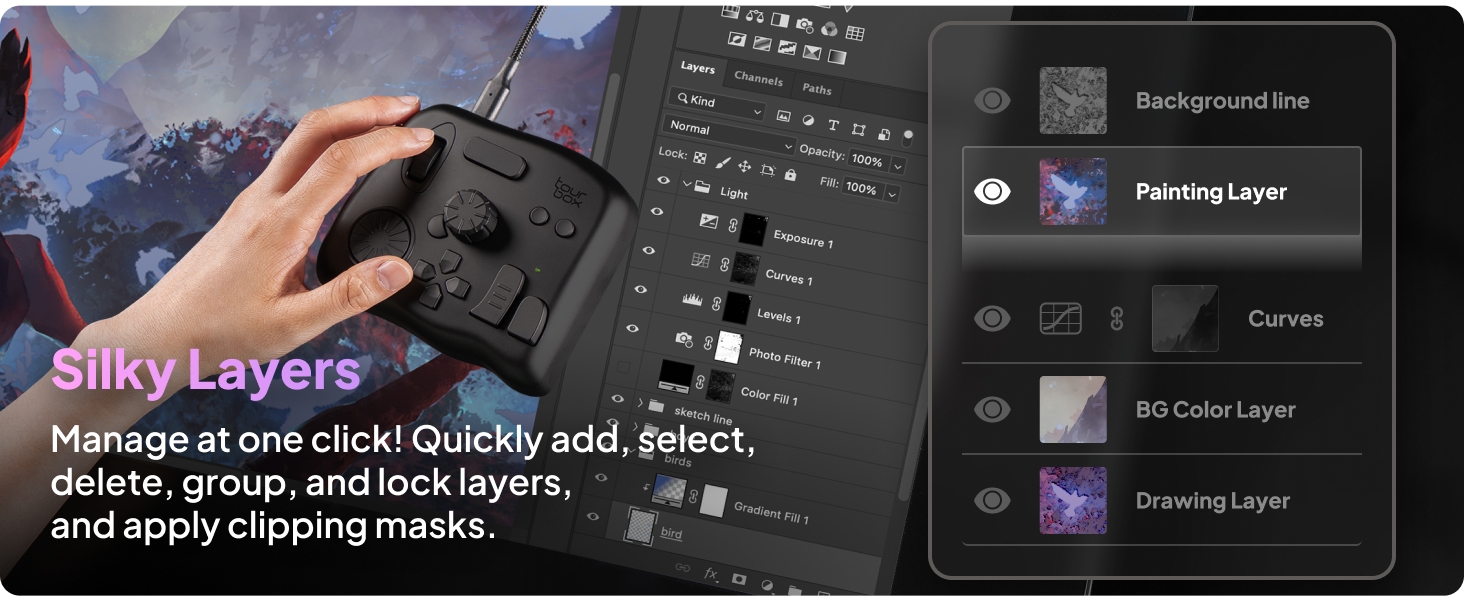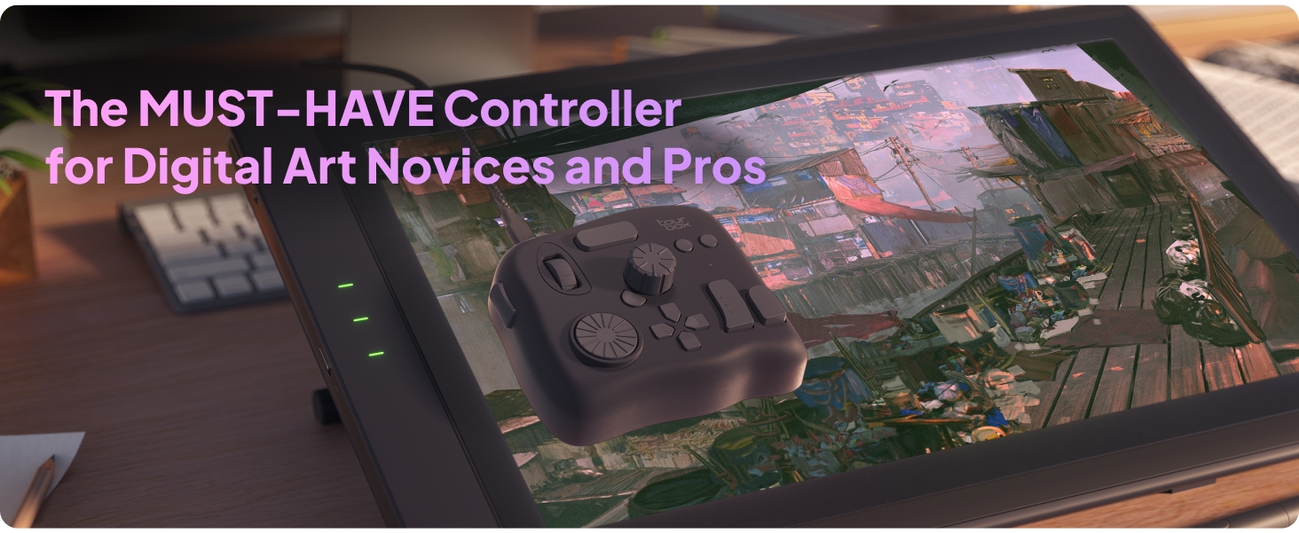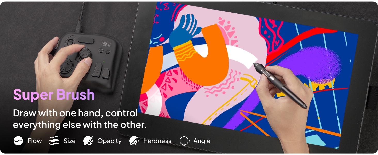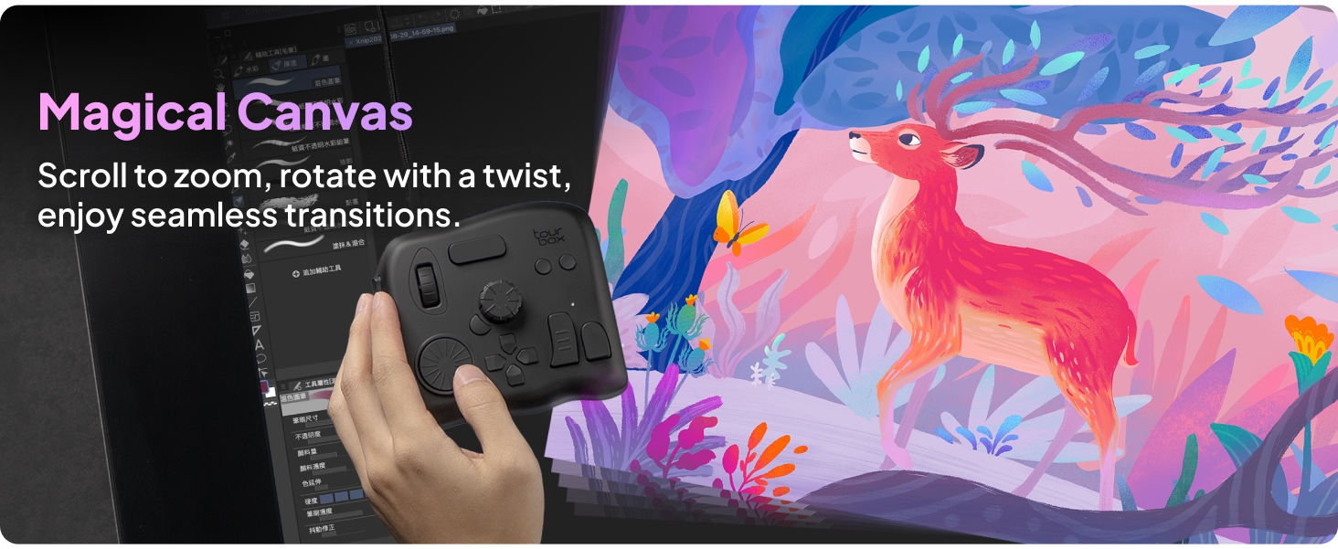 TourBox NEO on kompakti luovan työn ohjain, joka nopeuttaa piirtämistä, valokuvien jälkikäsittelyä ja videoeditointia. Ergonominen nuppi-, rulla- ja painikeyhdistelmä mahdollistaa sujuvan työskentelyn yhdellä kädellä eri ohjelmistoissa.