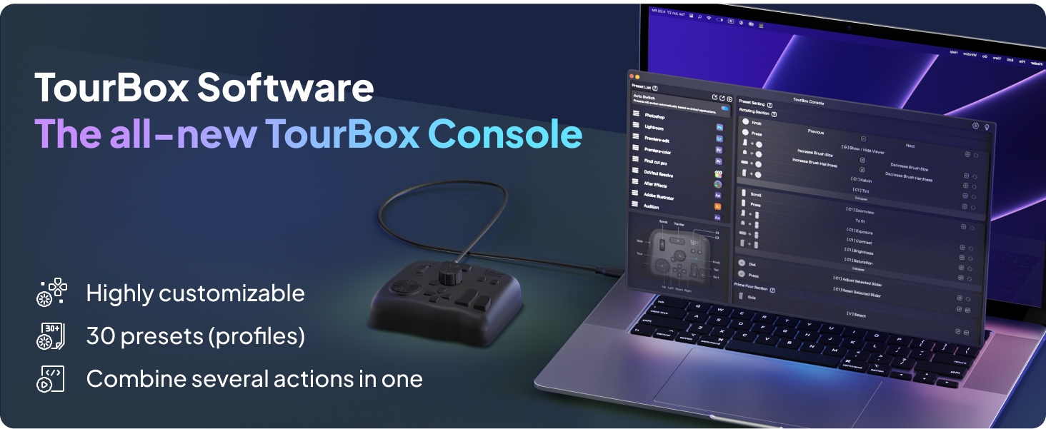 TourBox NEO mukautettava ohjain valokuvien ja videoiden editointiin sekä värimäärittelyyn Macille ja Windowsille