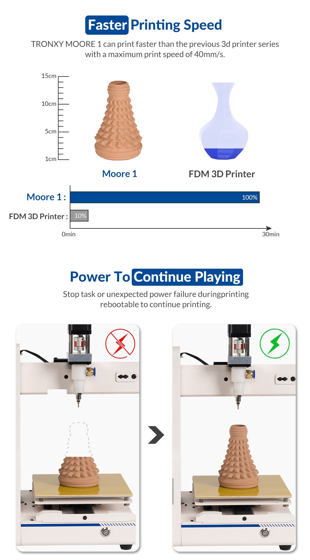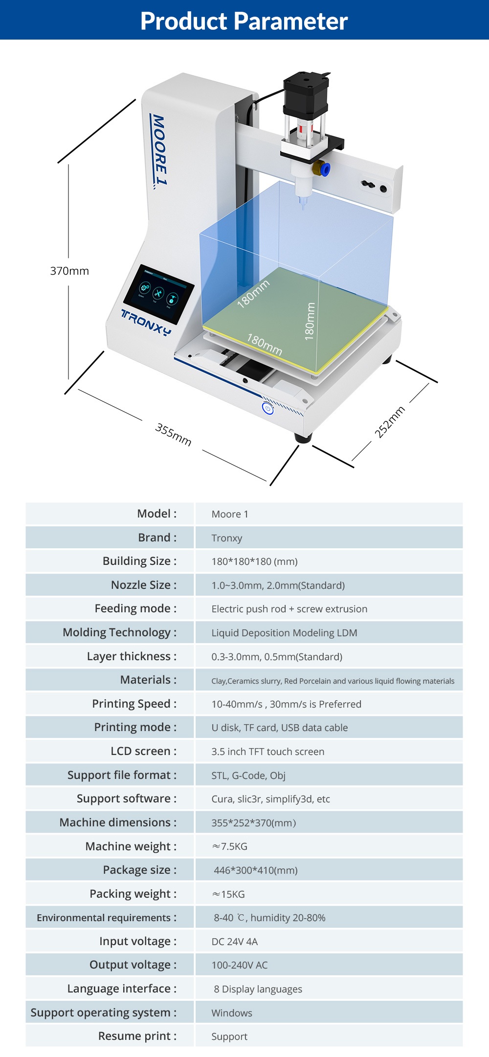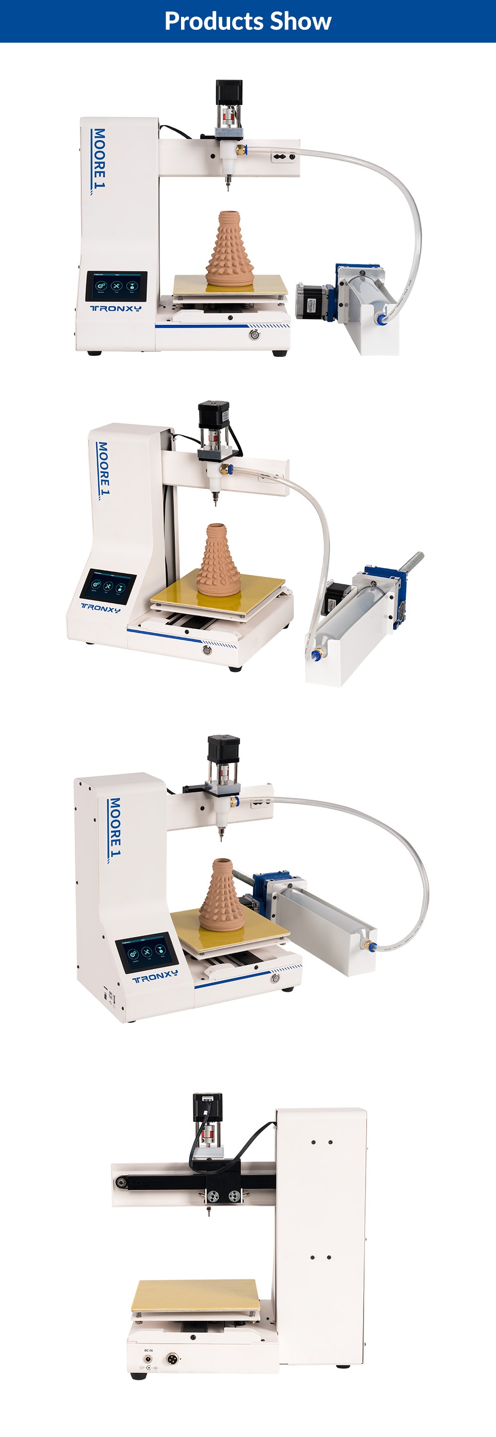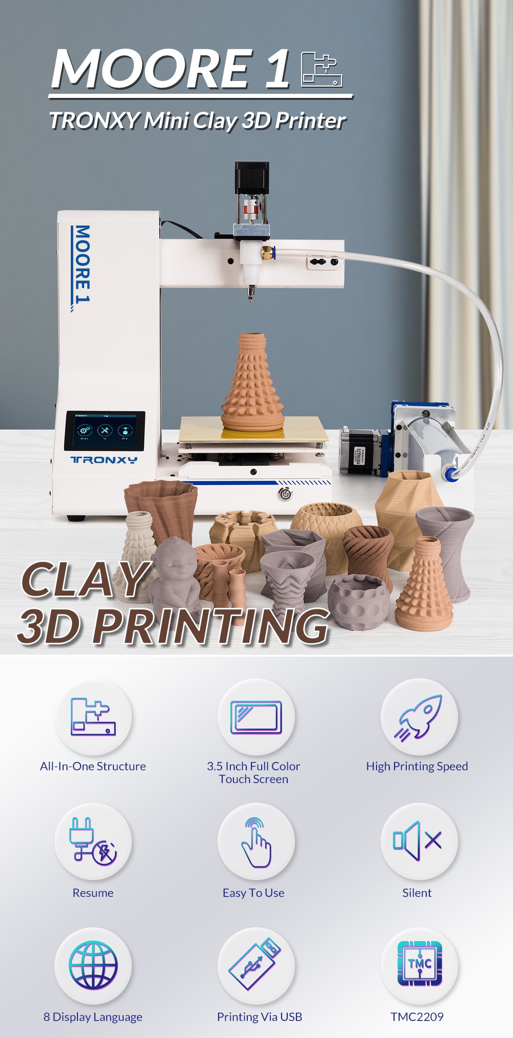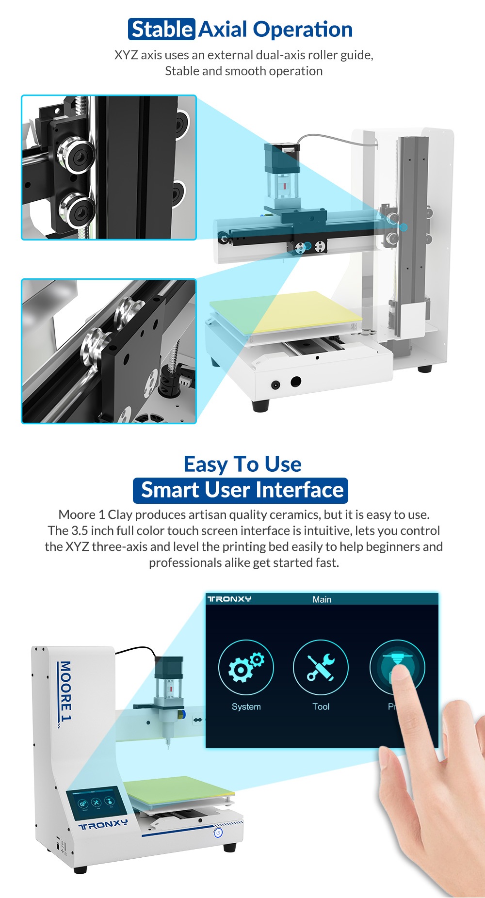 Tronxy Moore 1 on LDM-tekniikkaan perustuva savi- ja keramiikkatulostin kompaktilla rakenteella ja helppokäyttöisellä 3.5-tuumaisella kosketusnäytöllä. Se tukee useita materiaaleja, yleisiä viipalointiohjelmia ja tiedostomuotoja sekä tarjoaa vakaan syötön sähköisellä työntötangolla ja ruuvipuristuksella.