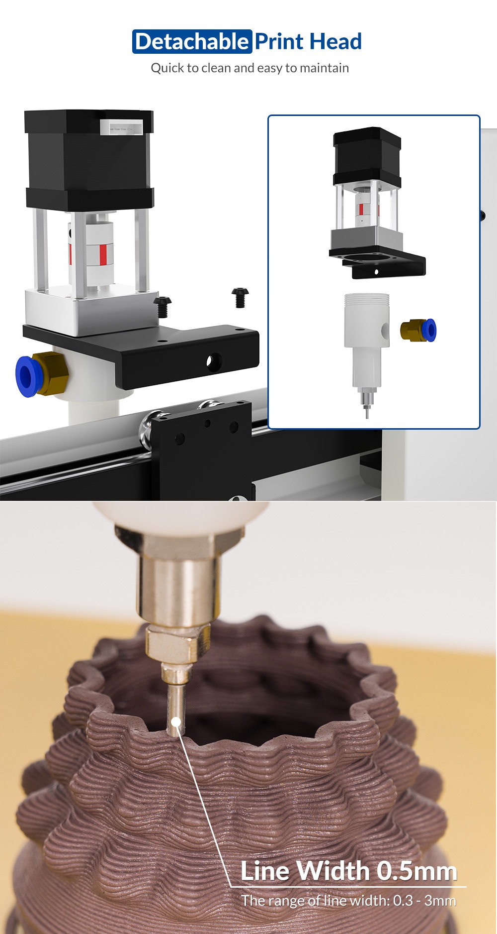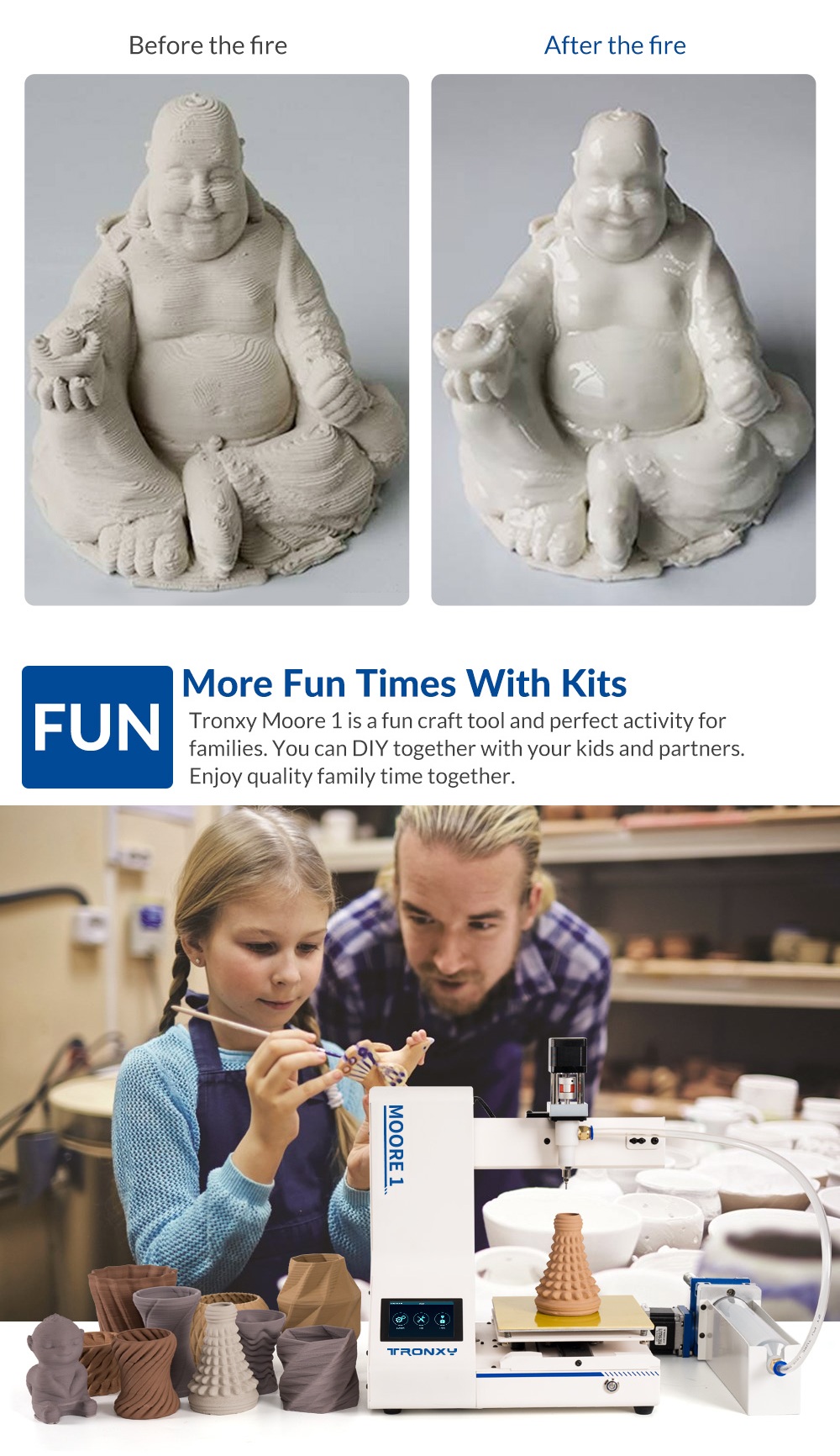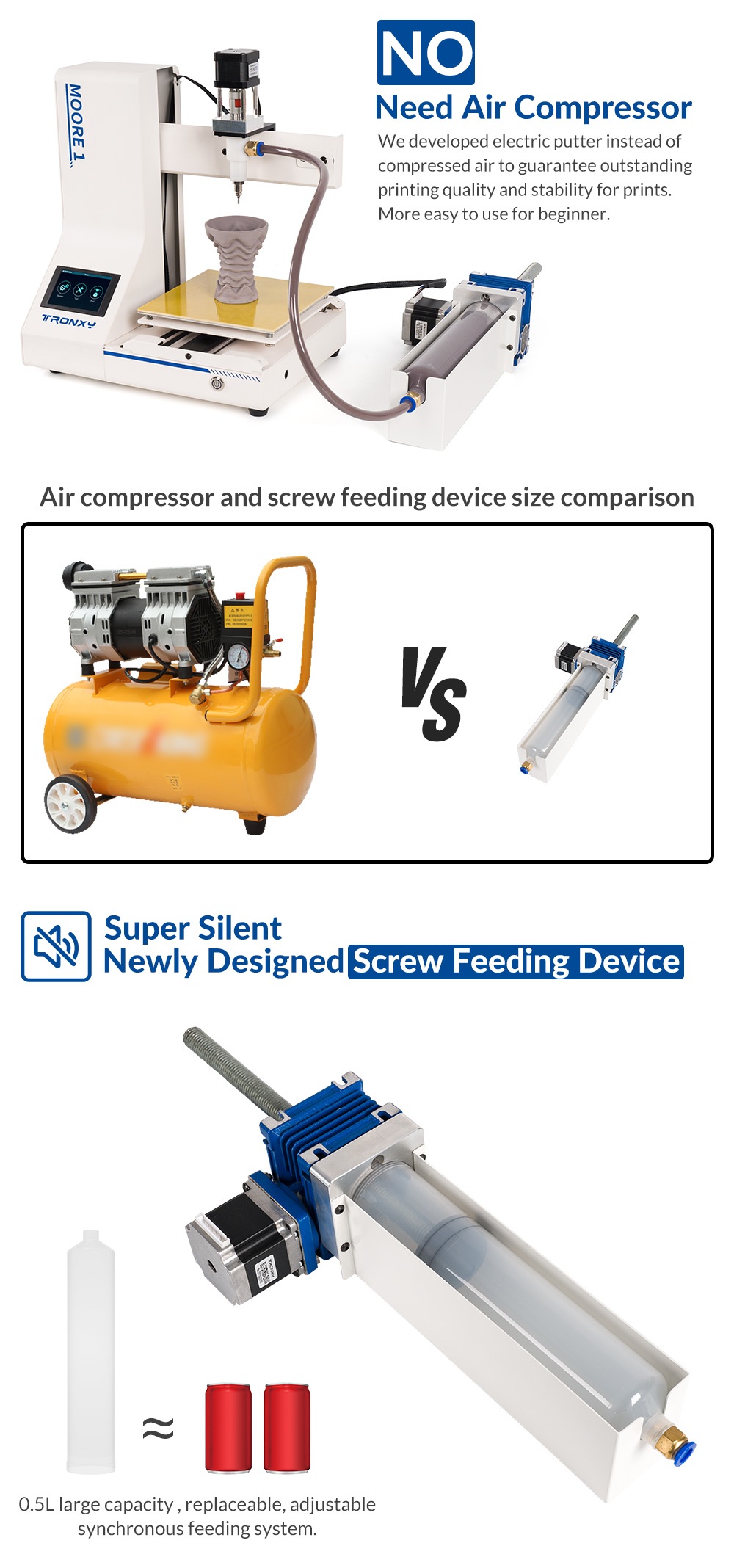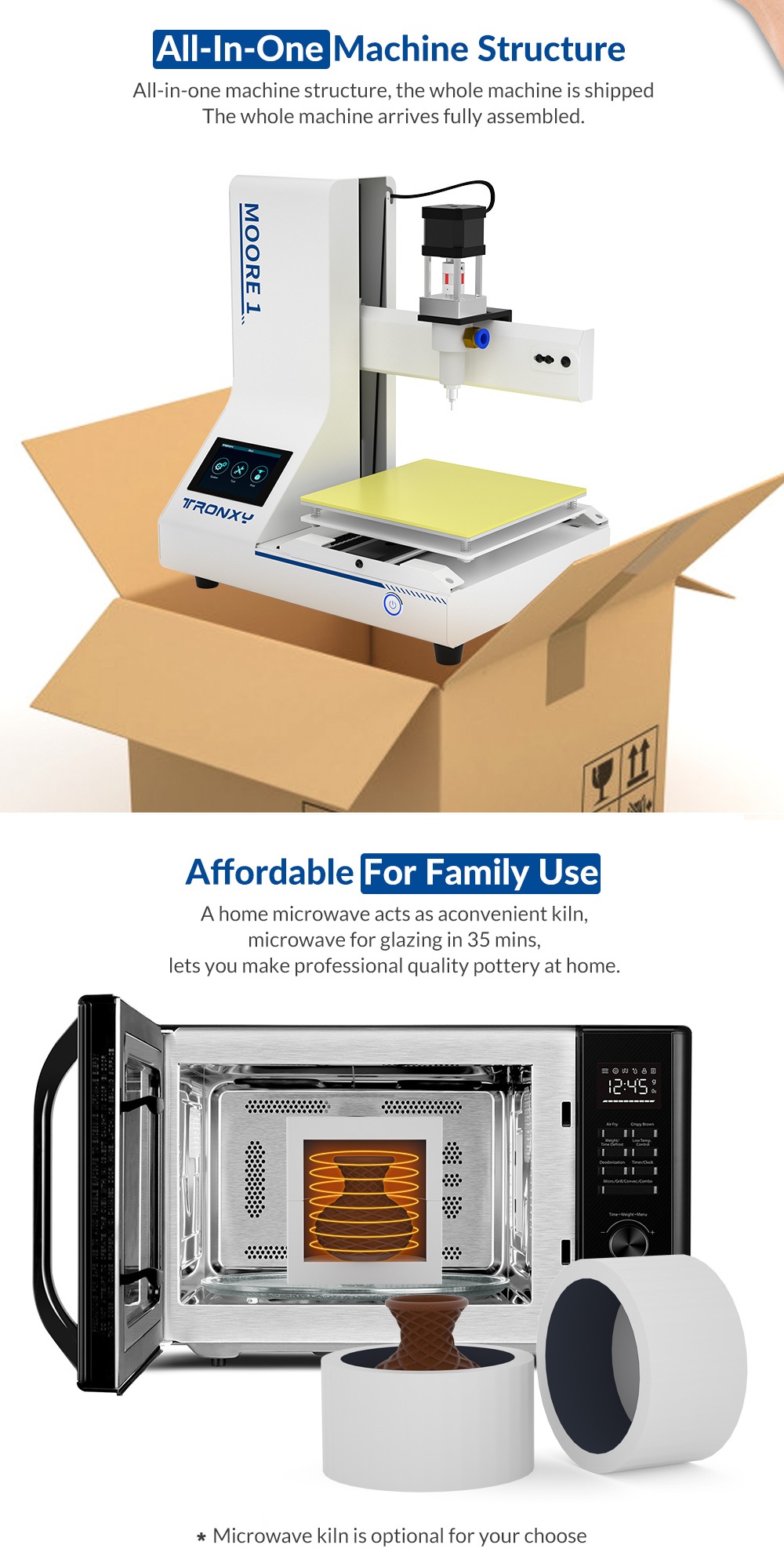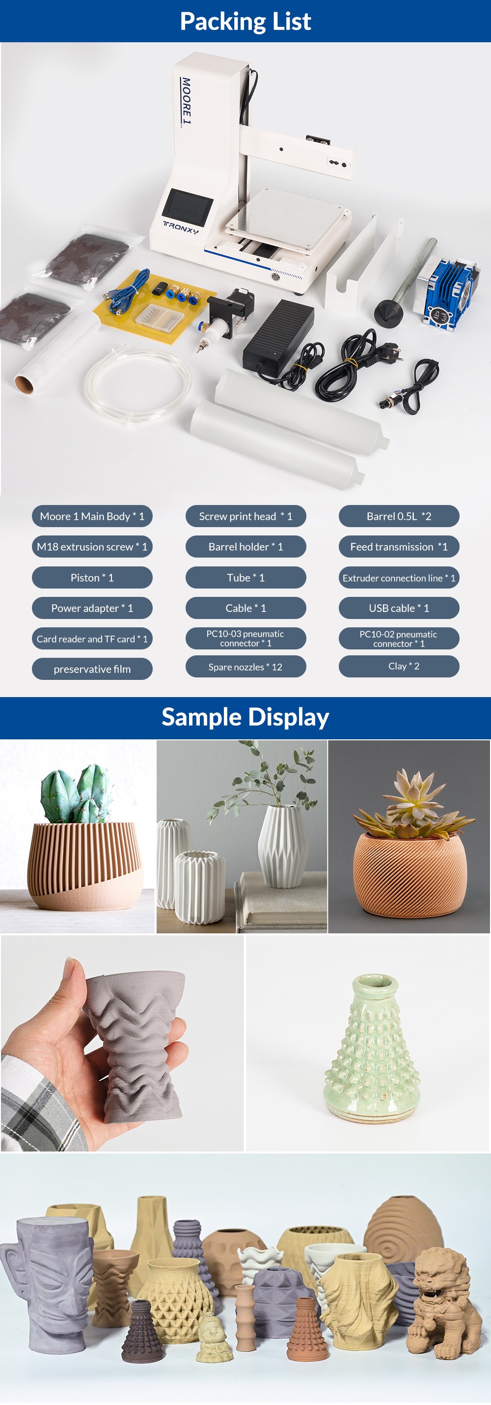 Tronxy Moore 1 on LDM-tekniikkaan perustuva savi- ja keramiikkatulostin kompaktilla rakenteella ja helppokäyttöisellä 3.5-tuumaisella kosketusnäytöllä. Se tukee useita materiaaleja, yleisiä viipalointiohjelmia ja tiedostomuotoja sekä tarjoaa vakaan syötön sähköisellä työntötangolla ja ruuvipuristuksella.