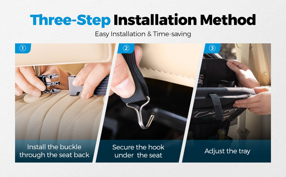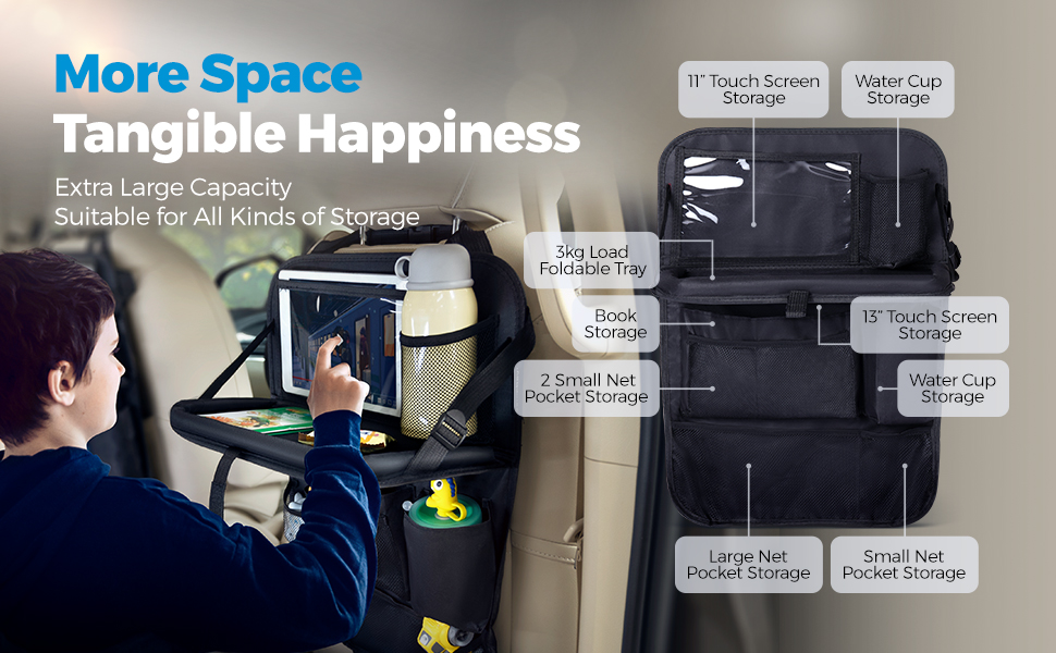 Tämä kätevä auton istuimen selkänojan järjestelijä lisää säilytystilaa ja auttaa pitämään matkustamon siistinä. Yläosassa oleva tarjotin pitää välipalat, juomat ja pienet tarvikkeet napakasti paikoillaan pitkienkin ajomatkojen aikana. Kestävästä Oxford-kankaasta valmistettu pussi on helppo kiinnittää ja sopii useimpiin autoihin, katumaastureihin, kuorma-autoihin ja farmareihin.