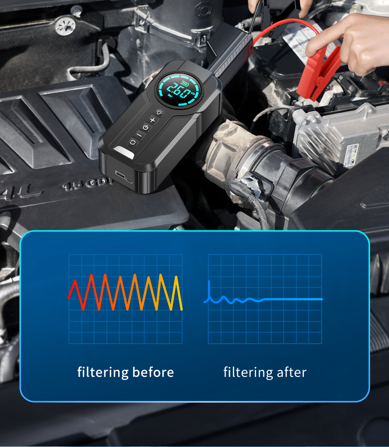 Monipuolinen ja kompakti apulaite ajoneuvoon ja vapaa-aikaan: TUERBB T-JA01 yhdistää 4 in 1 Jump Starter with Air Compressor -toiminnot. Laitteella käynnistät akun tyhjentyneen auton ja täytät renkaat nopeasti, ja se toimii myös varavirtalähteenä arjen laitteille.