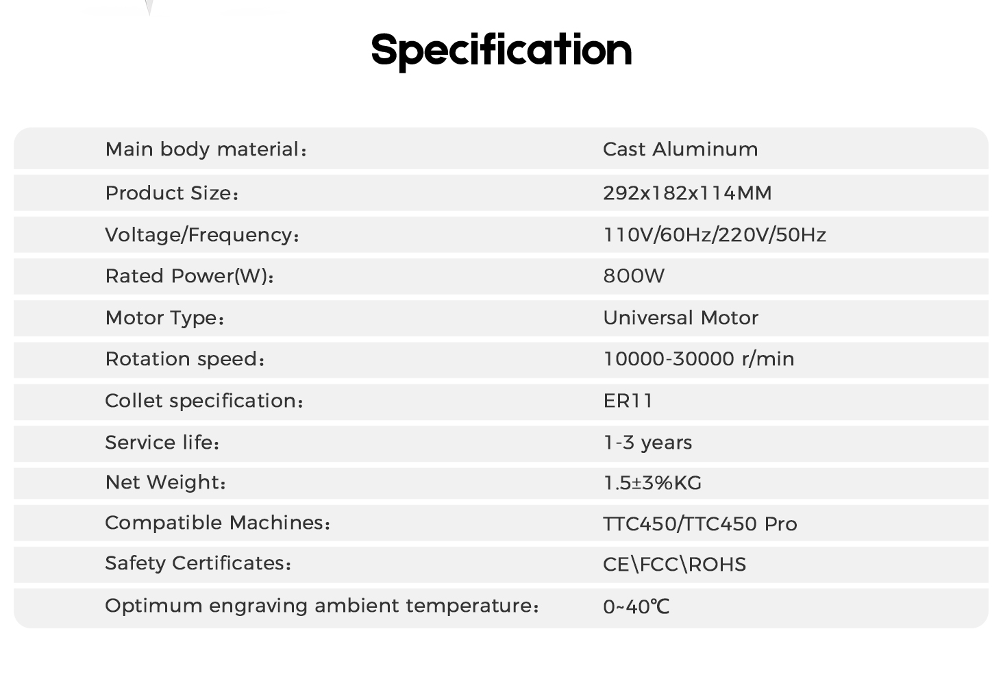 - 800W suurtehomoottori: Vankka 800W moottori varmistaa tasaisen suorituskyvyn tarkkaan metallinleikkaukseen ja kaiverrukseen.