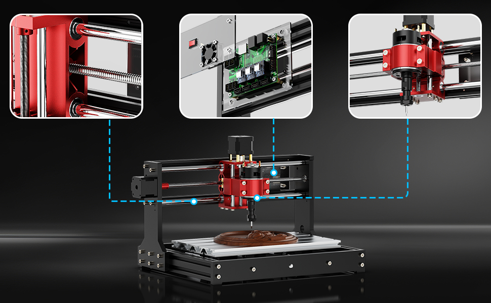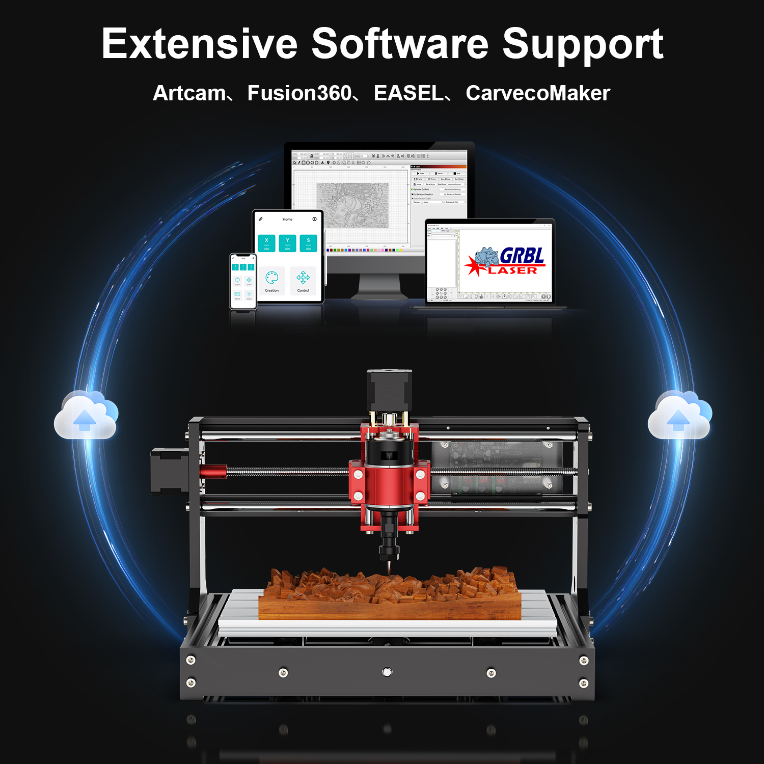 Monipuolinen tee se itse -CNC-jyrsin kokoonpanopakettina harrastajille, opiskeluun ja tutkimukseen. Vankka alumiinirunko, GRBL-ohjaus ja mahdollisuus lisätä lasermoduuli luovuuden laajentamiseksi pehmeille materiaaleille.