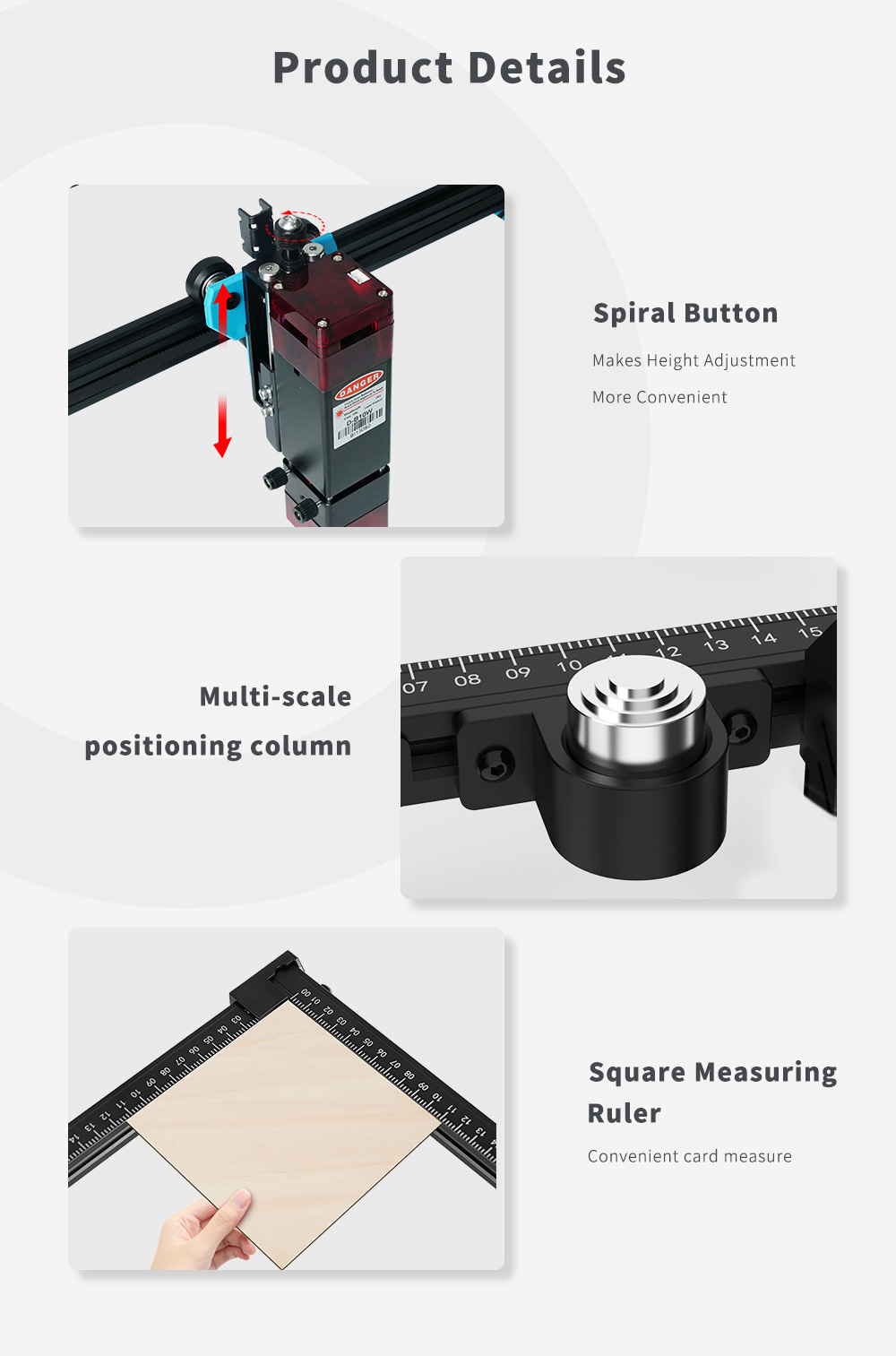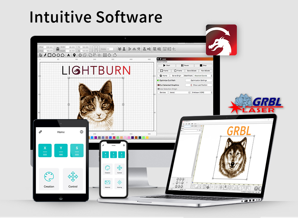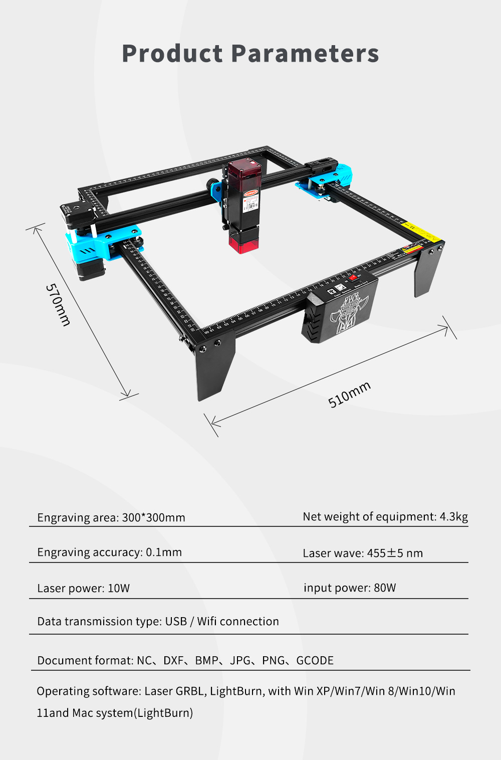 6. Laaja ohjelmistoyhteensopivuus: yhteensopiva Laserbox GRBL -ohjelmiston ja LightBurnin kanssa. TWOTREES TTS 10 toimii Windows / Apple PC / Android / iOS -laitteilla. Tuetut tiedostomuodot: SVG / DXF / JPG / JPEG / PNG / BMP / TIF / CR2, jne.