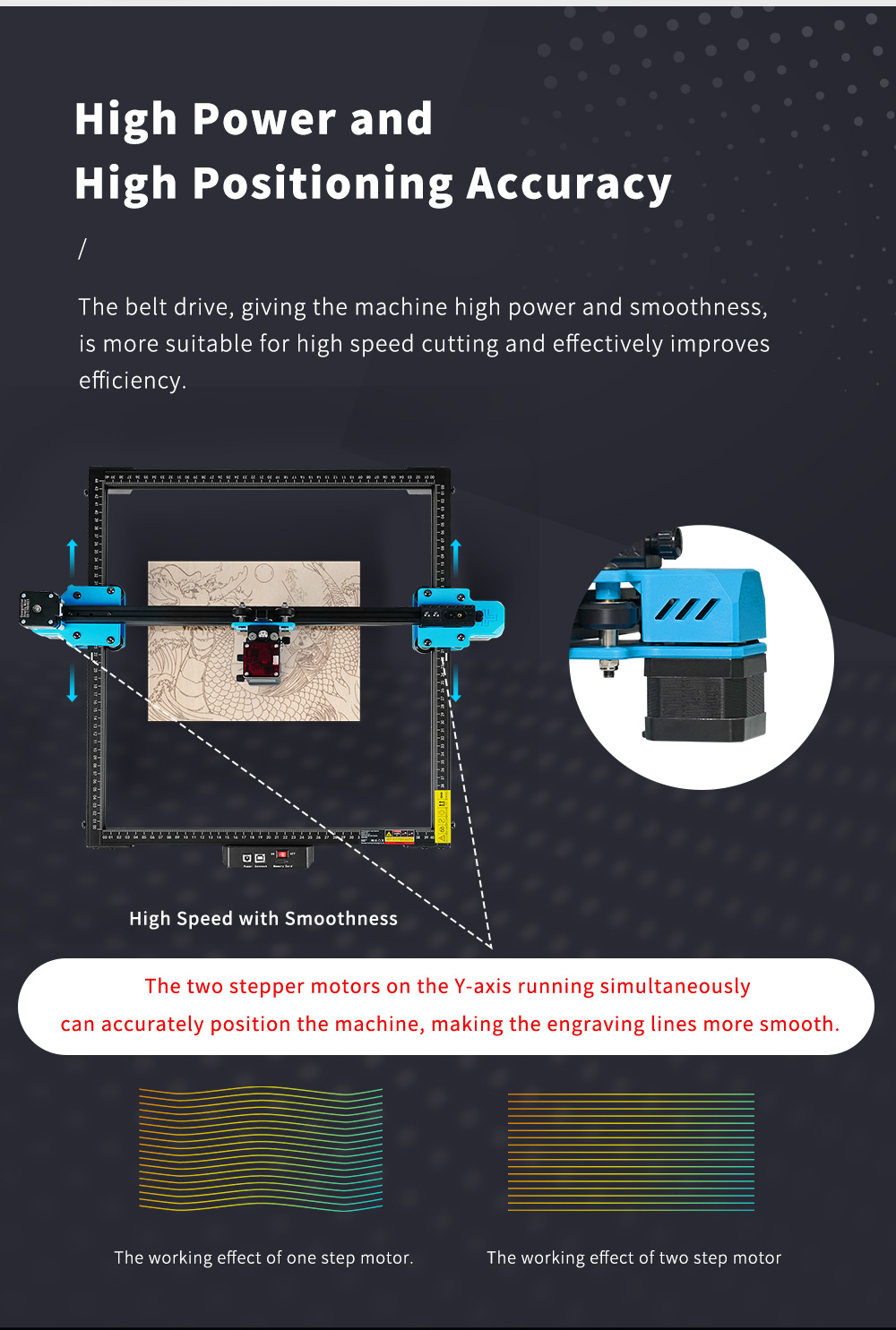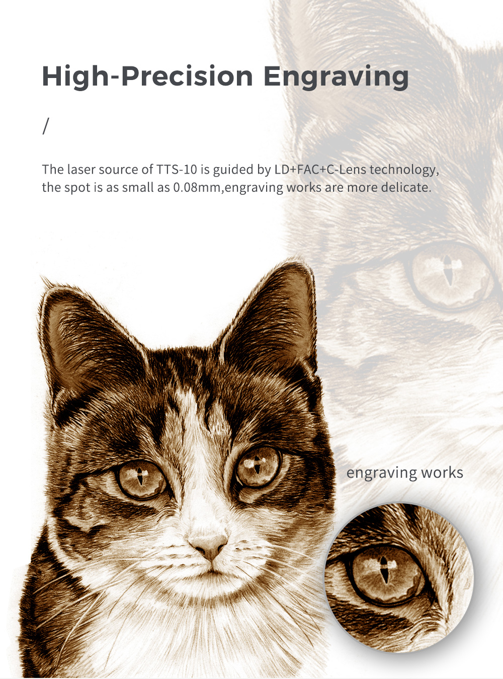 1. Uuden sukupolven lasertekniikka: koneen teho 60W, todellinen 10W lähtötehon lasermoduuli.2. Tehokas leikkaus ja nopea kaiverrus: TWOTREES TTS 10 leikkaa siististi 10mm paksun lehmuksen ja 5mm paksun tumman akryylin yhdellä ajolla. Kaiverrusnopeus jopa 11000mm/min, jopa 2 kertaa nopeampi kuin monissa vastaavissa laitteissa.