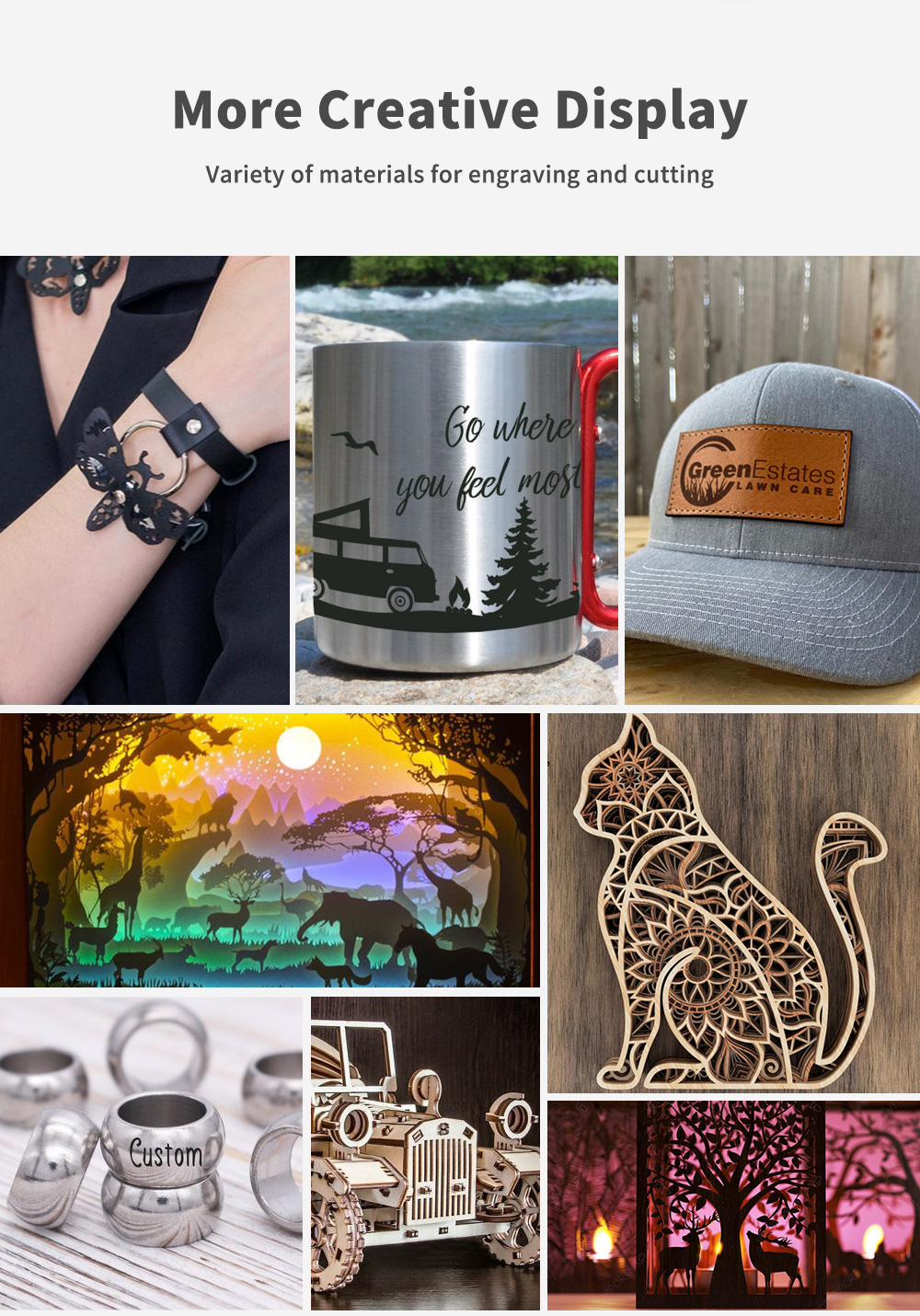 9. Laajat materiaalimahdollisuudet: paperi, bambu, puu, nahka, PCB-levy, alumiinioksidi, metalli, lehmus, lasi ja paljon muuta.