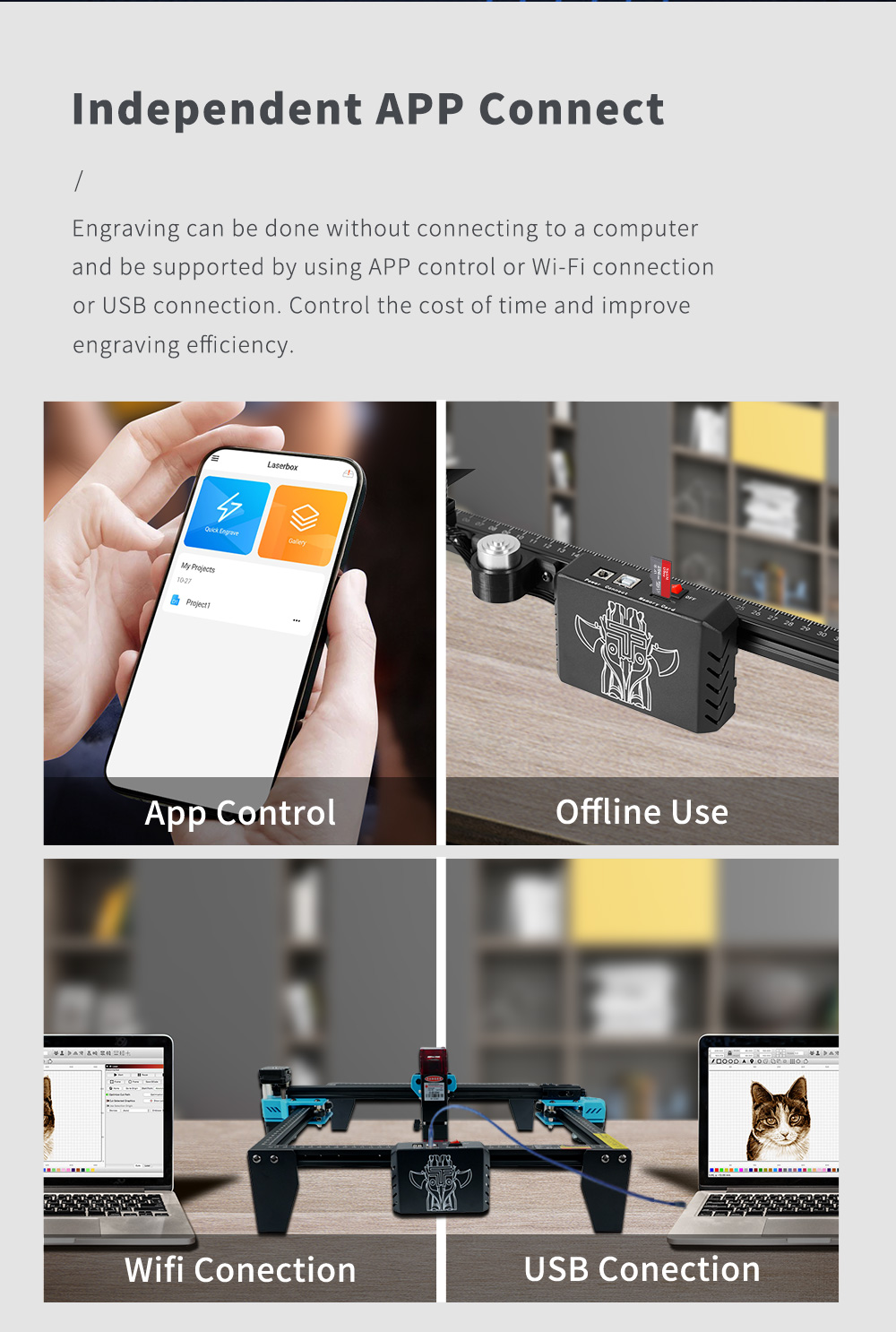 Tietokone: LaserGRBL, LightBurn, tukee Win XP / Win 7 / Win 8 / XP / Win 10 -järjestelmiä ja Apple Mobiili: sovellus (ATOMSTACK), tukee iOS, Android. |