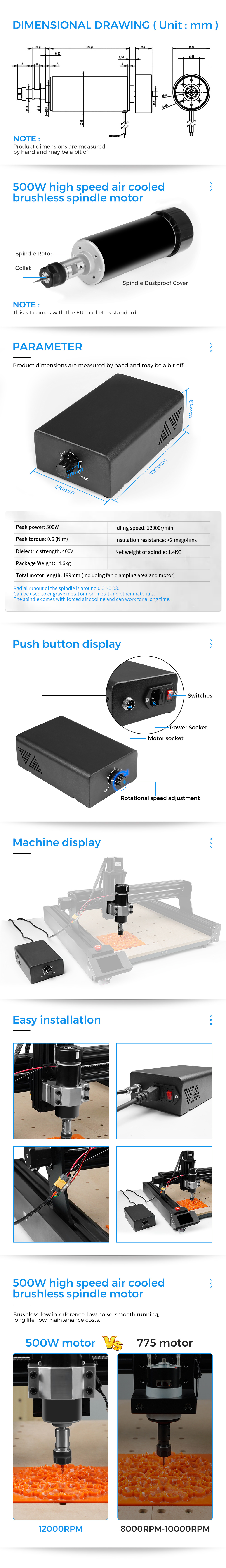 Tämä paketti sisältää 500W ilmalla jäähdytetyn karamoottorin ER11-istukalla, 52 mm kiinnikkeet sekä virtalähteen ja kierrosnopeuden säätimen. Sopii tarkkaan työstöön CNC-kaiverruskoneissa ja kevyissä poraustöissä. Ilmajäähdytys auttaa pitämään lämpötilan hallinnassa jatkuvassa käytössä.