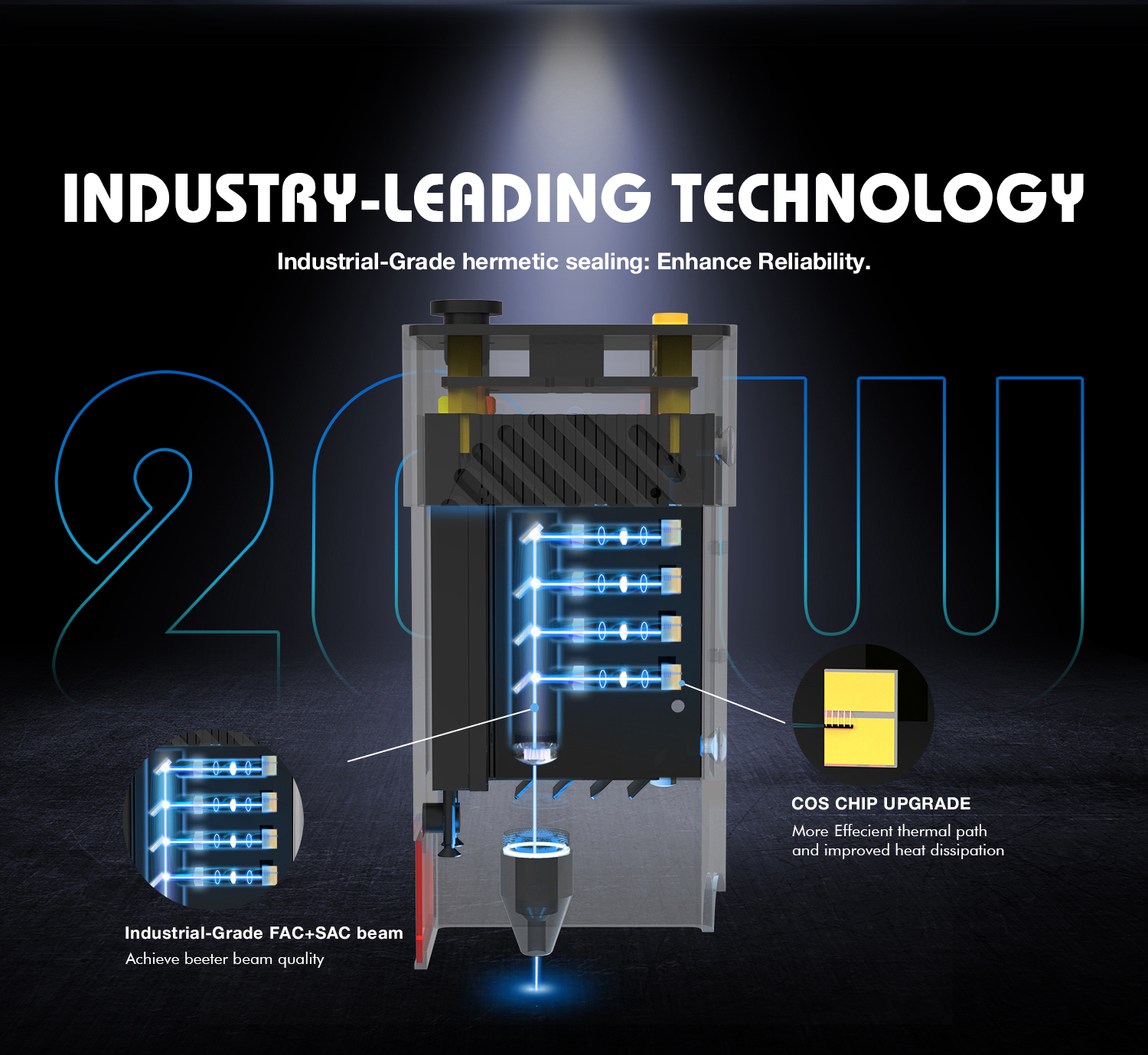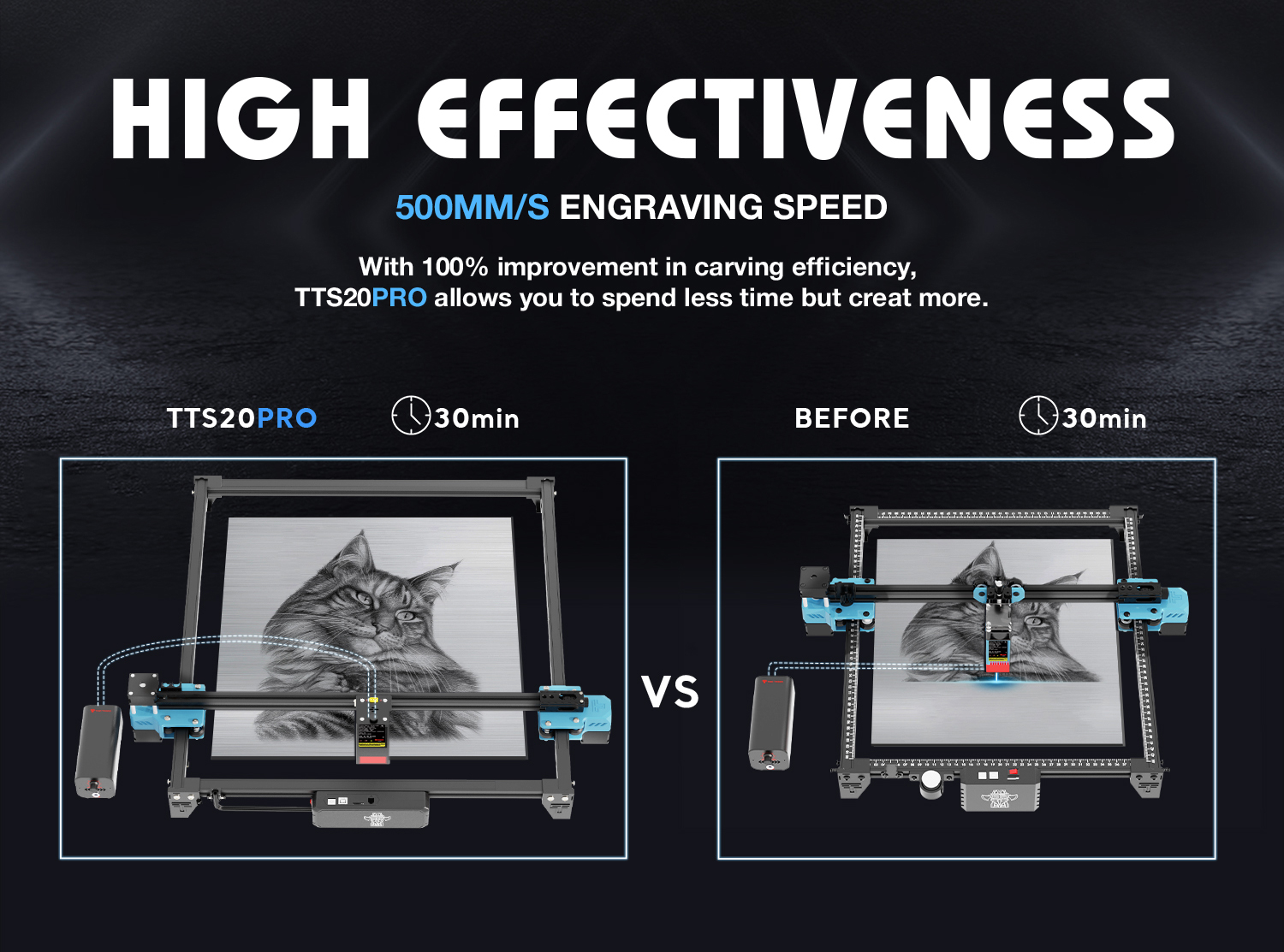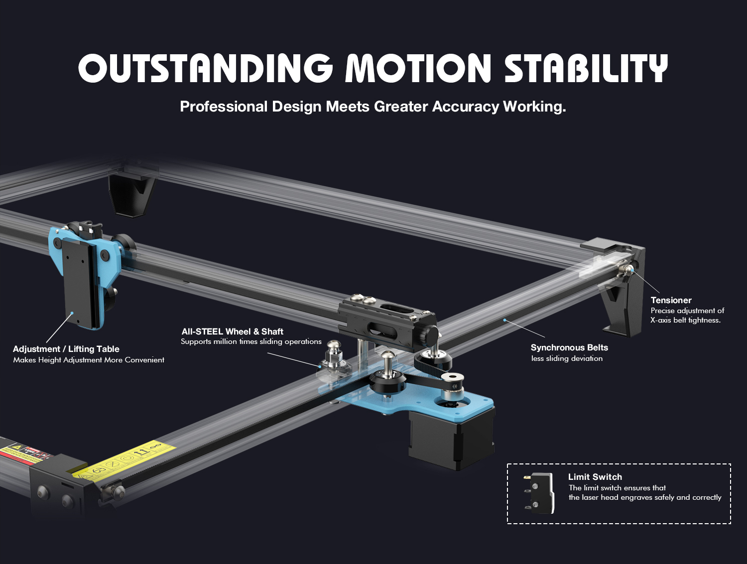 3. Lasermoduuli: COS-sirupäivitys parantaa lämmönjohtumista ja jäähdytystä. Keveämpi laserpää ja Y-akselin kaksoismoottori tuovat suuremman kaiverrusnopeuden, jopa 30000 mm/min (500 mm/s), mikä tehostaa työnkulkua.
