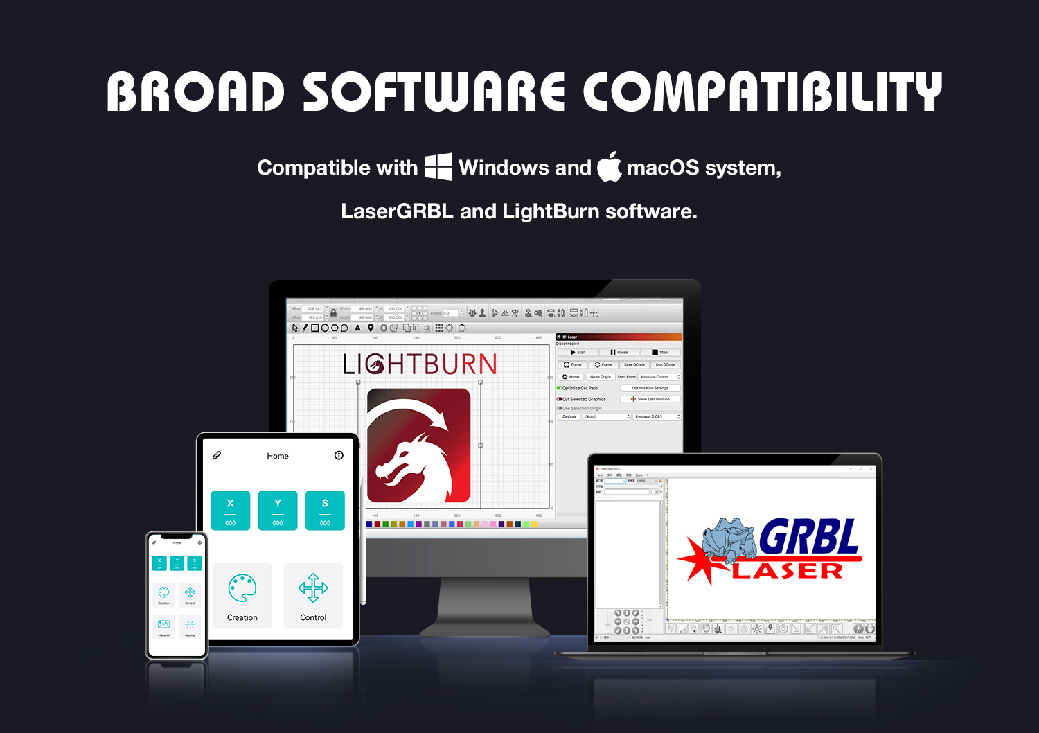 Tuetut ohjelmistot: LASERGRBL (Windows), LightBurn (yleinen)