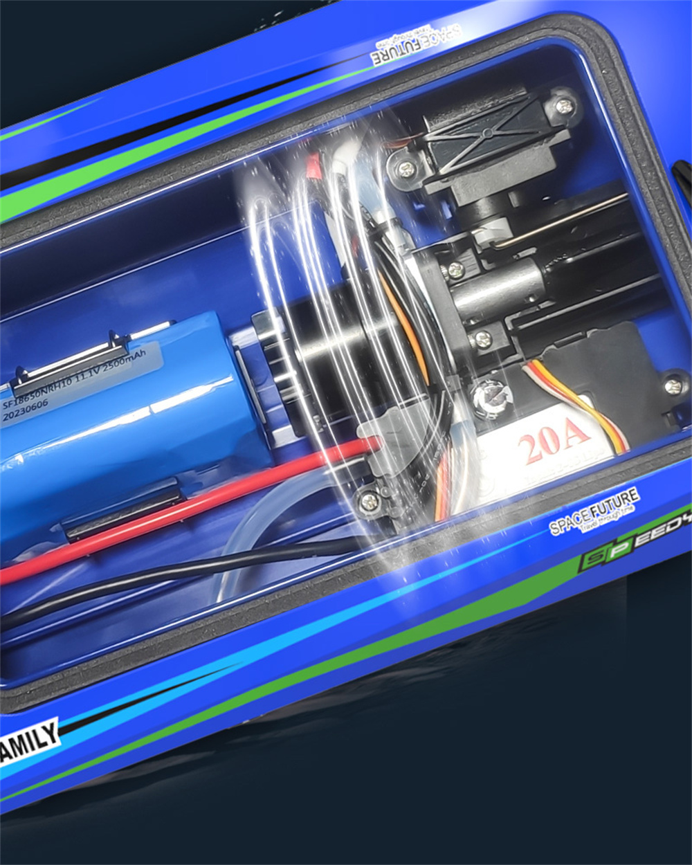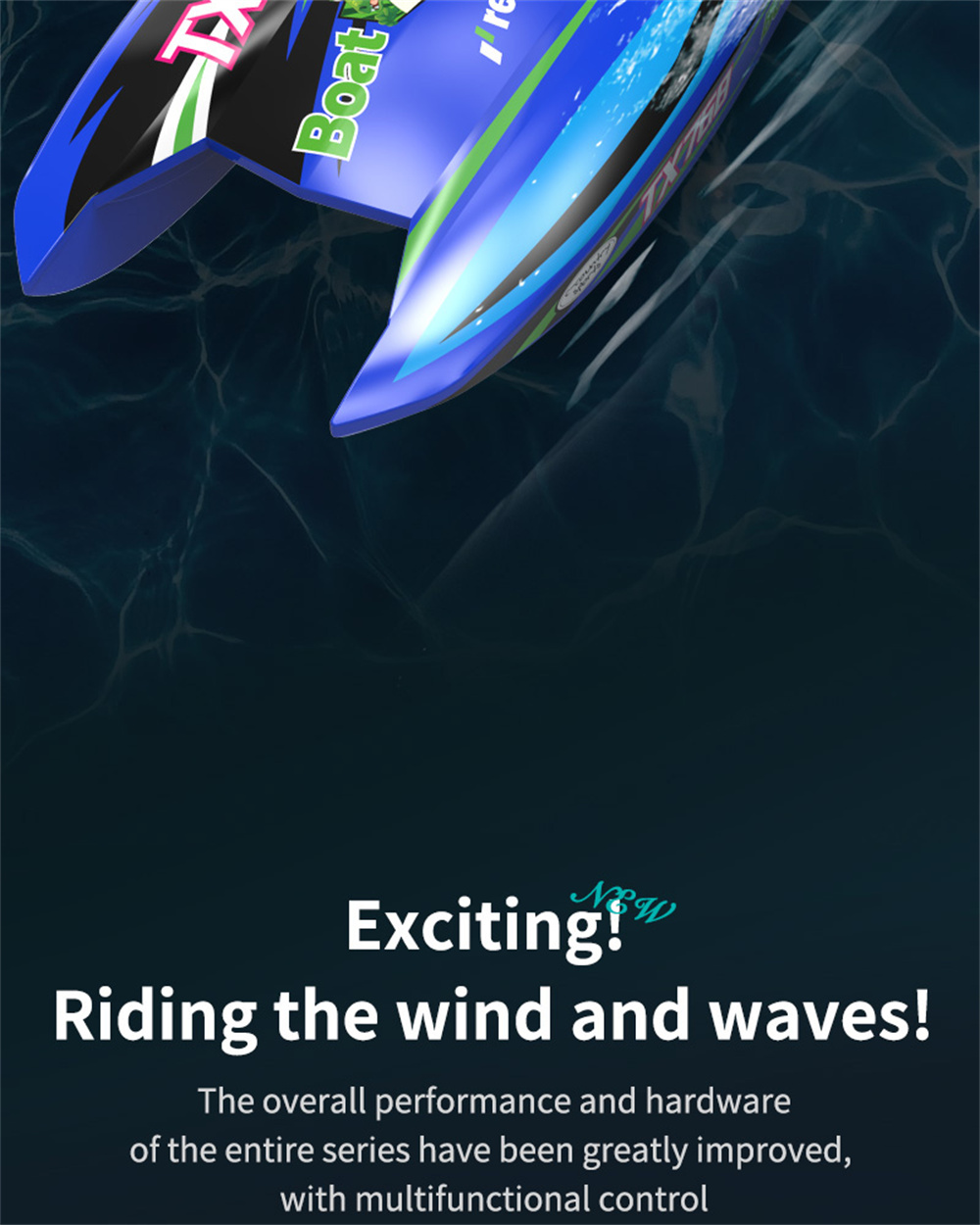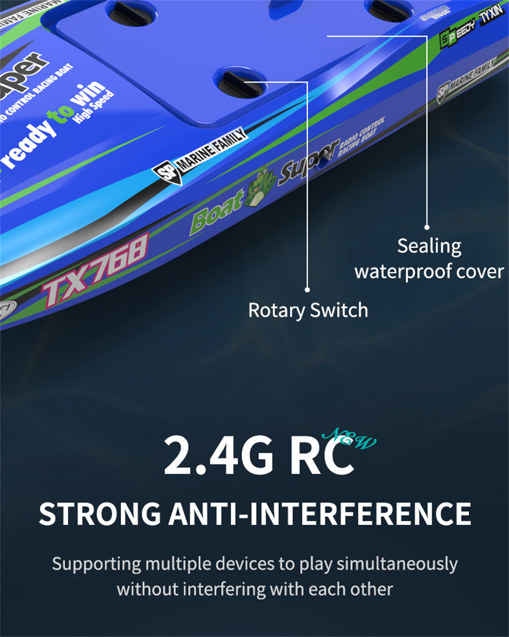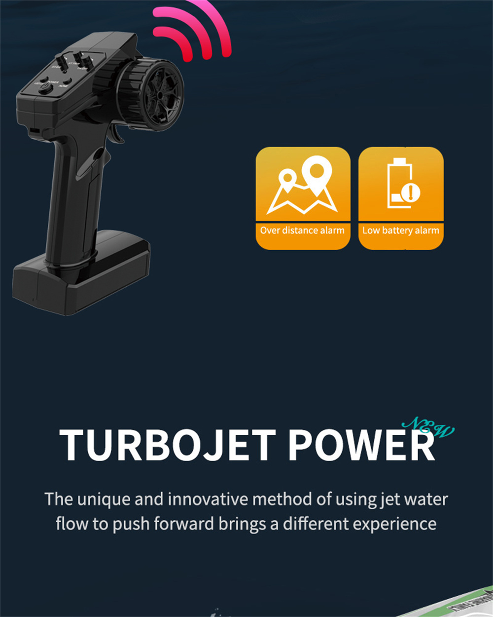 2.4G-taajuinen kauko-ohjain, pitkä ohjausetäisyys, mahdollistaa usean veneen samanaikaisen ajon ilman häiriöitä.