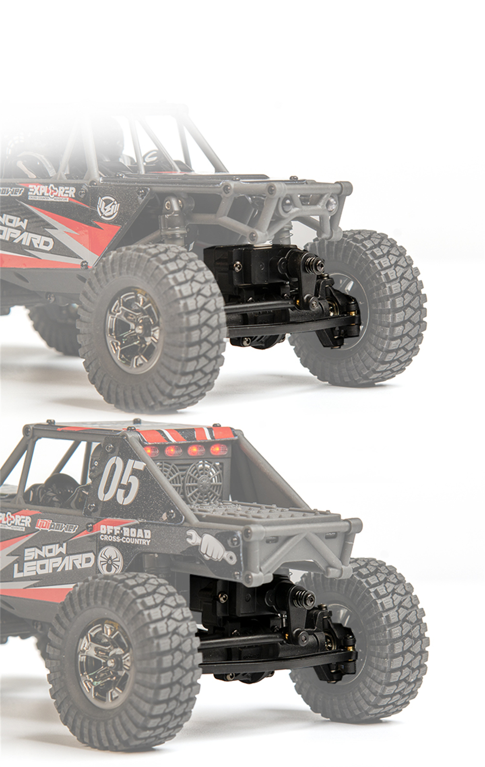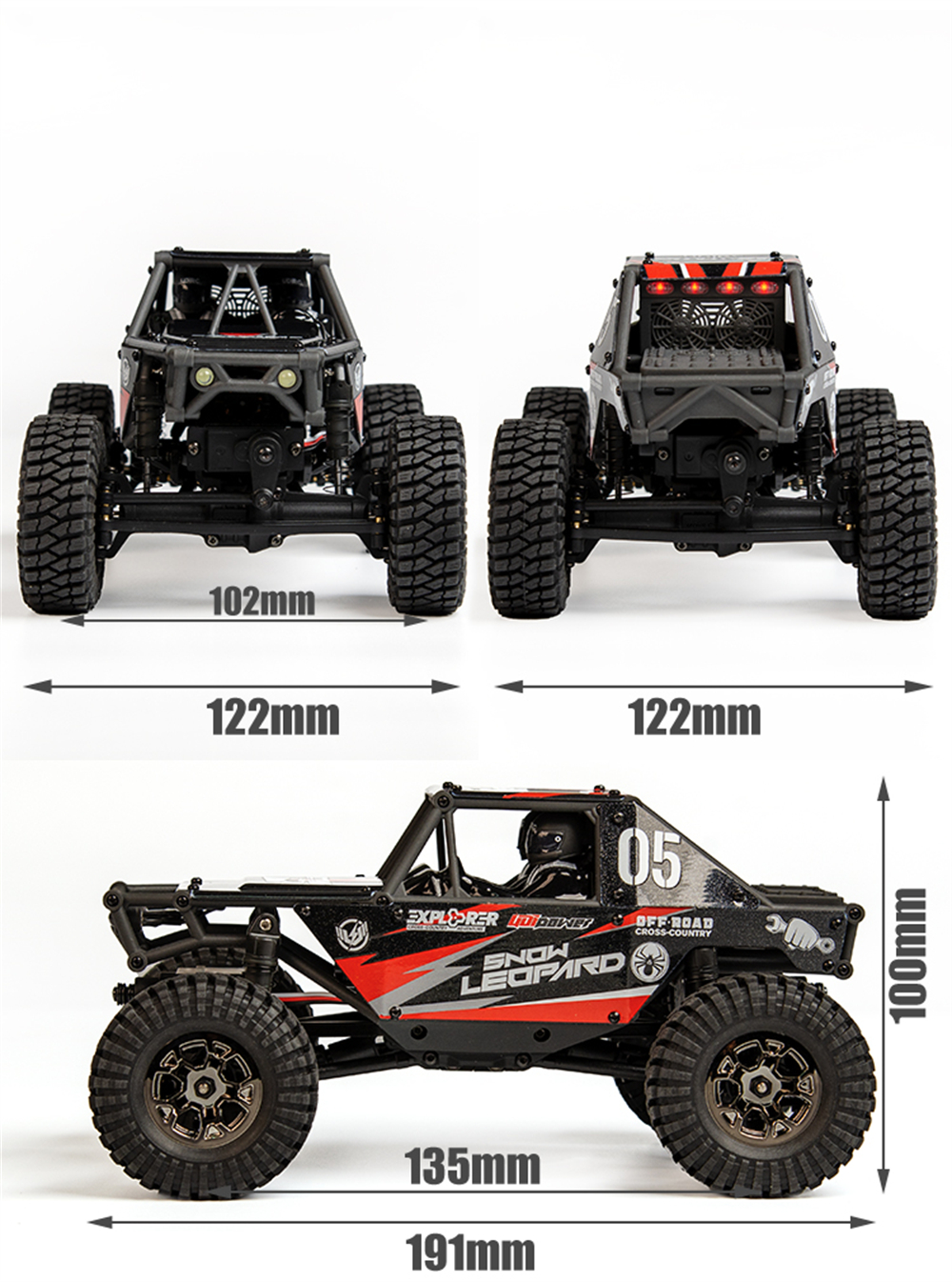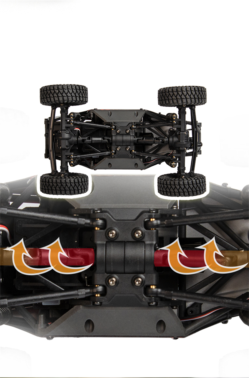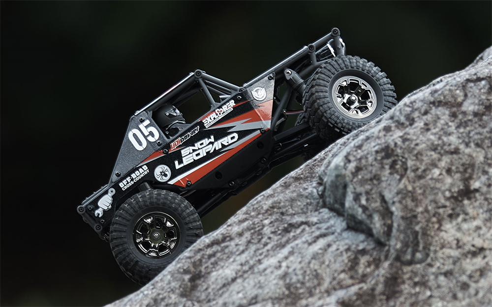 Materiaali: PA + metalli + elektroniikkaosat Auton paino: noin 342 / 352g (sisältää akun) Pieni / suuri nopeus - välityssuhde: 58.6 / 9.3 Välipyörä: 30T Lähestymis- / poistumiskulma: >85° Ylityskulma: 133° |