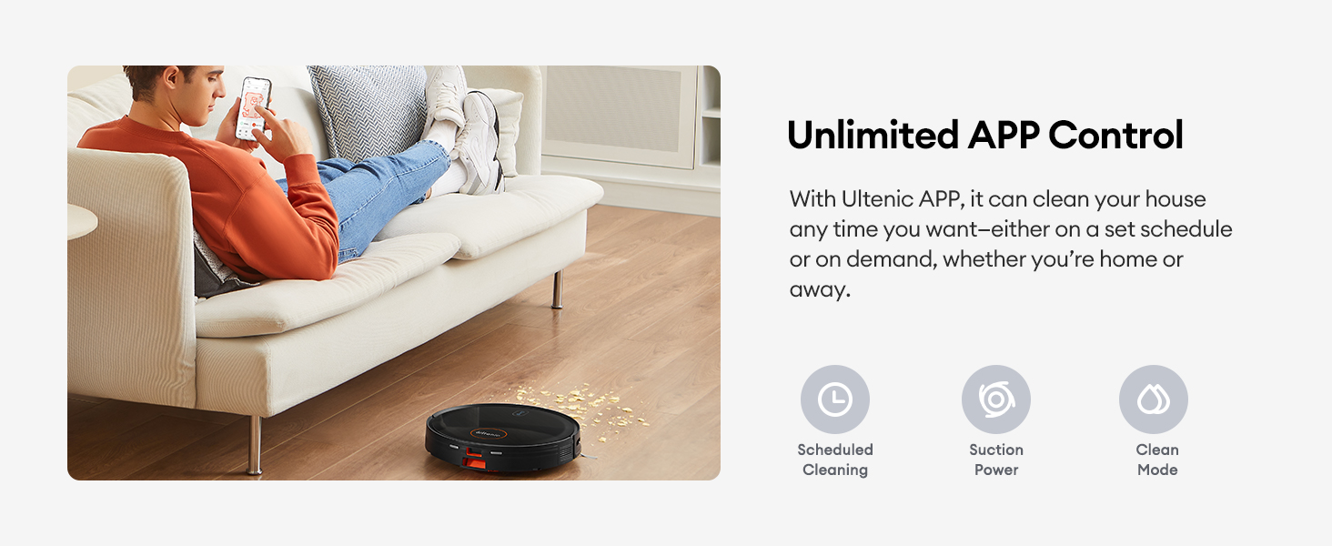 - Hallinta aina: käynnistä siivous mistä tahansa, aikatauluta, valitse tilat ja seuraa etenemistä reaaliaikaisesti Ultenic-sovelluksessa.