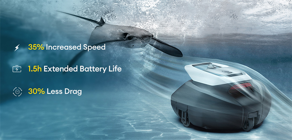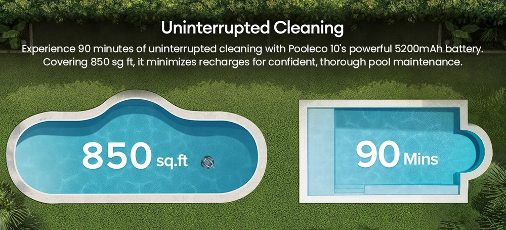 4. 90 min käyttöaika ja nopea lataus – 5200mAh akku tarjoaa jopa 90 minuutin toiminnan ja latautuu noin 2.5 tunnissa. Soveltuu altaisiin aina 850 sq ft asti.