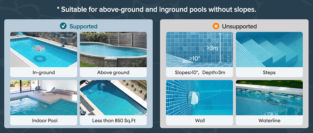 6. Laaja yhteensopivuus – Toimii maanpäällisissä ja upotetuissa altaissa, oli muoto pyöreä, nelikulmainen tai epäsäännöllinen. Puhdistaa tehokkaasti laatoitetut, vinyyli- ja betonipinnat.