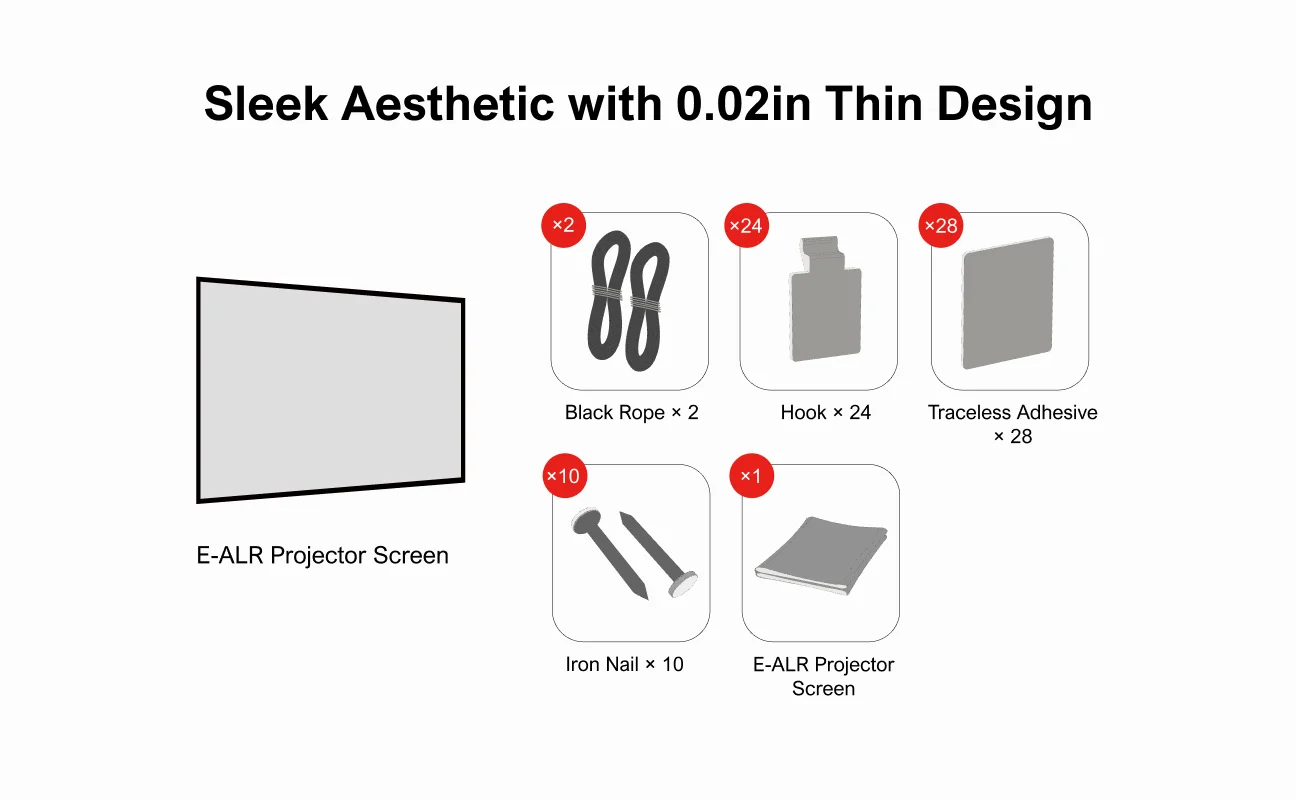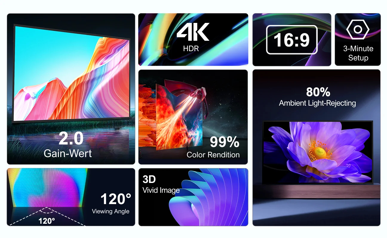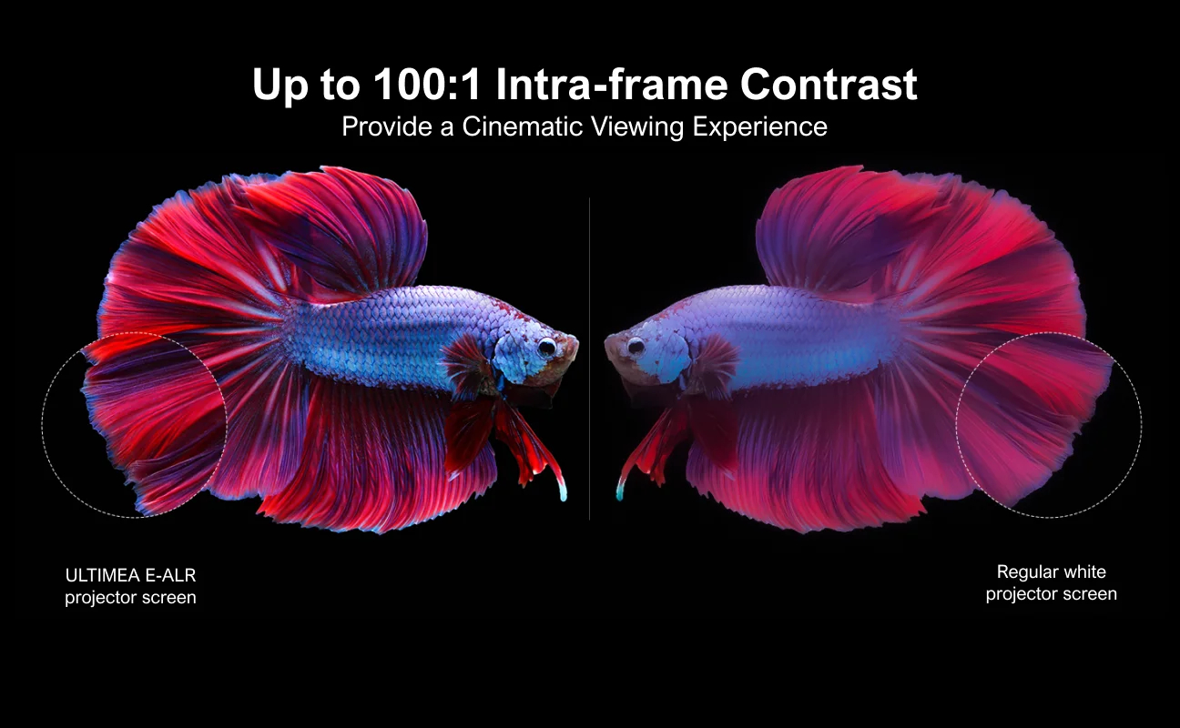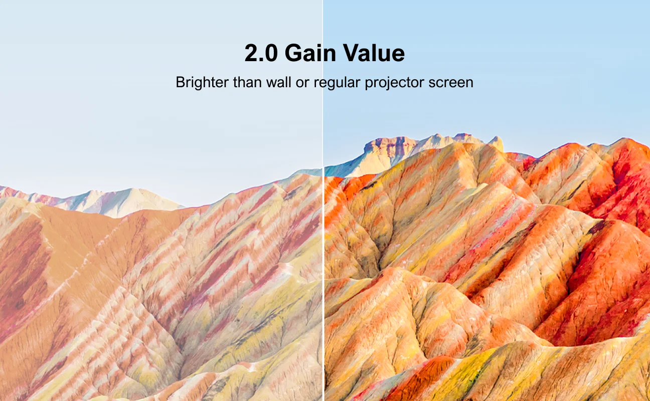 1. 2.0 vahvistusarvo: ALR (Ambient Light Rejection) -kangas heijastaa enemmän projektorin valoa ja tuottaa kirkkaamman, kontrastikkaamman kuvan kuin perinteiset kankaat tai valkoiset seinät.