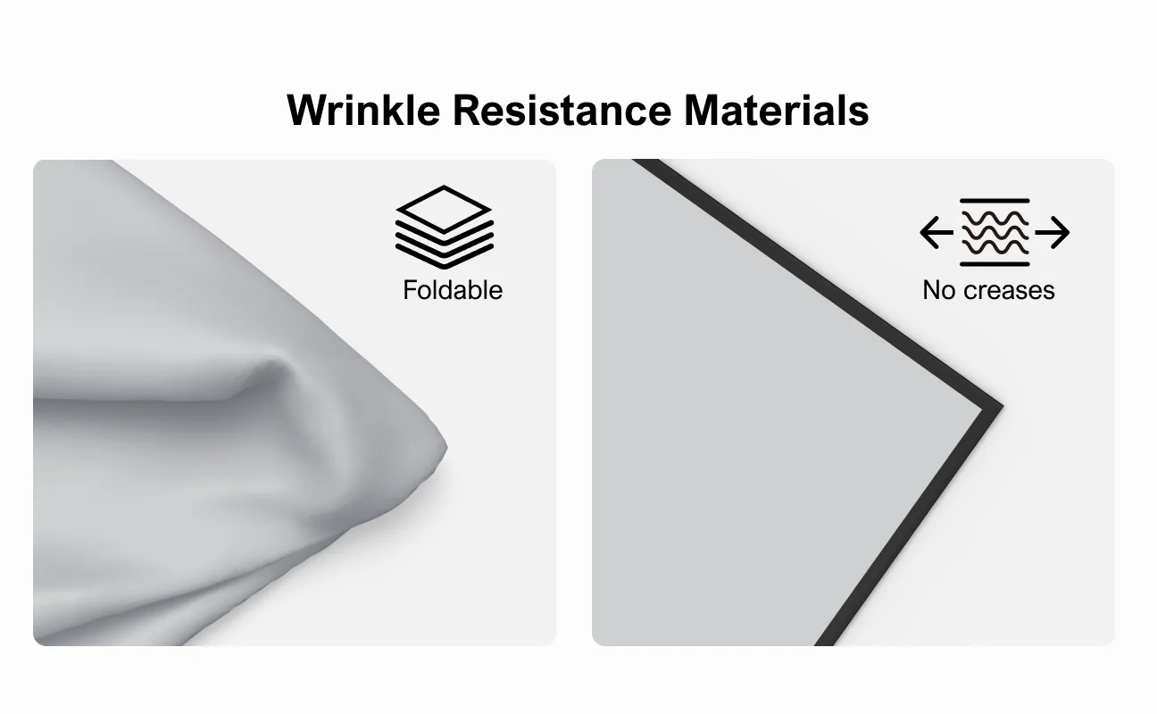 4. Ryppykestävyys: Ryppyjä hylkivä materiaali – väliaikaiset taitokset säilytyksestä eivät heikennä kuvanlaatua. Rypyt häviävät 3 päivän kuluessa, kun ALR-kankaan musta puoli venytetään tai silitetään.