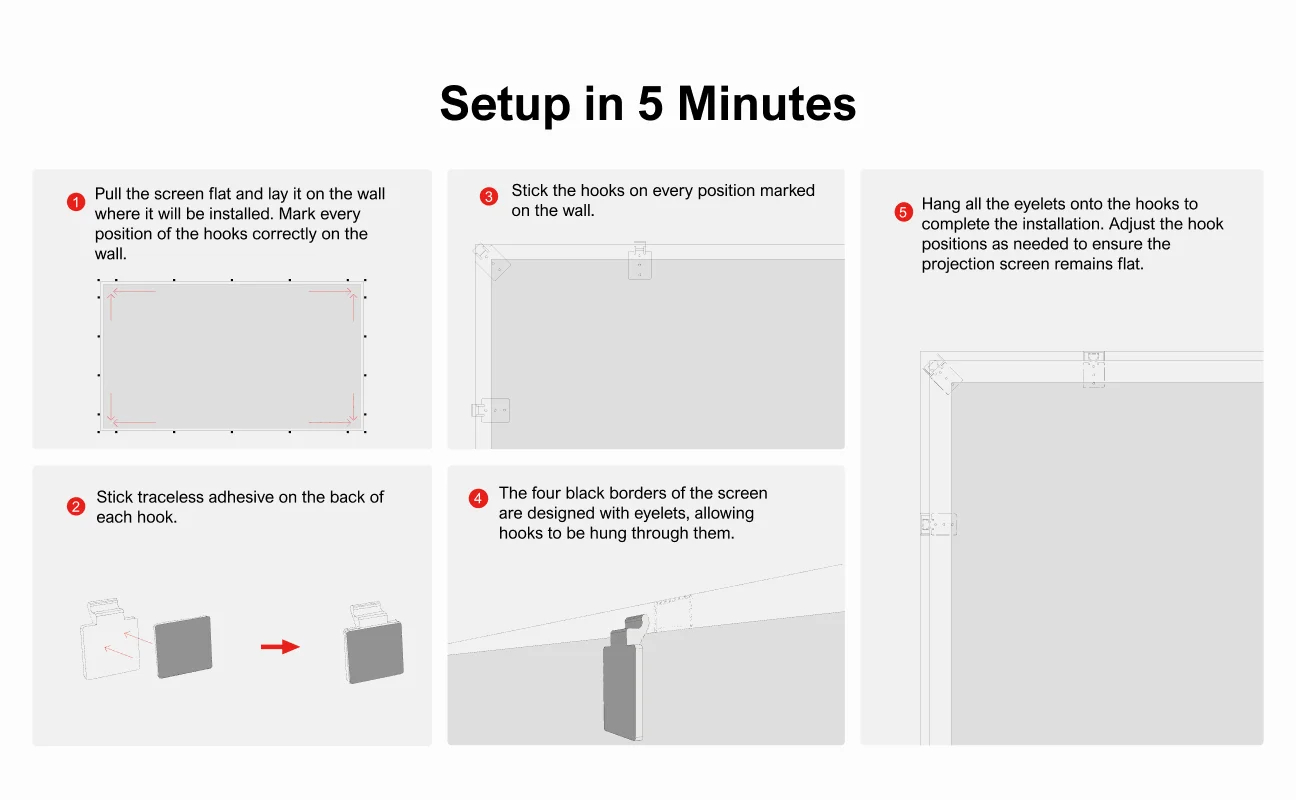 6. Helppo käyttöönotto: Kaksi asennustapaa – seinäkiinnitys koukuilla tai liimalla oikean kireyden varmistamiseksi, tai ota mukaan retkeilyyn ja ripusta naruilla siirrettävää käyttöä varten.