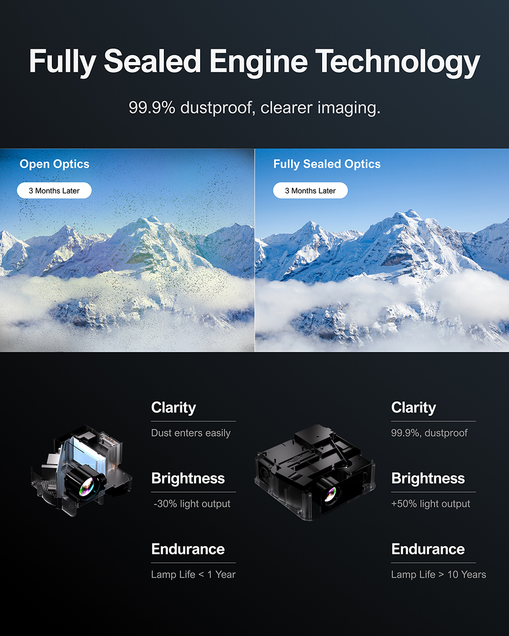 - Täysin suljettu optinen moottori ja pinnoitettu optinen linssi