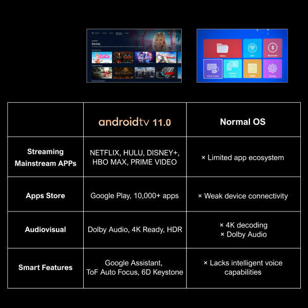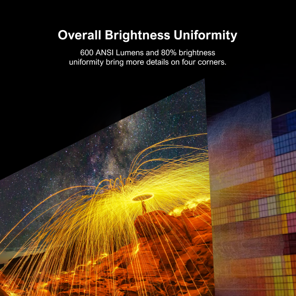 Kompakti projektori kotiteatteriin ja liikkuvaan käyttöön. Kääntyvä 90° gimbaalijalusta helpottaa sijoittelua, Android TV 11.0 tarjoaa laajan sovellusvalikoiman, ja 600 ANSI lumenin kirkkaus sekä automaattitarkennus ja 6D trapetsikorjaus takaavat selkeän kuvan. Natiiviresoluutio on 1080P, ja laite tukee 4K-sisältöä, HDR 10 ja HLG -toistoa.