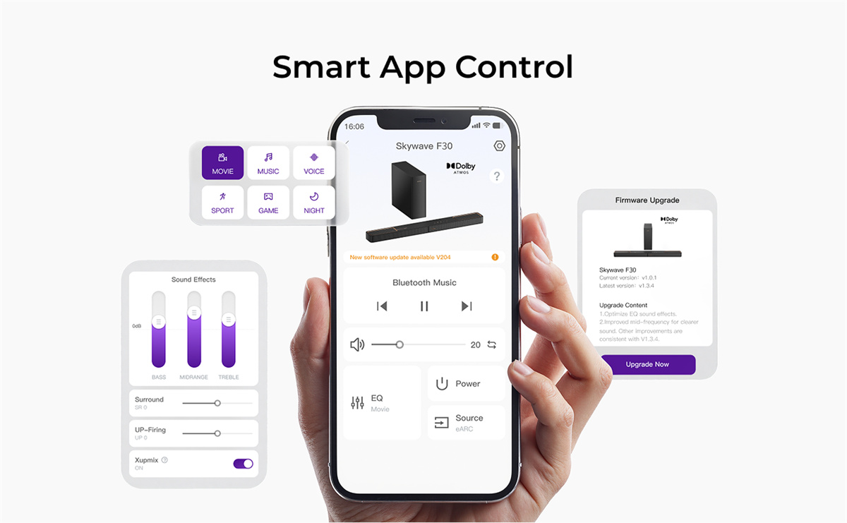 3.1.2-kanavainen ULTIMEA Skywave F30 -äänipalkki luo selkeän ja mukaansatempaavan äänen kotiin. Yhdessä 5.25-tuumaisen johdollisen bassokaiuttimen kanssa se tuo elokuvat, sarjat ja pelit eloon selkeällä puheella ja syvällä bassolla. Helppo liittää TV:hen HD eARC -liitännällä ja ohjata kaukosäätimellä tai sovelluksella.