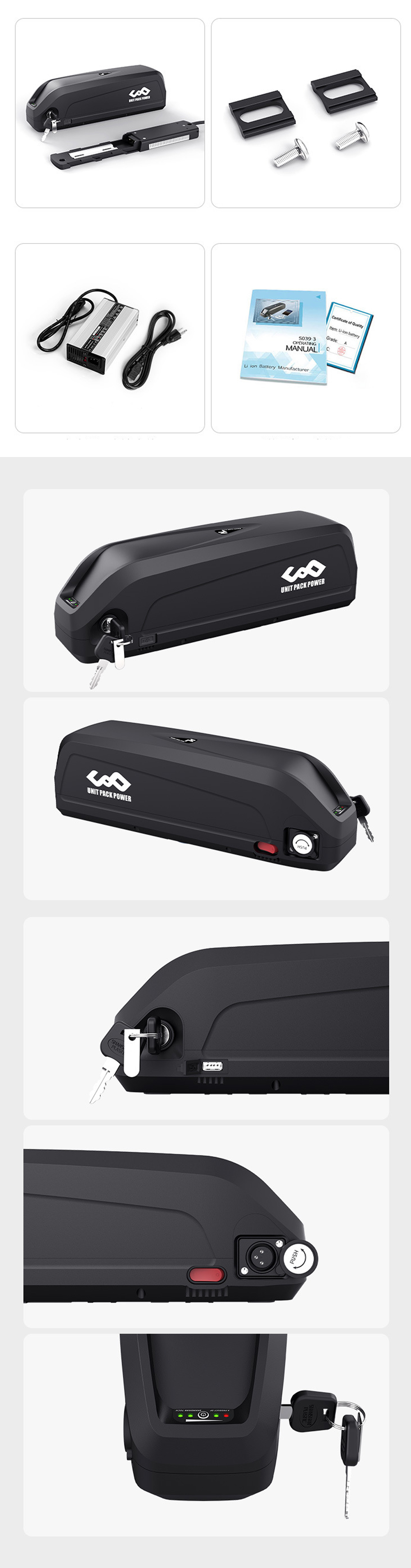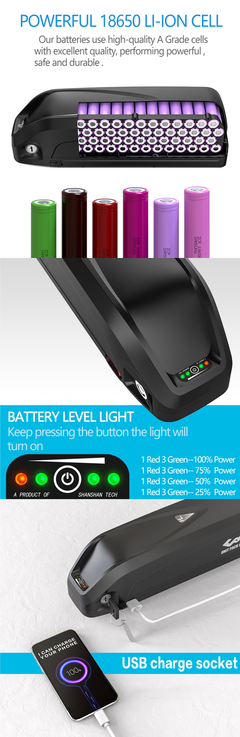 1. Käyttäjäystävällinen rakenne: Kevyt akku on helppo asentaa ja irrottaa. Kova musta muovikuori suojaa akkua, ja LED-lataustason ilmaisin kertoo lataustarpeesta ajoissa. USB-portti mahdollistaa puhelimen ja muiden laitteiden lataamisen ulkona. Mukana akkupidike, avaimella avattava turvalukko helpottaa käyttöä.