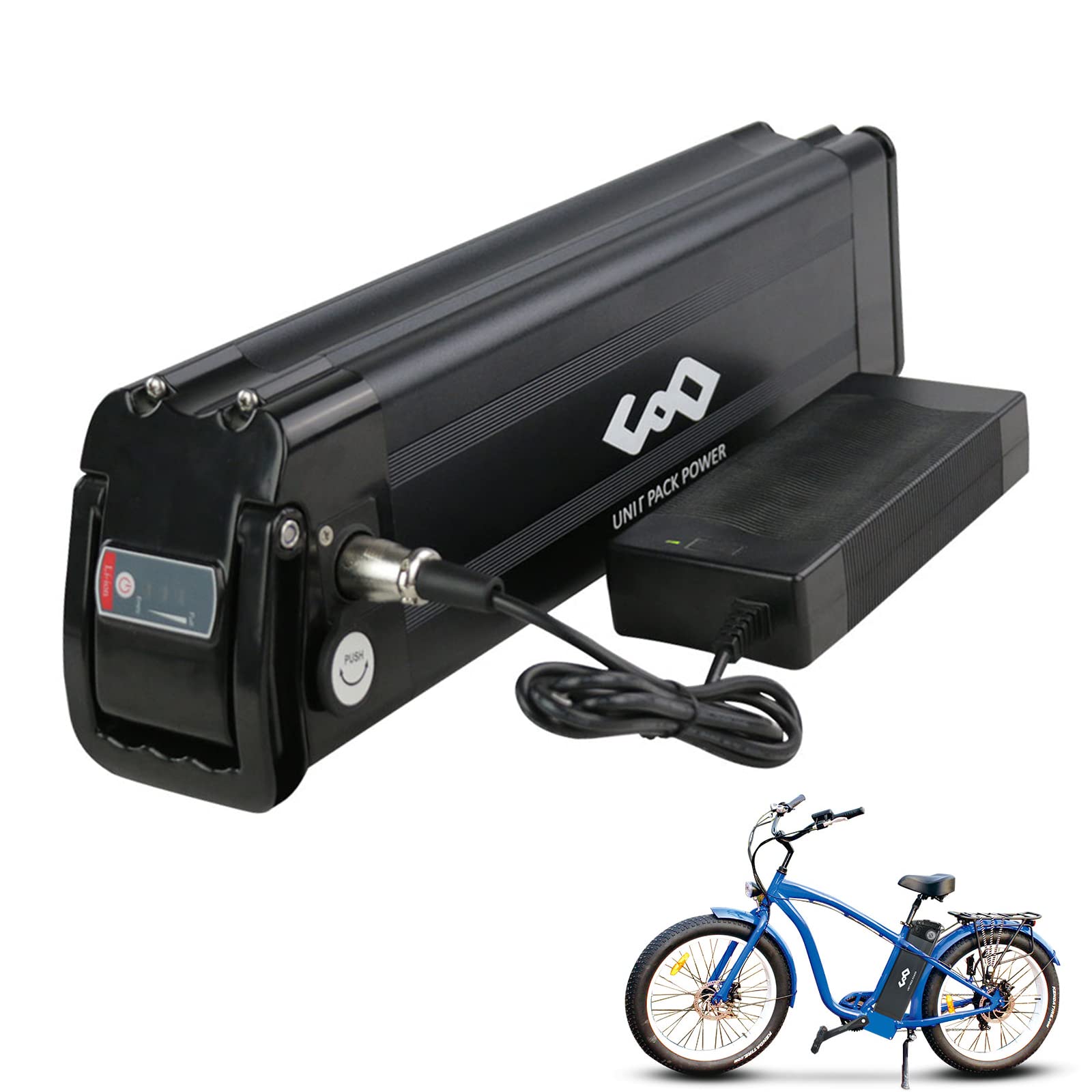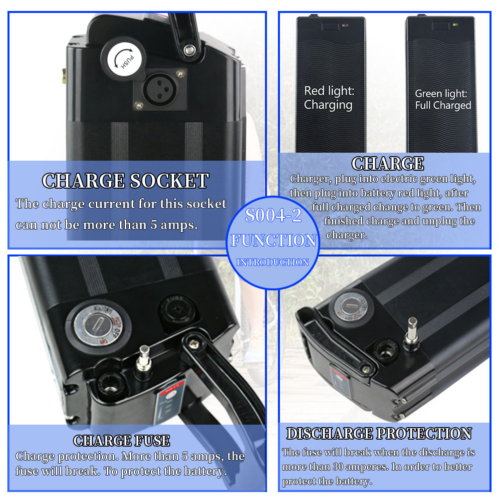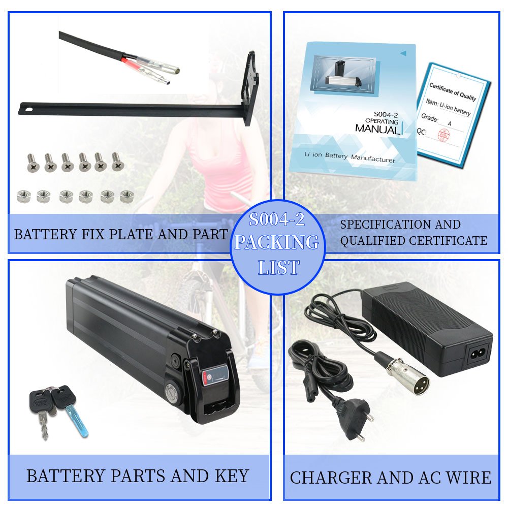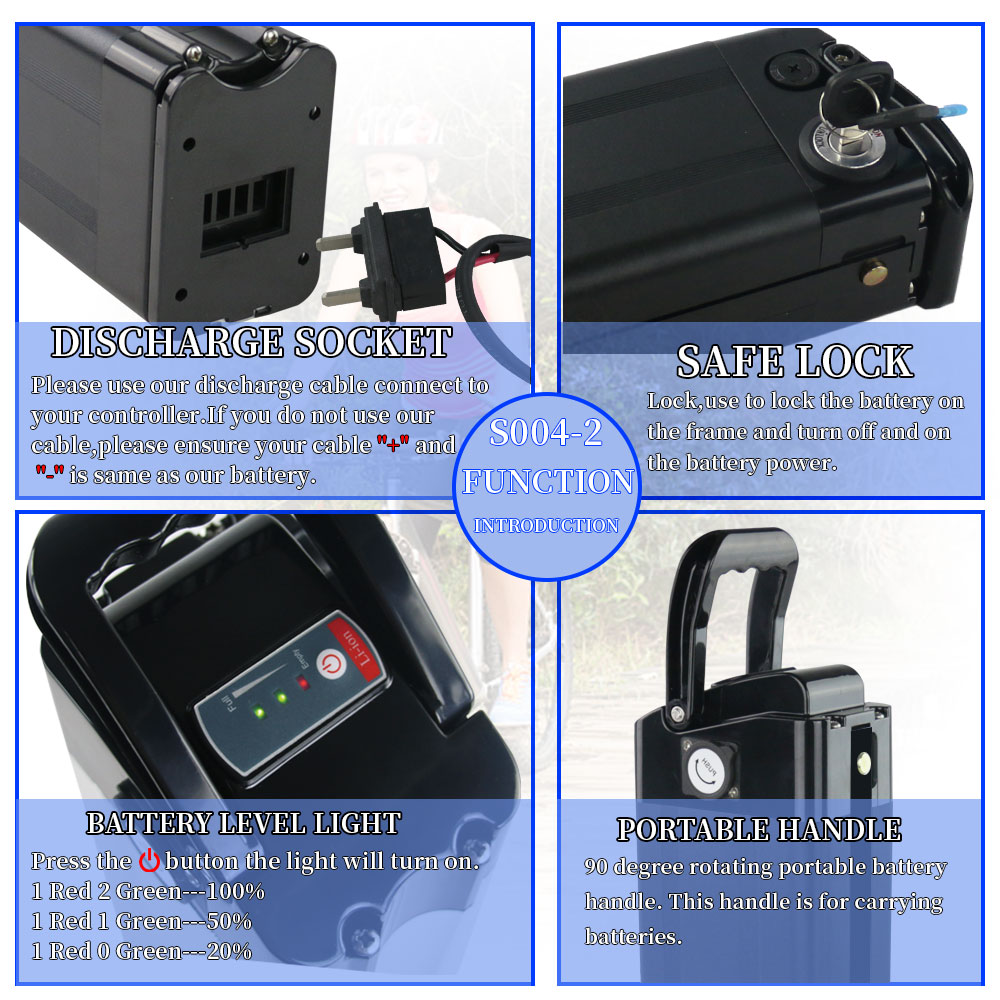UNITPACKPOWER S004-2 on runkoon asennettava 36V17.5AH sähköpyörän akku, jossa on LG3500-kennot. Kompakti koko ja tukeva kiinnityslevy tekevät siitä sopivan monenlaisiin sähköpyöriin, kun taas mukana toimitettava laturi helpottaa käyttöönottoa.