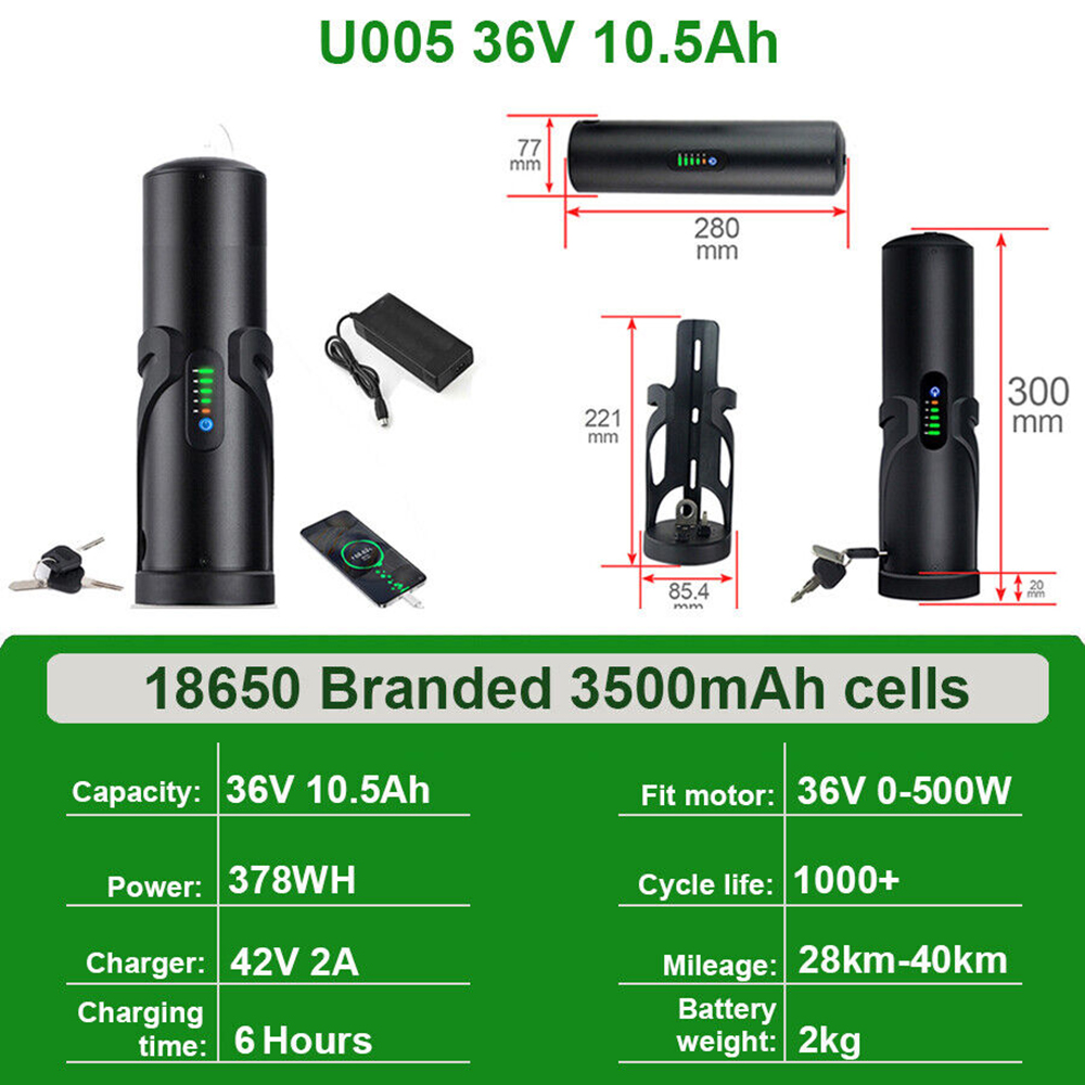 Tämä UNITPACKPOWER U005 -pulloakku on kompakti ja kevyt 36V 10.5Ah litiumioniakku sähköpyörille. Vesitiivis alumiinikotelo ja integroitu kiinnityslevy helpottavat asennusta ja käyttöä päivittäisessä ajossa.