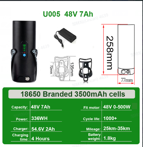 1. U005-malli: 48V 7Ah -suorituskykyinen akku pidemmille ajomatkoille.