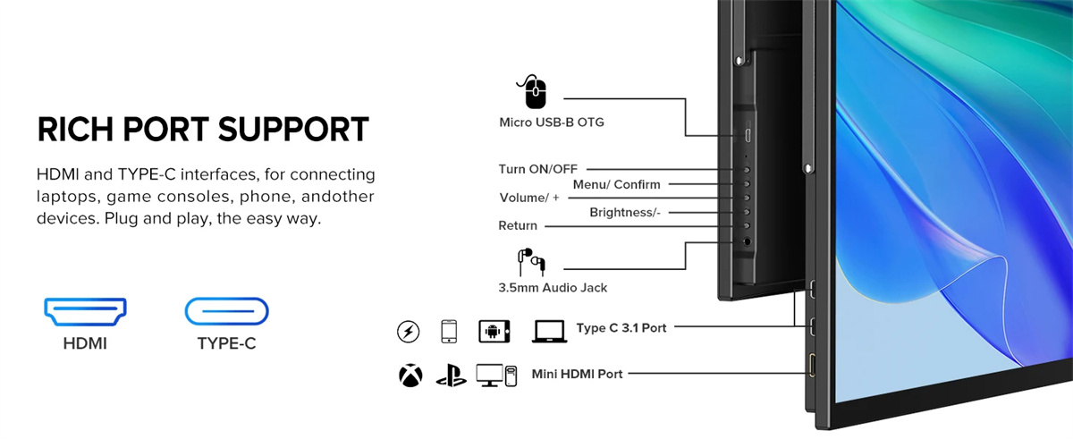 5. Useat portit: Varustettu mini HD -liitännällä ja 2 USB-C 3.1 -portilla, yhteensopiva kannettavien, PC:iden, puhelimien ja pelikonsoleiden kanssa.
