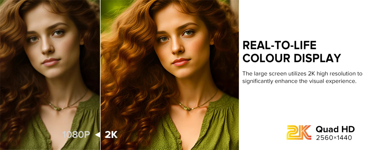 2. 2K 8-bittiset selkeät kuvat: 2K-tarkkuus, 300 nitiä kirkkaus, 100% sRGB ja 1000:1 kontrasti eloisille ja tarkkoille väreille.