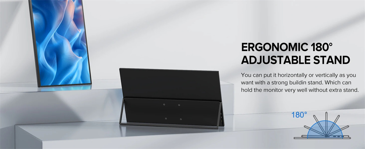 3. VESA ja jalustat: Ohut muotoilu, VESA-kiinnitys ja integroidut 180° säädettävät jalustat helppoon käyttöönottoon ja kuljetukseen.