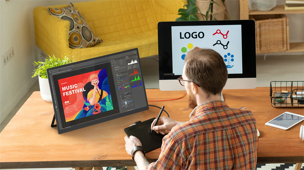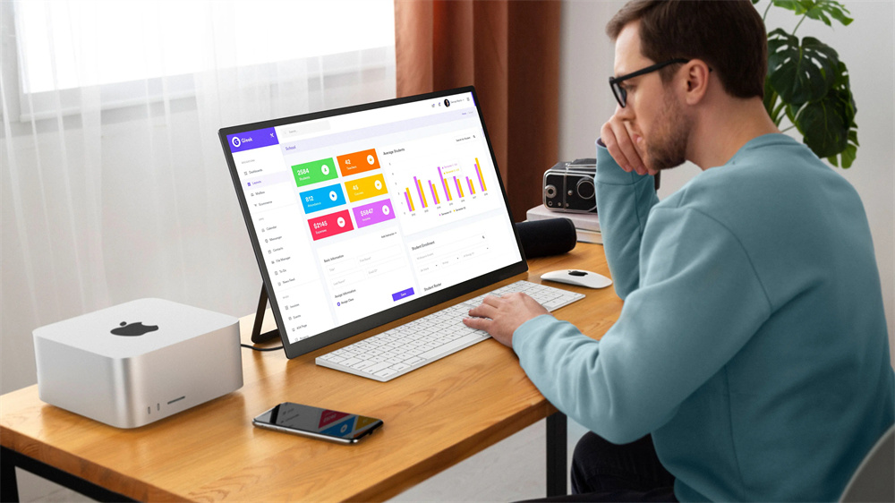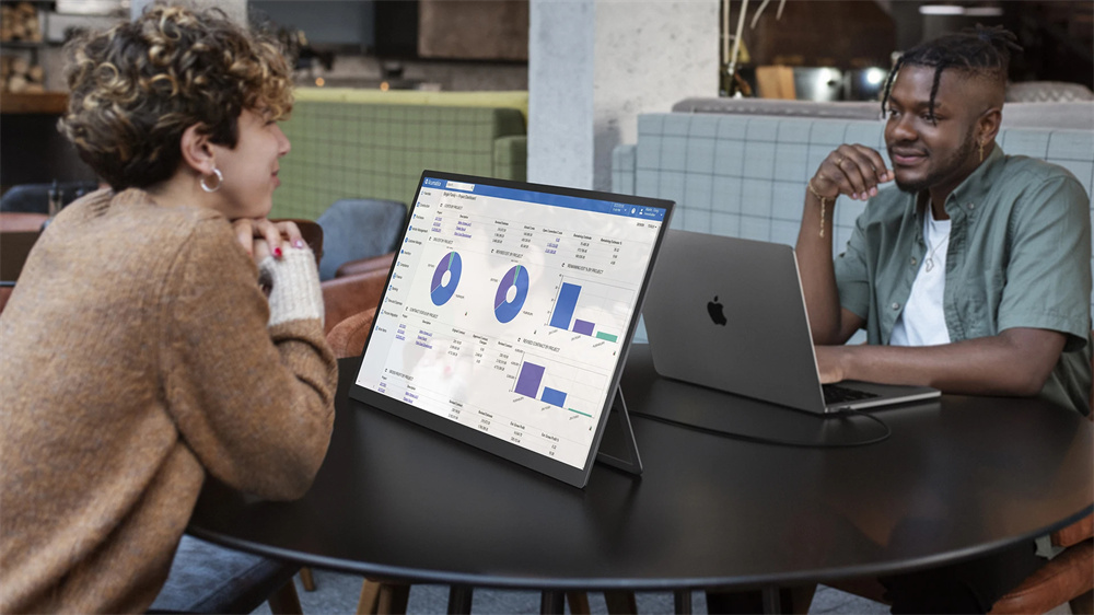 1. Kannettava muotoilu: Yhdistää pöytänäytön ja kannettavan näytön edut, helppo käyttää niin sisällä kuin ulkona.