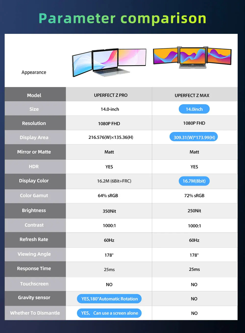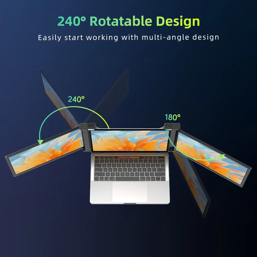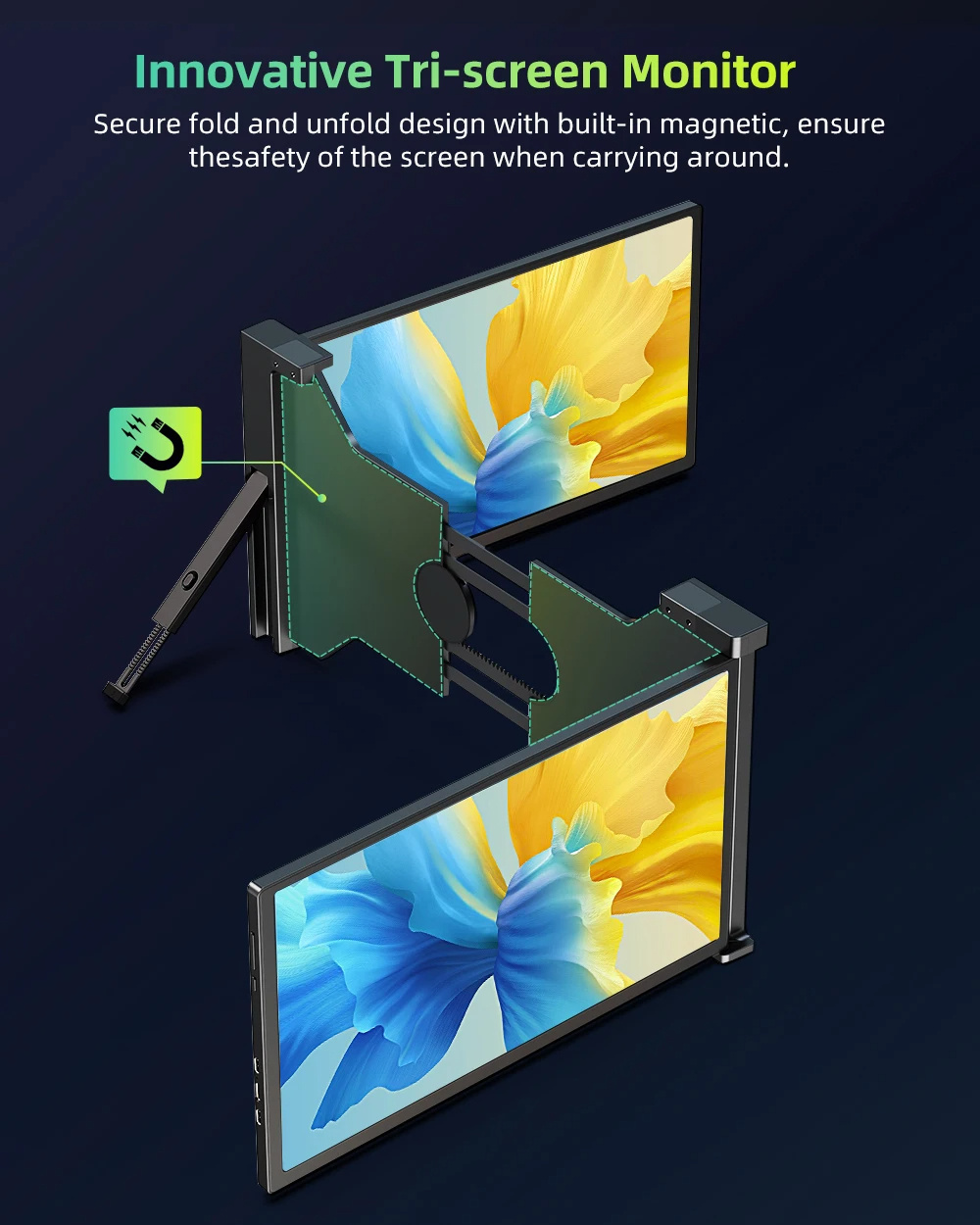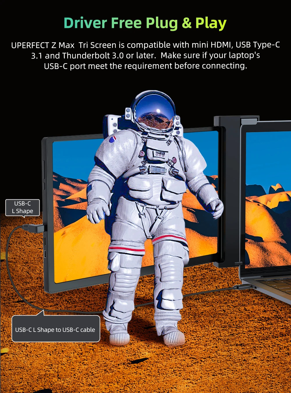UPERFECT Z Pro on kannettava kolmoisnäyttölaajennin, joka kiinnittyy kannettavaan tietokoneeseen ja tuo lisää työtilaa ilman ajureita. 14.0-tuumaiset 1080P täysteräväpiirtonäytöt, 178° katselukulmat ja 180° automaattinen kääntö tukevat sujuvaa moniajoa toimistossa, opiskelussa ja pelaamisessa.