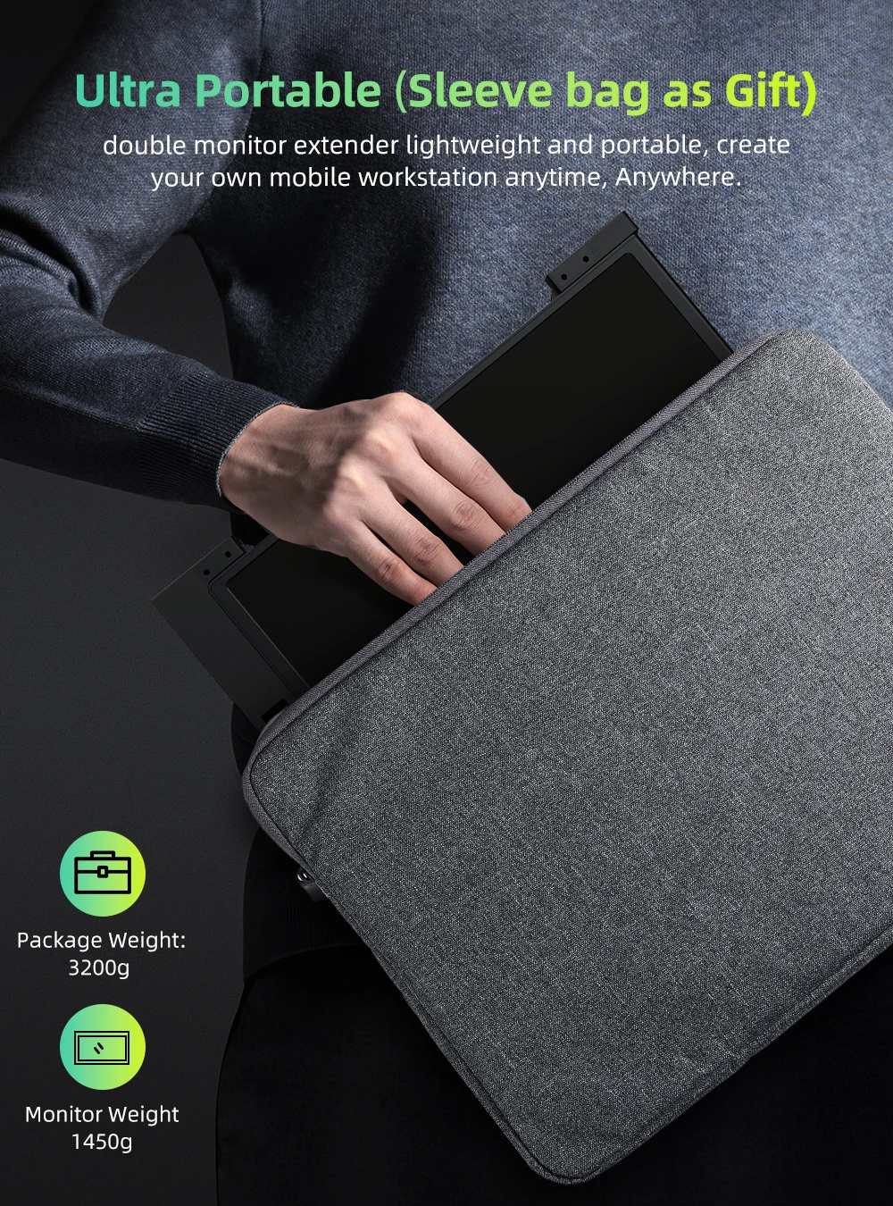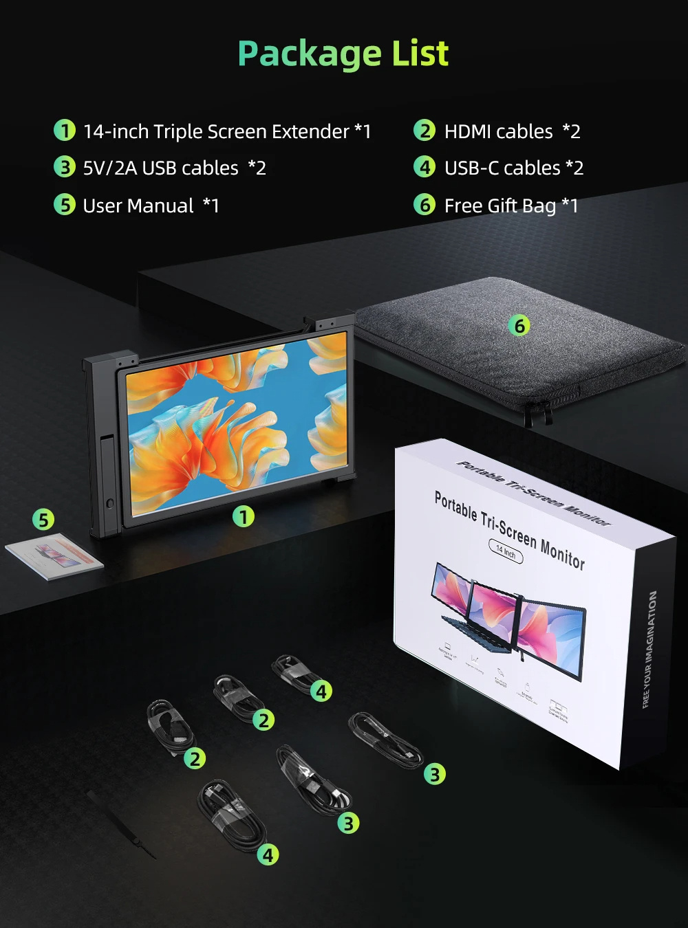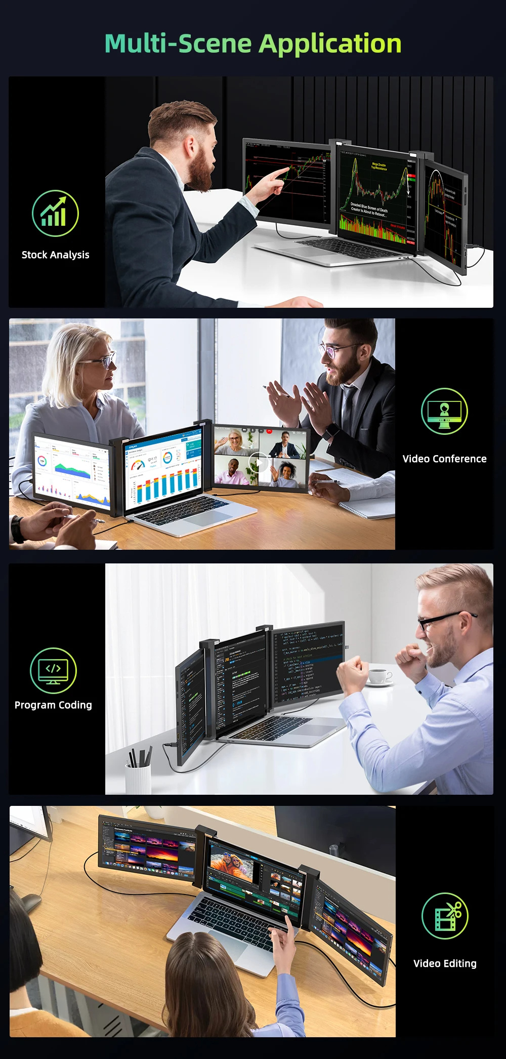 UPERFECT Z Pro on kannettava kolmoisnäyttölaajennin, joka kiinnittyy kannettavaan tietokoneeseen ja tuo lisää työtilaa ilman ajureita. 14.0-tuumaiset 1080P täysteräväpiirtonäytöt, 178° katselukulmat ja 180° automaattinen kääntö tukevat sujuvaa moniajoa toimistossa, opiskelussa ja pelaamisessa.