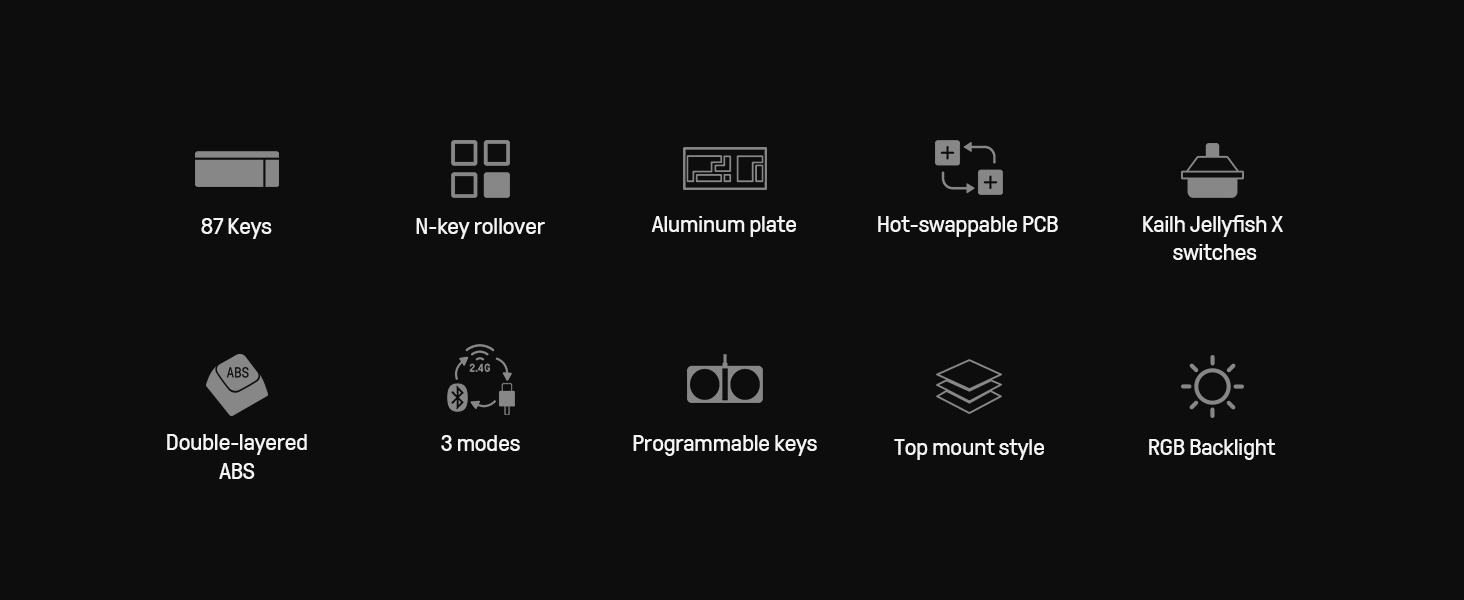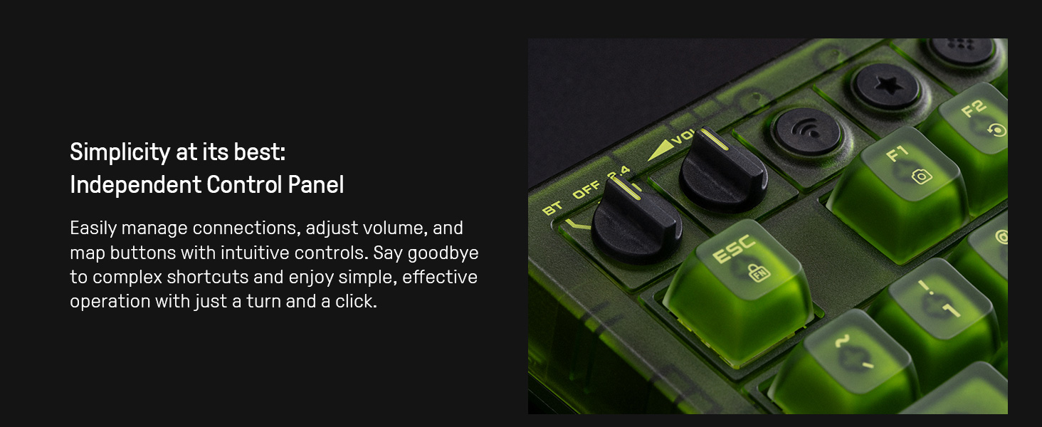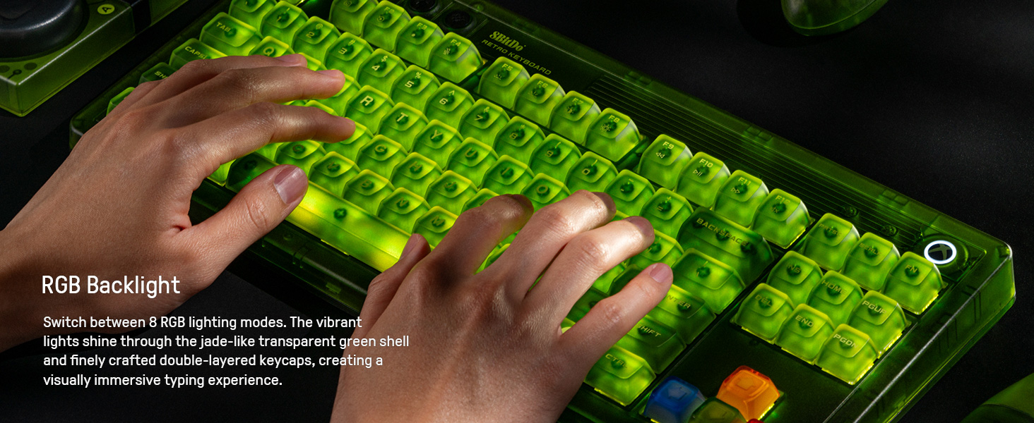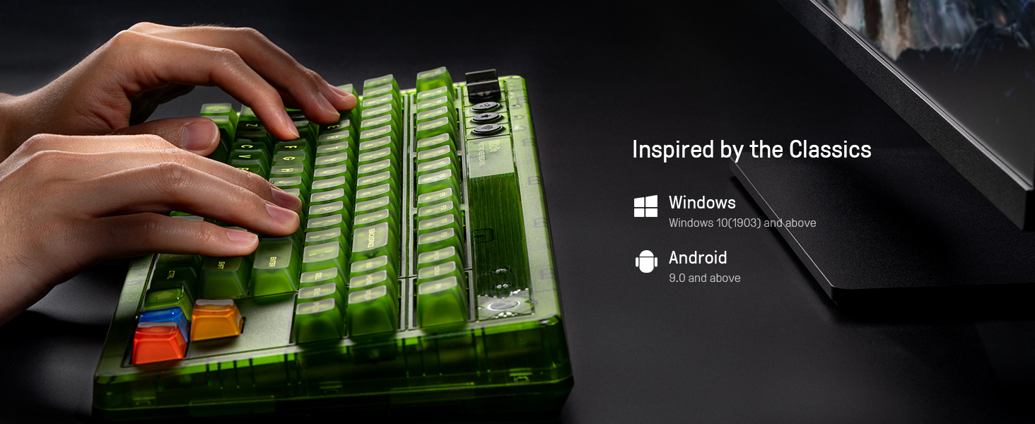 Retrohenkinen mekaaninen näppäimistö, joka yhdistää läpinäkyvän estetiikan, pelihenkiset yksityiskohdat ja monipuoliset liitäntätavat. Sopii pelaamiseen ja työskentelyyn Windows- ja Android-laitteilla.