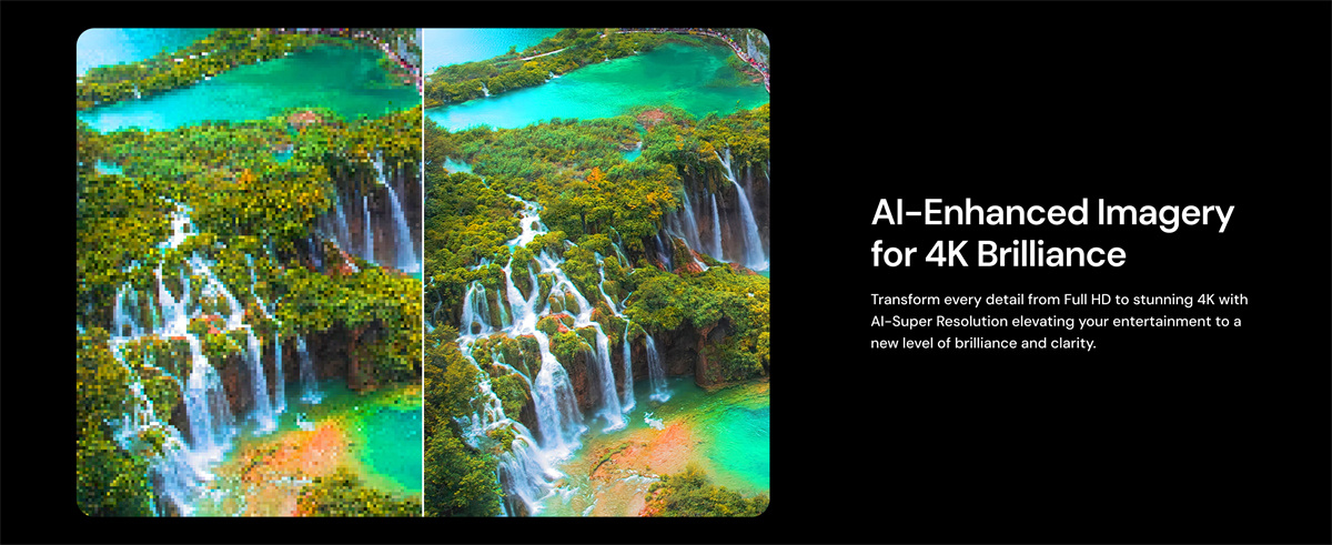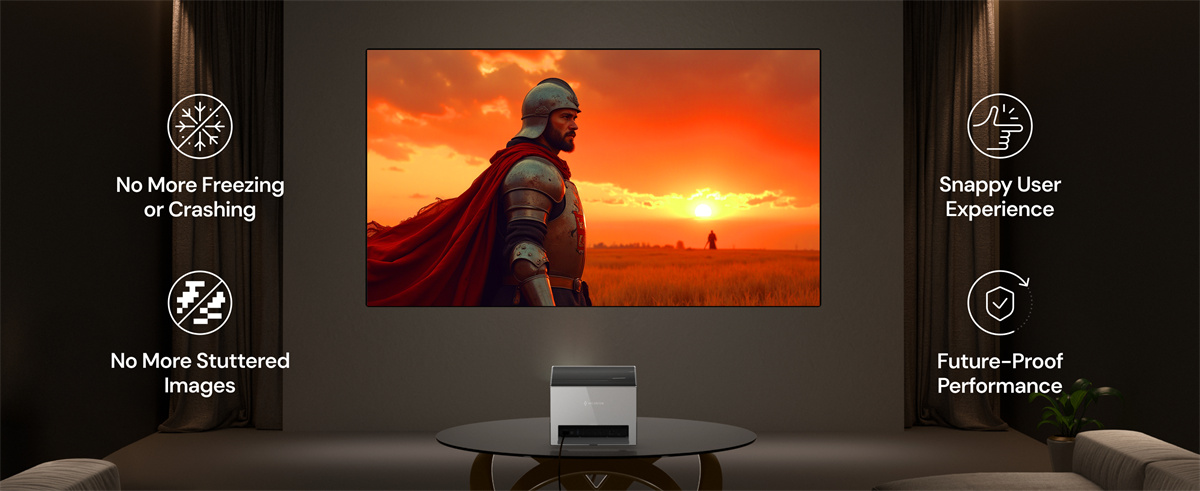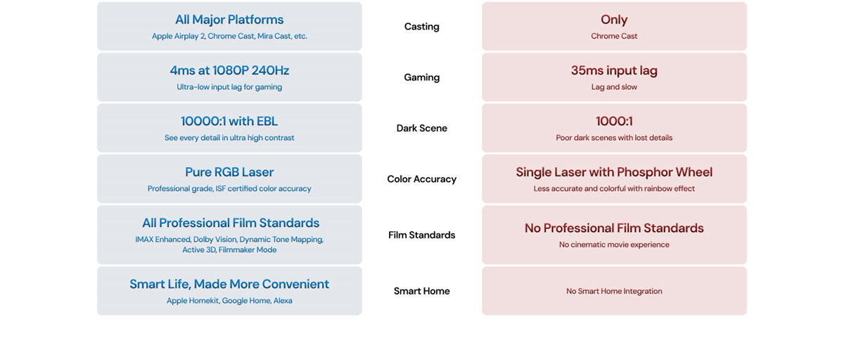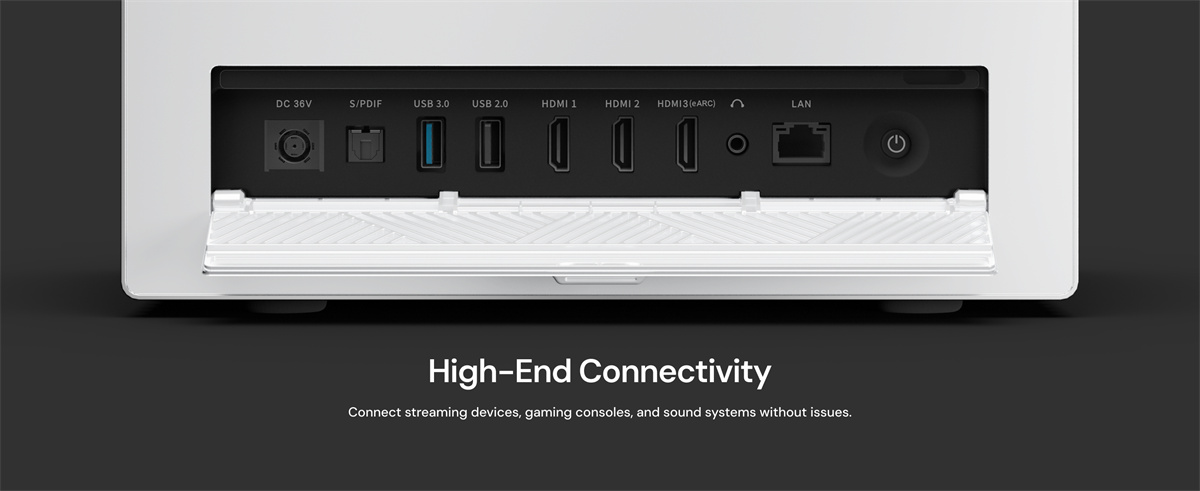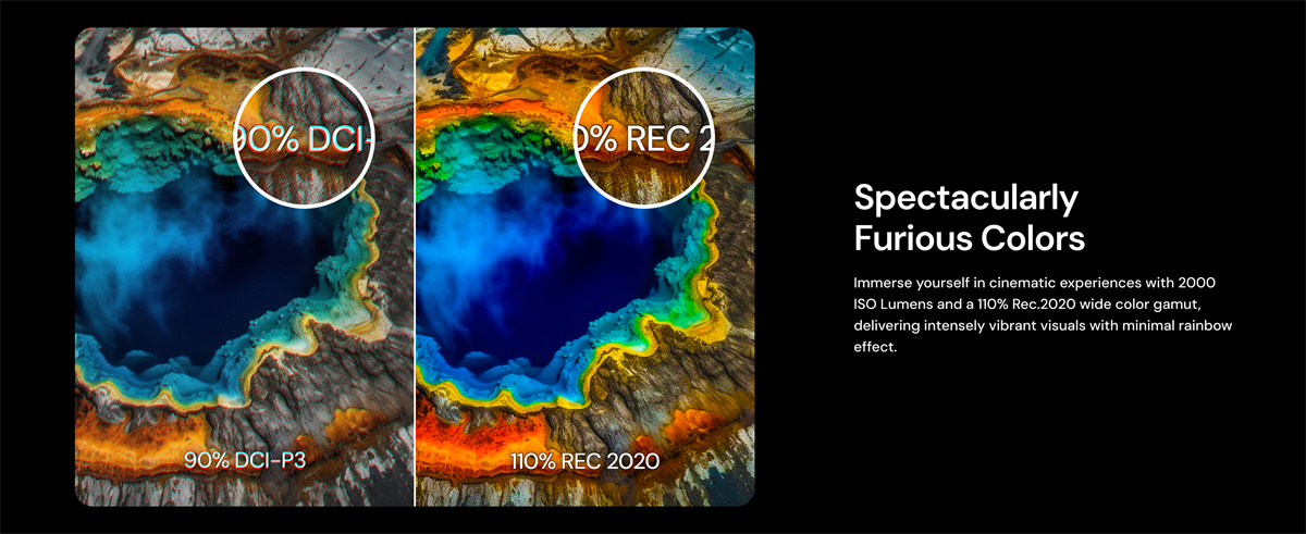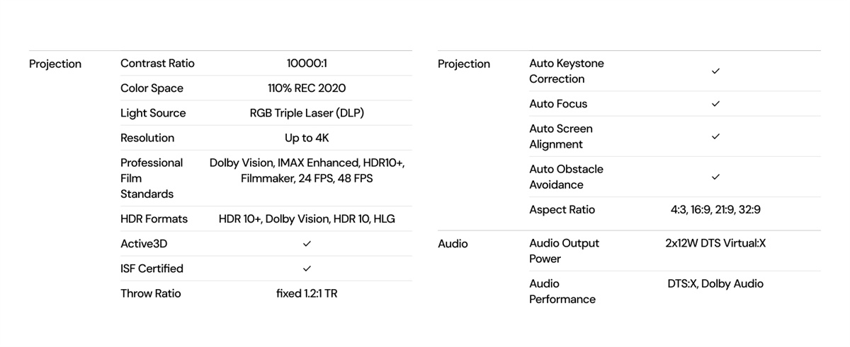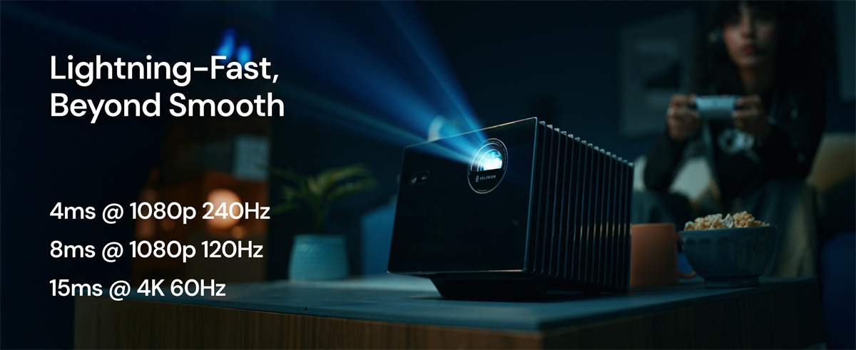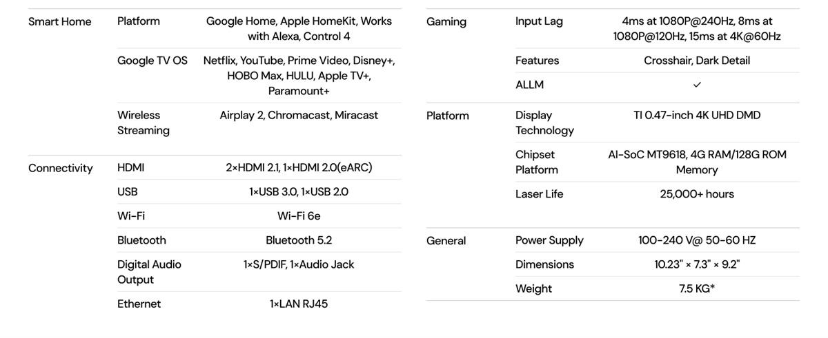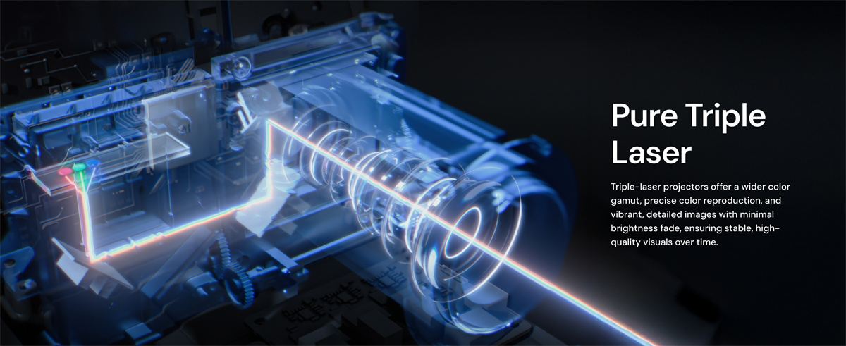 Täysin varusteltu RGB kolmoislaser -projektori kotiteatteriin ja pelaamiseen: tarkka 0.47-tuumainen 4K DLP-kuva, laaja väriavaruus, tuetut elokuvastandardit sekä nopeat pelitilat. Toimii älykodin kanssa ja tarjoaa monipuoliset liitännät.