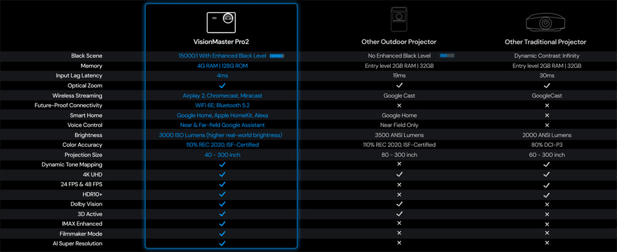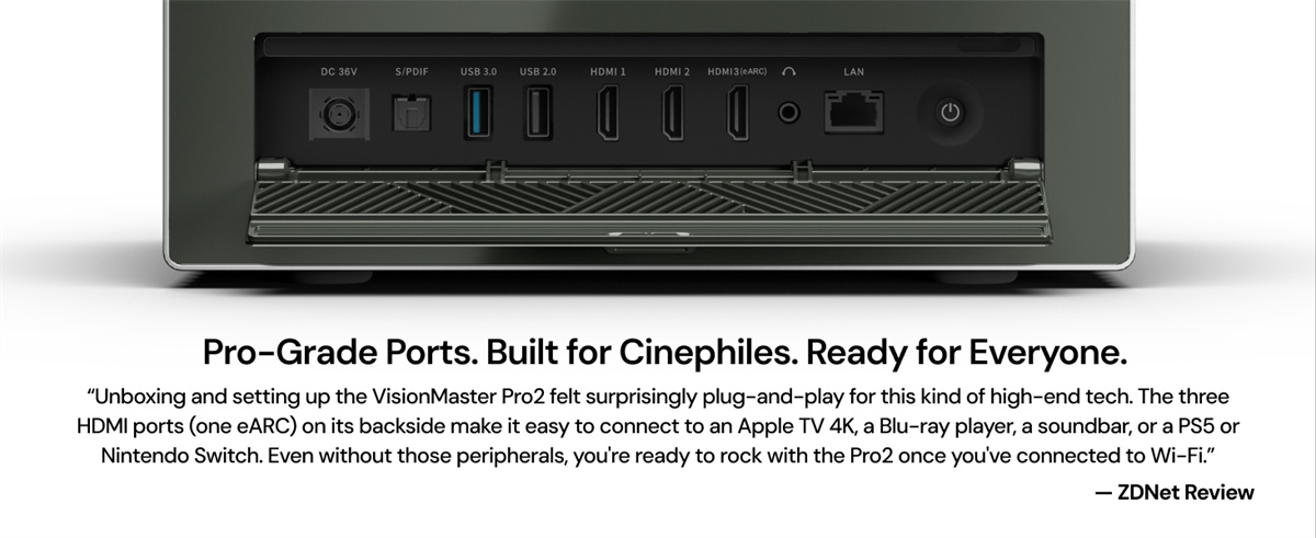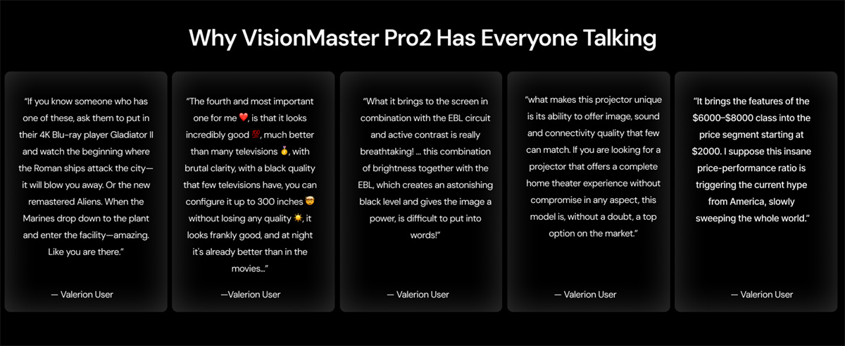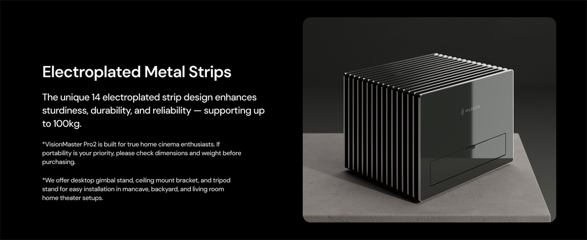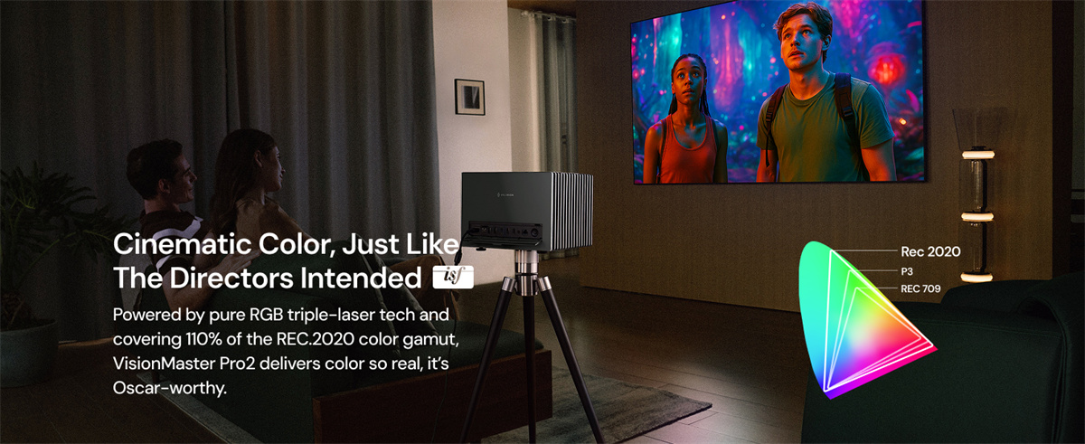 Valerion VisionMaster Pro 2 on RGB-kolmoislaseria käyttävä 4K UHD -projektori, joka tarjoaa elokuvatasoisen kuvanlaadun, nopeat pelitilat ja laajat kuvasuhteet jopa 300'' kuvakokoon. Se tukee huippuluokan HDR- ja ääniformaatteja sekä integroituu sujuvasti älykotiin.