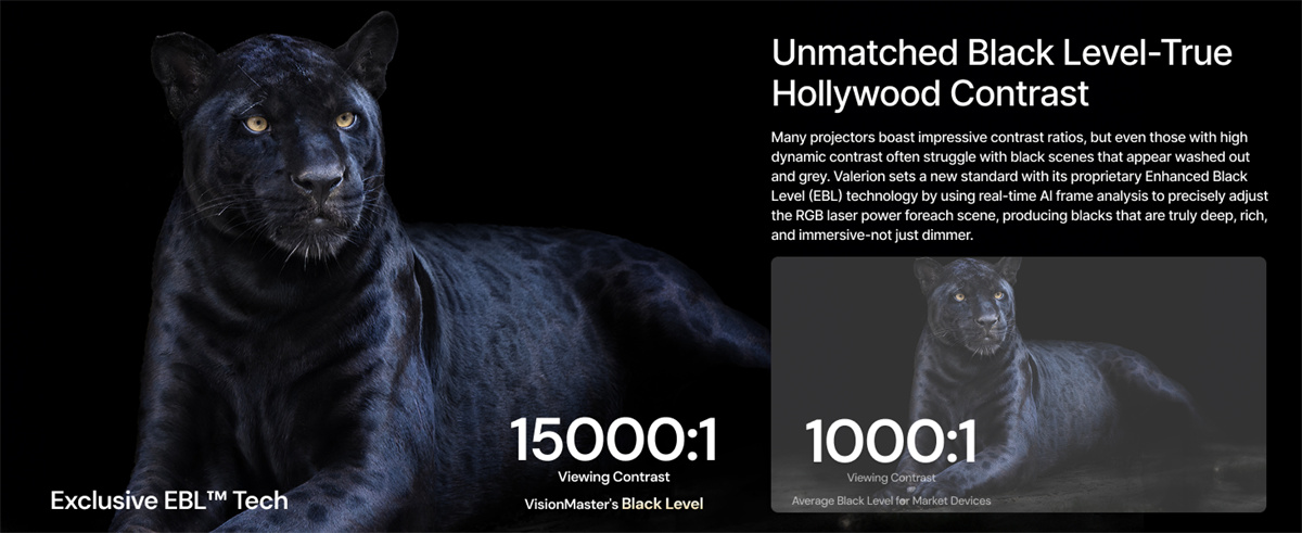 1. Kehittynyt kontrasti: 15000:1 ja parannettu mustan taso elokuvamaisiin kuviin.