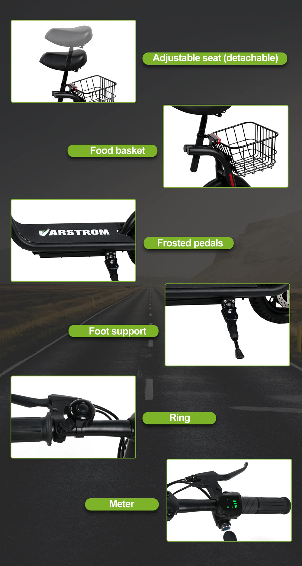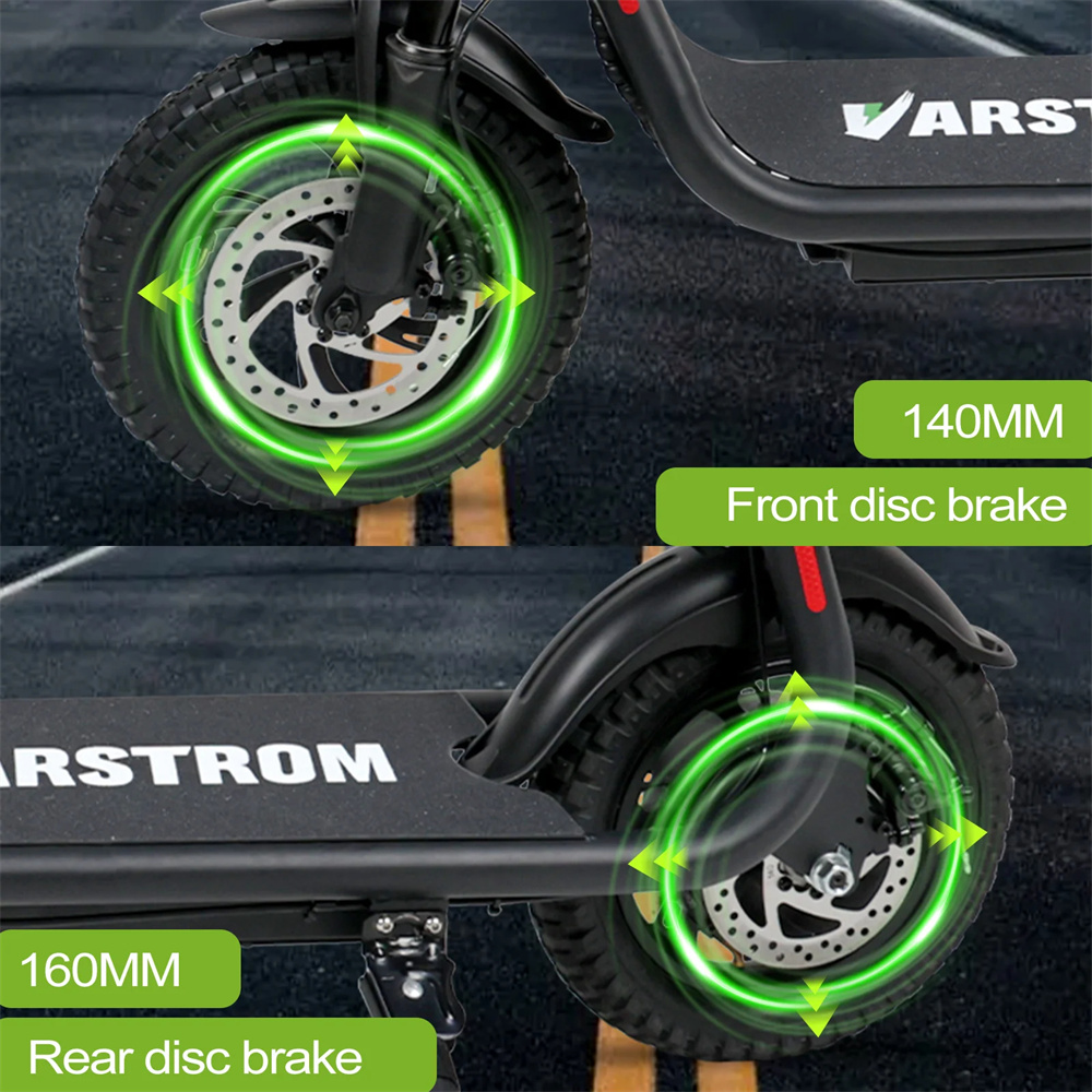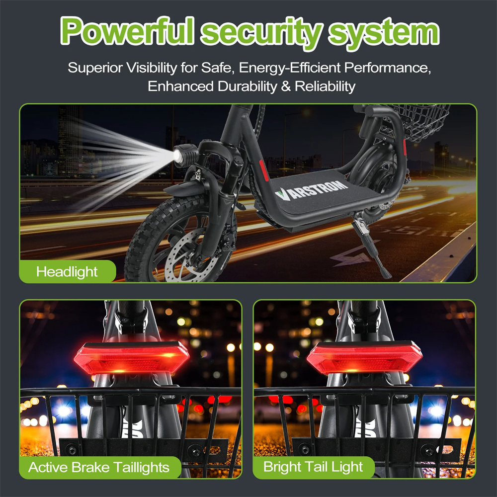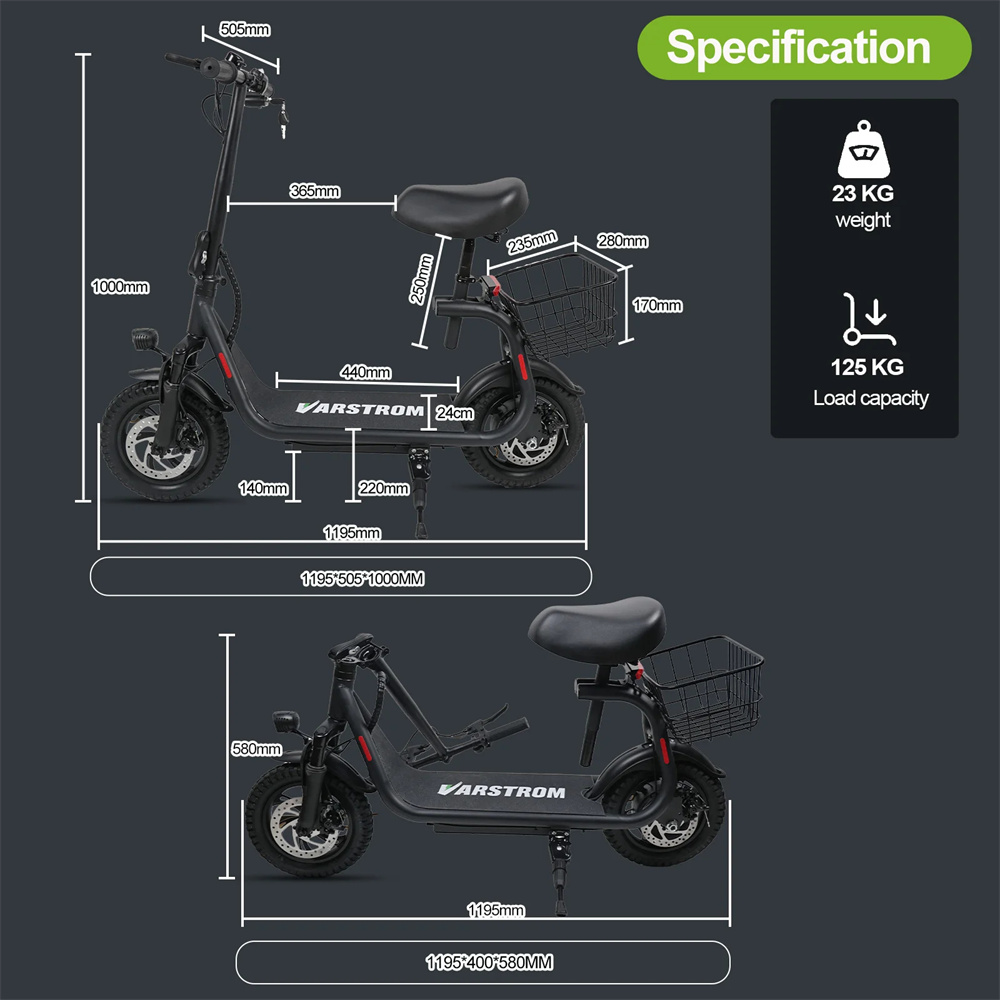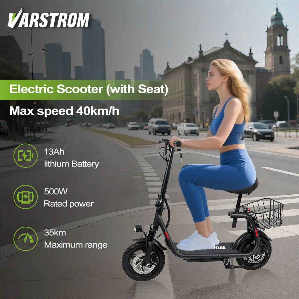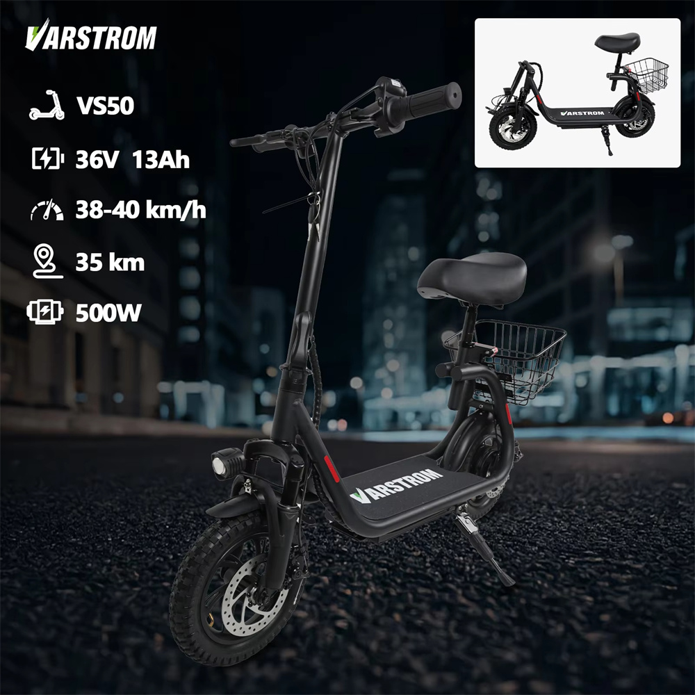 VARSTROM VS50 on tukeva, istuimella varustettu sähköpotkulauta kaupunkiin. 500W moottori, 12-tuumaiset renkaat ja etu- sekä takalevyjarrut tuovat ripeää etenemistä ja hallittavuutta. IP54-roiskevesisuojaus ja LCD-näyttö helpottavat päivittäistä käyttöä.