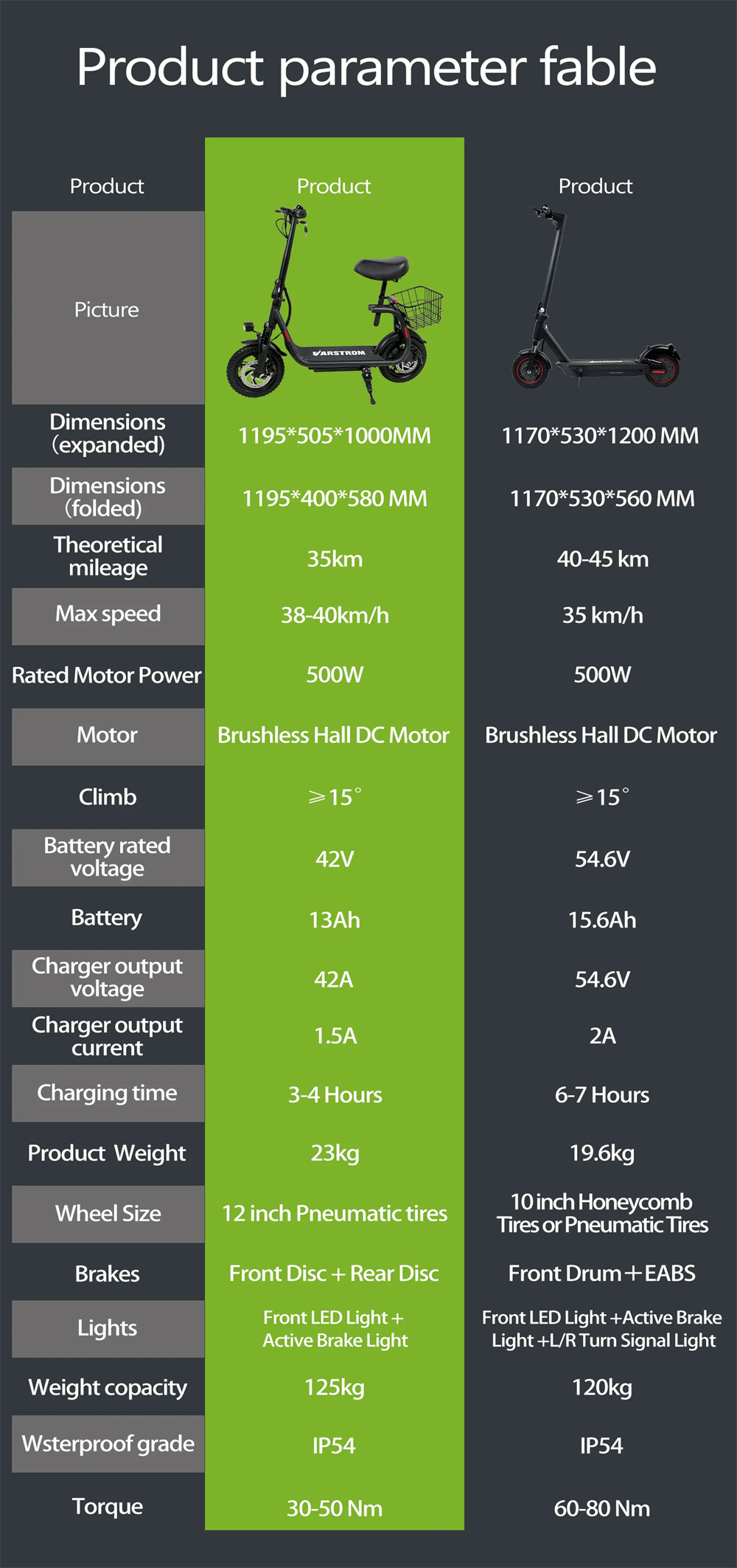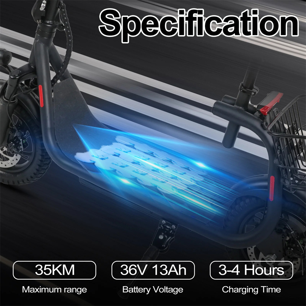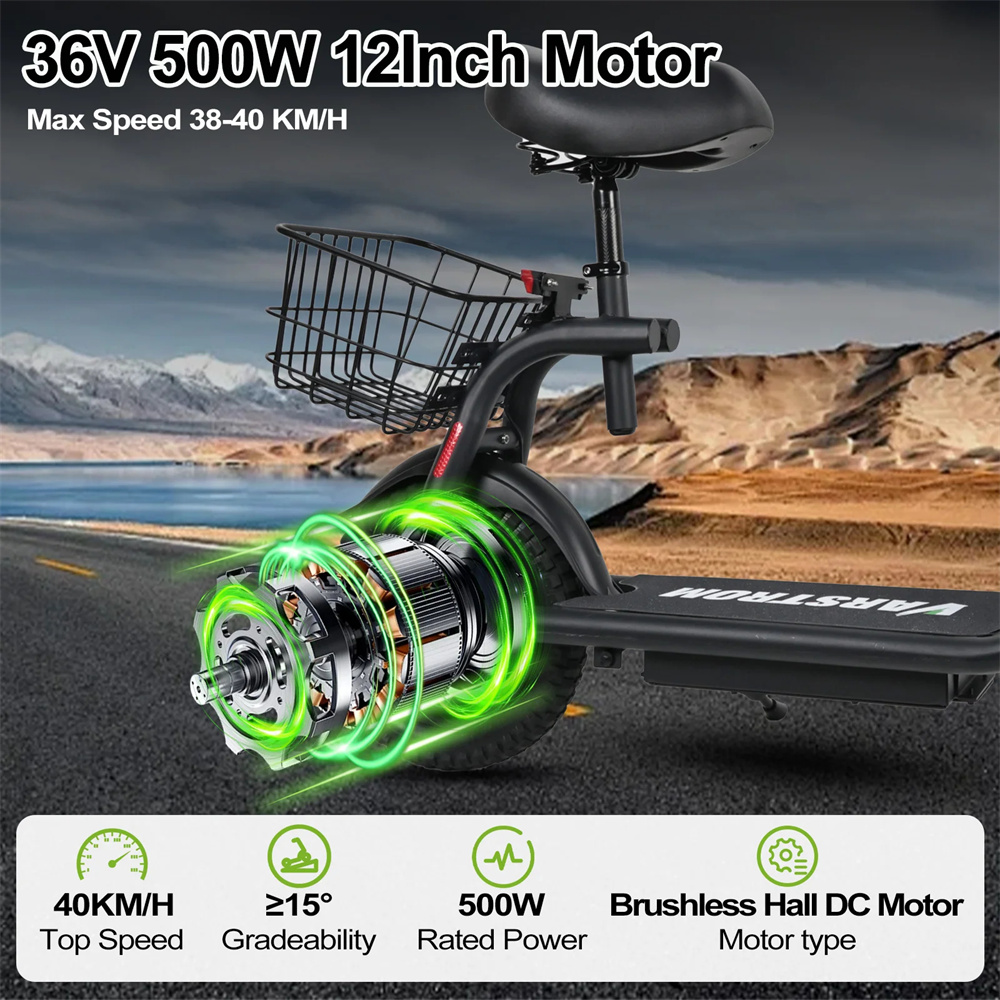 Sähköpotkulauta istuimella, 500W moottori, max 40 km/h, noin 35 km toimintasäde, taittuva, 12" renkaat, IP54, lataus 3–4 tuntia.