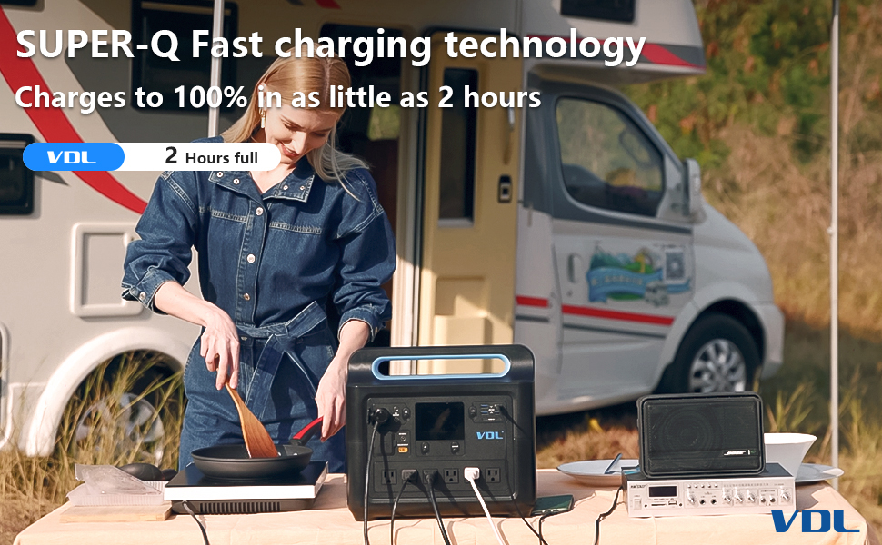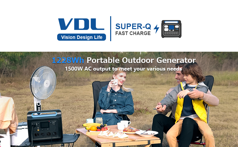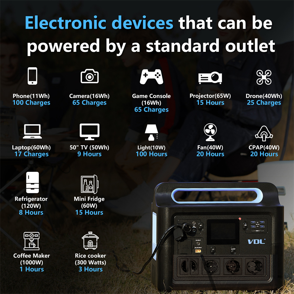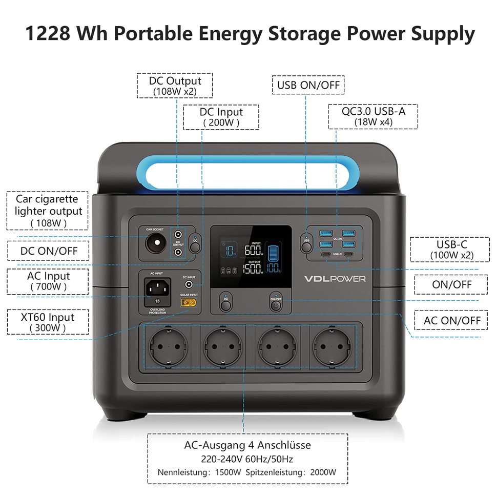 - 1500W / 1228Wh teho ja suuri kapasiteetti: VDL-voimalaitteen kapasiteetti on 1228Wh ja jatkuva teho 1500W, mikä riittää useimmille kodinkoneille, yleiselektroniikalle ja tarvikkeille.