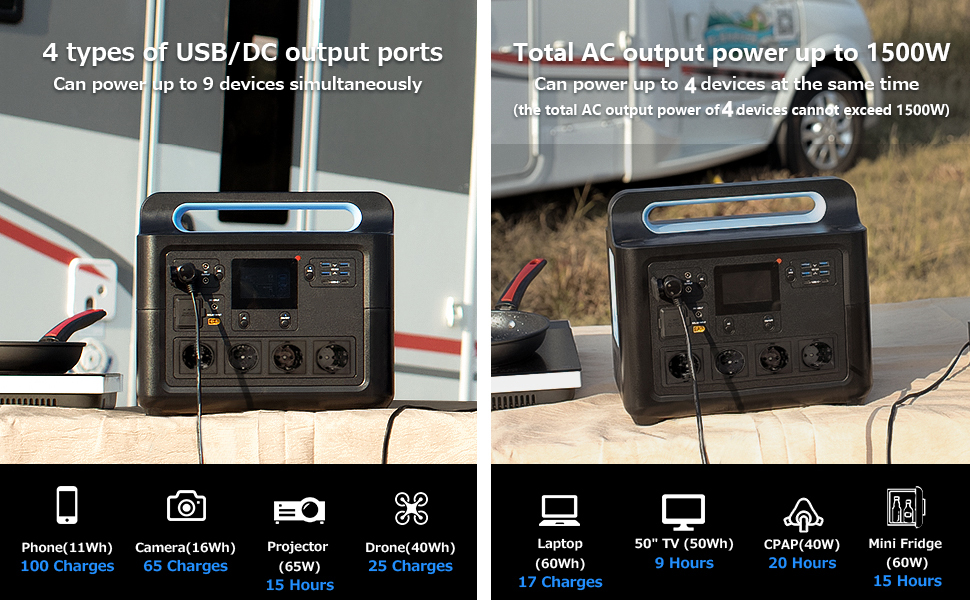 - Laaja käyttö: 1500W (2000W huippu) -teholla ja 1228Wh kapasiteetilla laitteessa on 4 puhdasta siniaaltoa tuottavaa AC-pistorasiaa. Se syöttää virtaa esimerkiksi televisiolle, minijääkaapille, sähkög rillille, tuulettimelle ja muille tarpeillesi kotona ja ulkona.